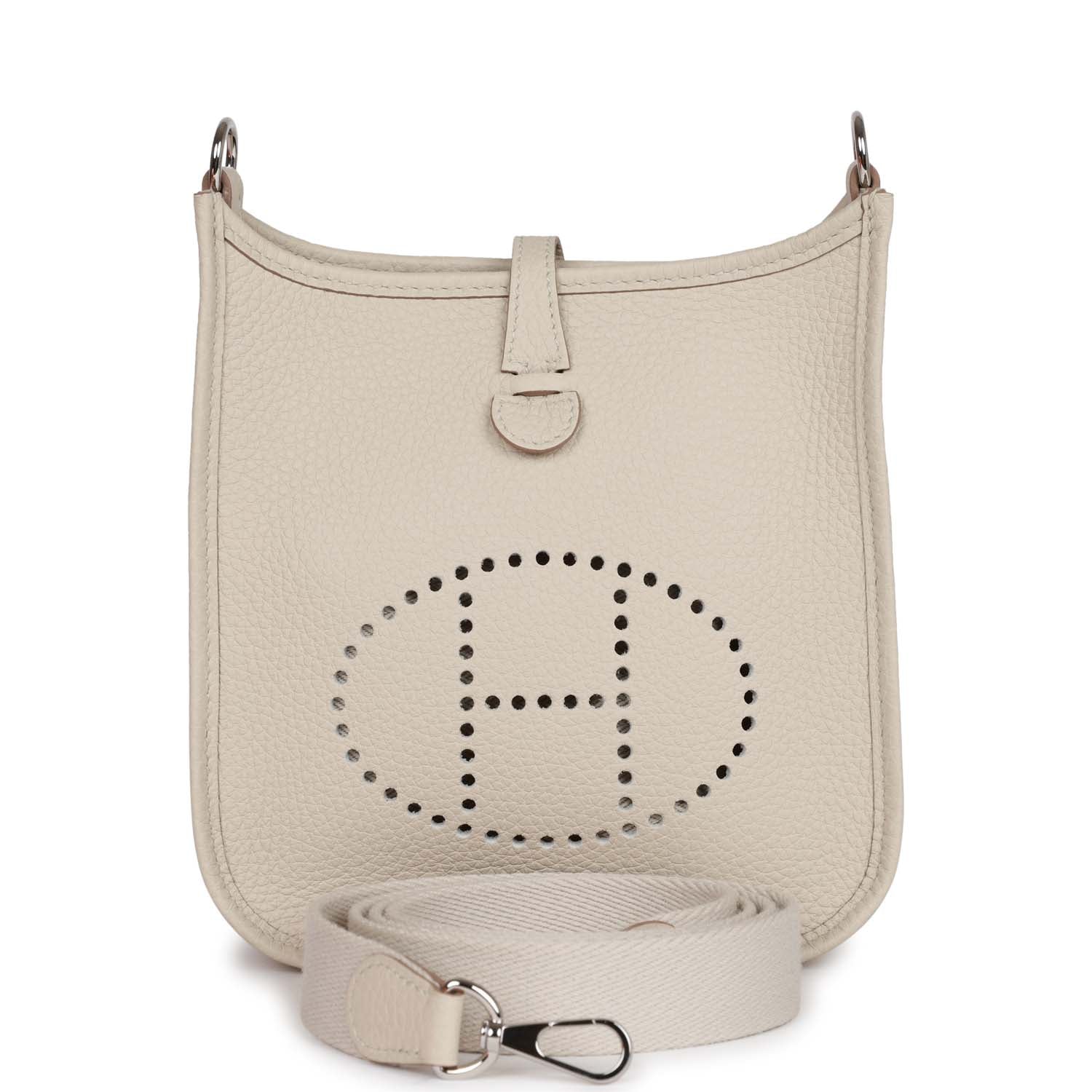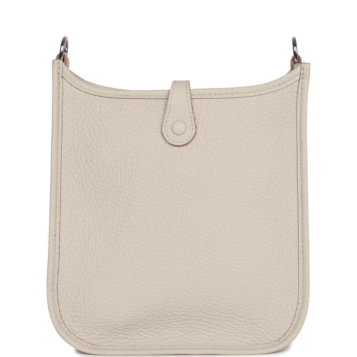 This Evelyne is in Beton clemence leather with palladium hardware and has tonal stitching, pull tab top closure and beton removable canvas and leather shoulder/crossbody strap.