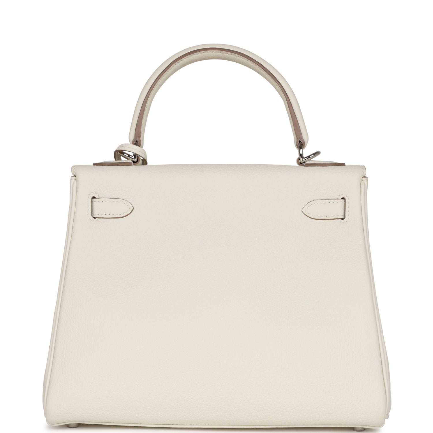 This Kelly, in the Retourne style, is in Mushroom togo leather with palladium hardware and has tonal stitching, two straps with front toggle closure, clochette with lock and two keys, single rolled handle and removable shoulder strap.
