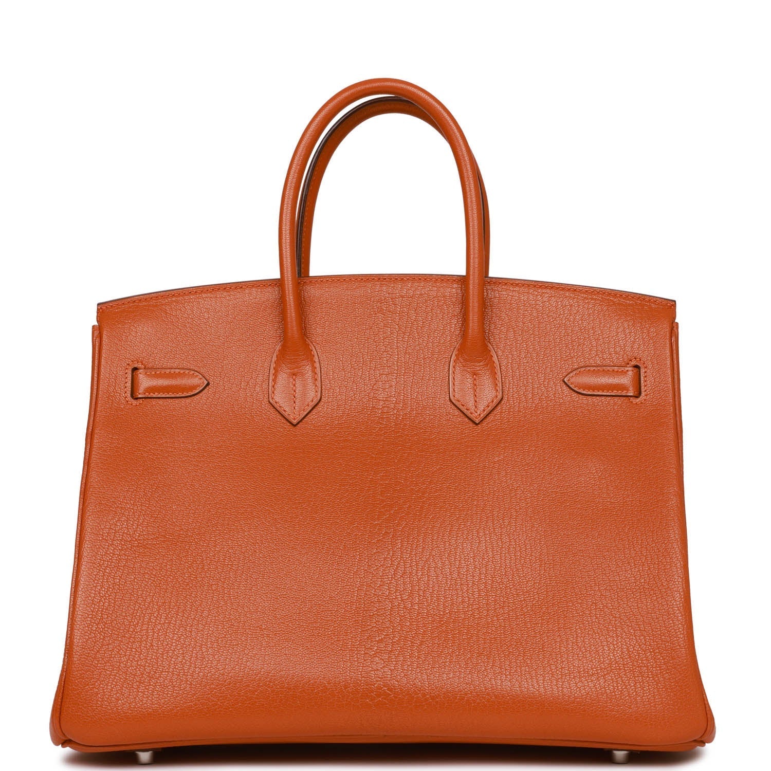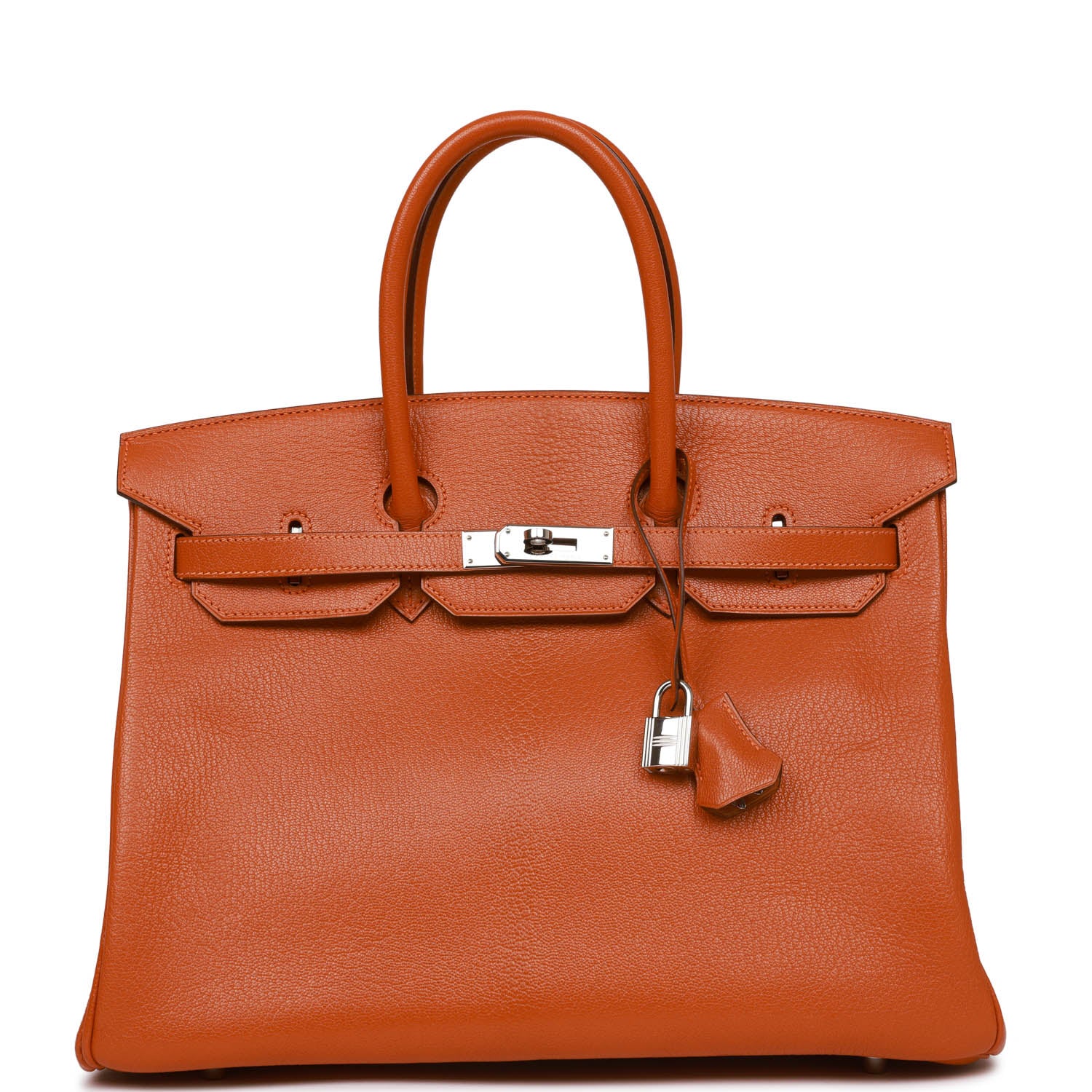 This Birkin is in Potiron chevre leather with palladium hardware and has tonal stitching, front flap, two straps with center toggle closure, clochette with lock and two keys, and double rolled handles.