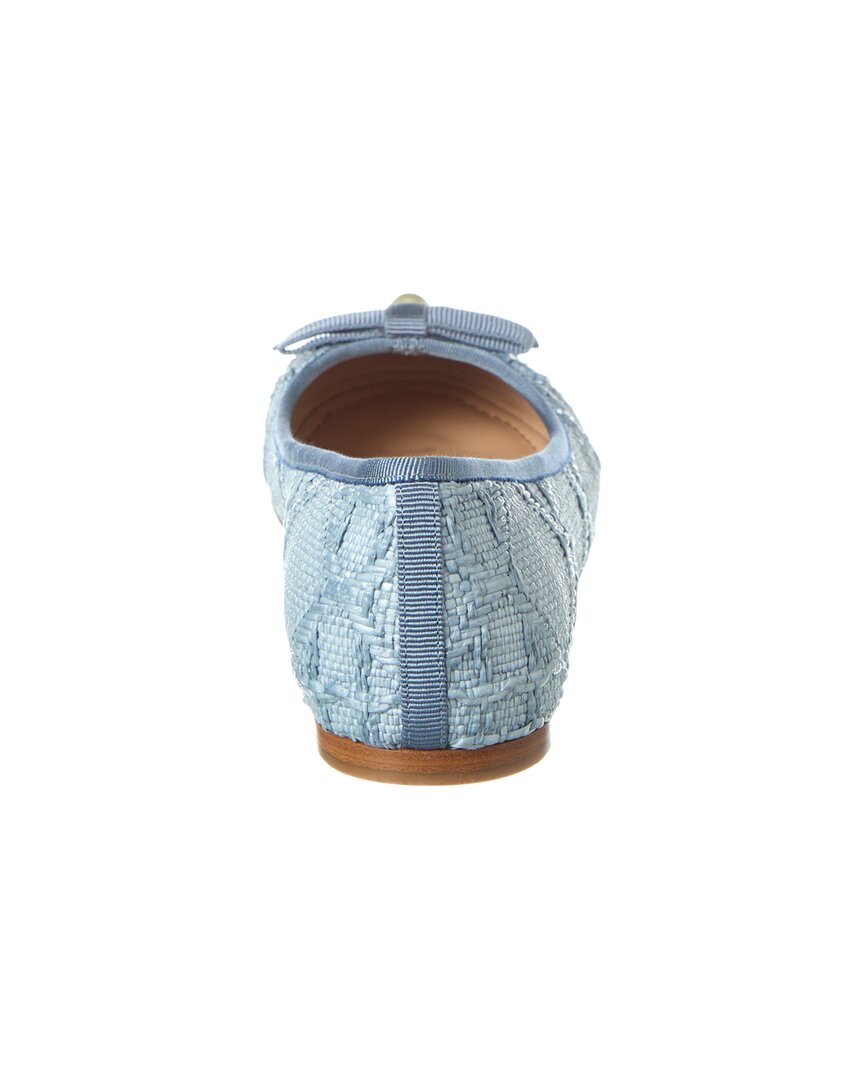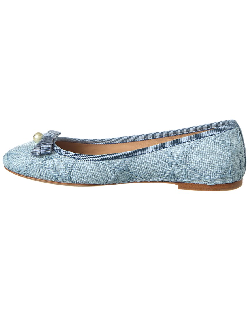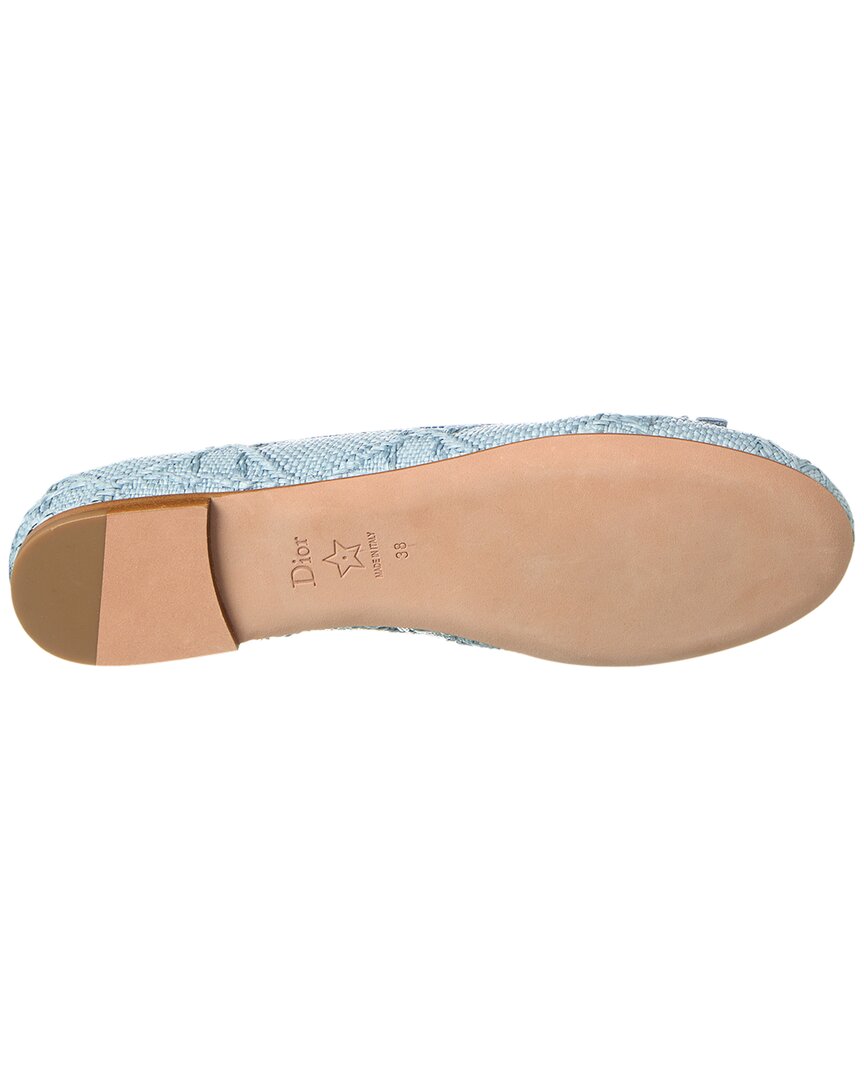 Introducing the 'Dior Ballet Flat' in blue woven fabric with silver-tone hardware from the iconic brand Dior. These elegant flats feature a logo pearl and grosgrain bow, along with a lightly padded leather insole for added comfort. Made in Italy with a smooth leather sole, these ballet flats are the perfect combination of style and sophistication. Please note that size selections are European, so be sure to reference the size chart for US conversions. Rest assured that our products are , sourced from trusted independent suppliers to . Elevate your shoe collection with these timeless French luxury flats from Dior.