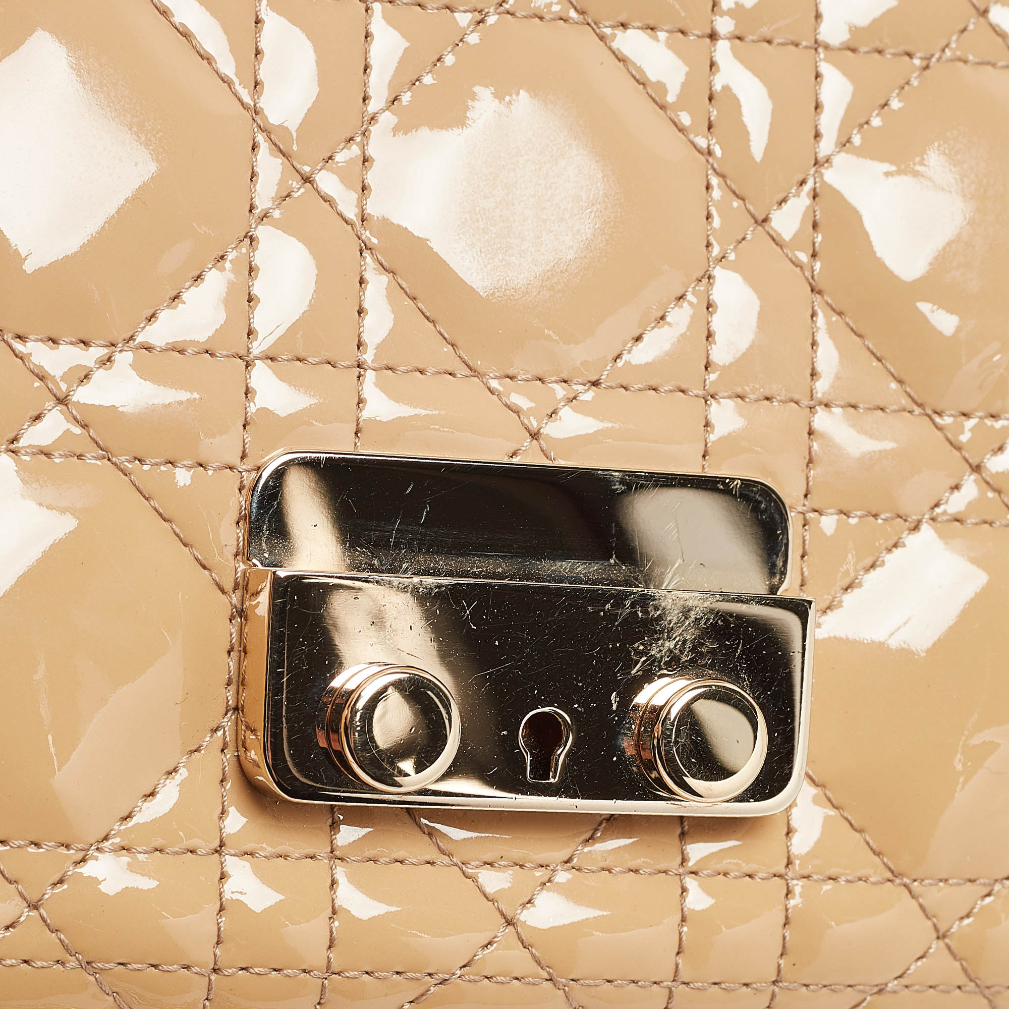 Trust this Dior chain pouch bag to be light durable and comfortable to carry. Crafted from patent leather it comes in a beige hue with the Cannage quilt on the exterior.