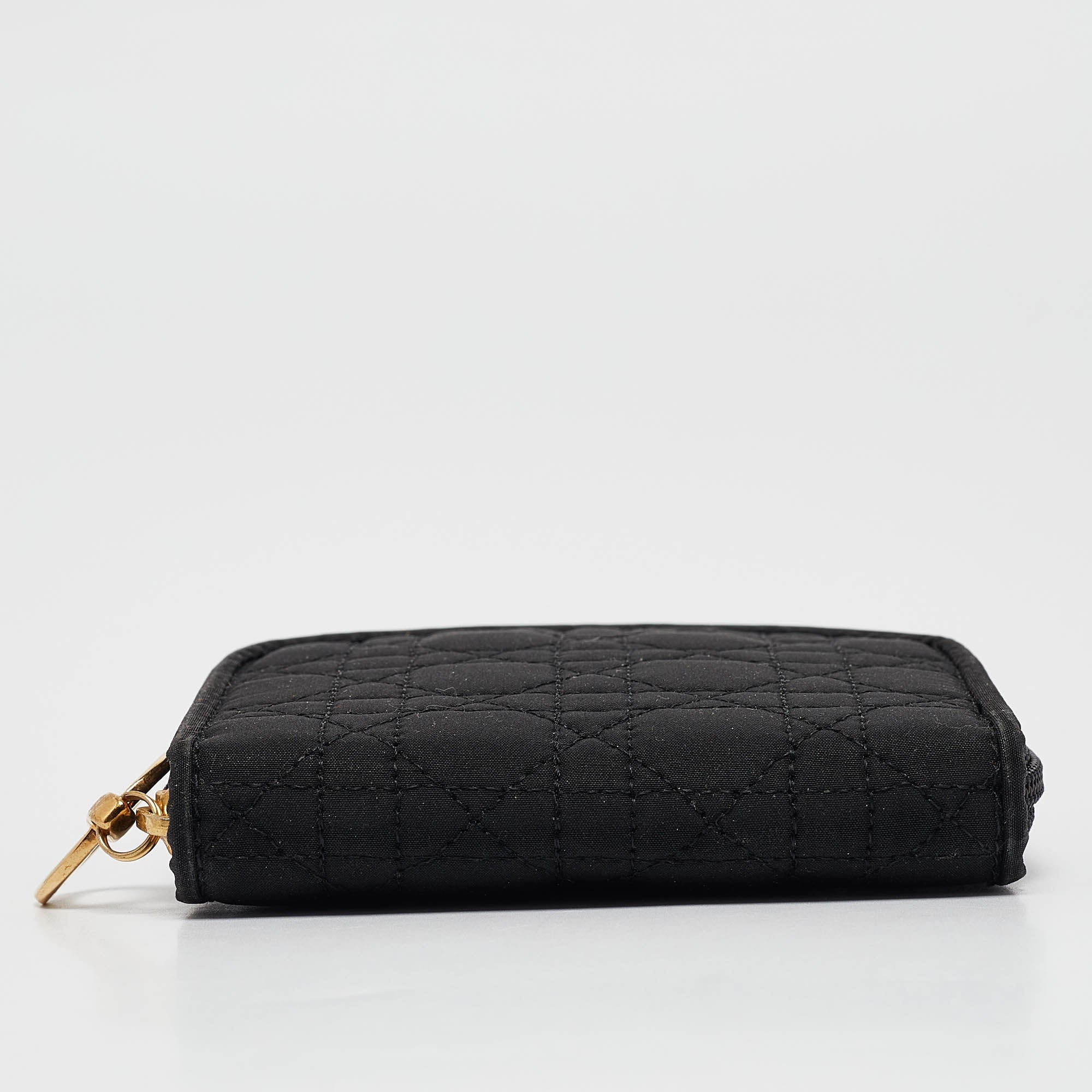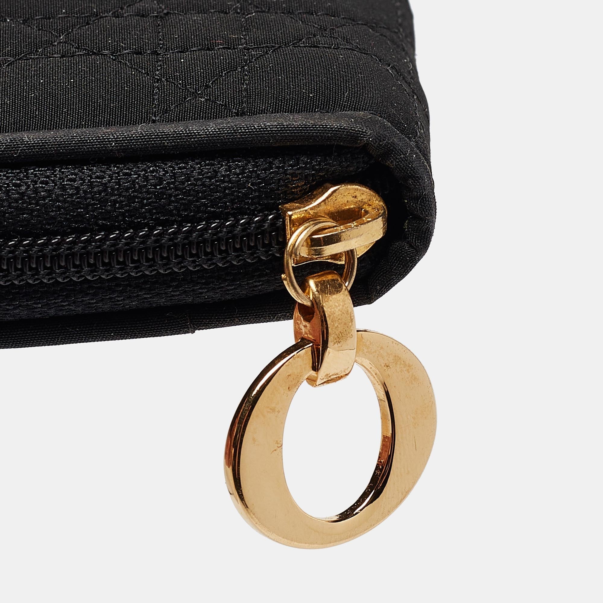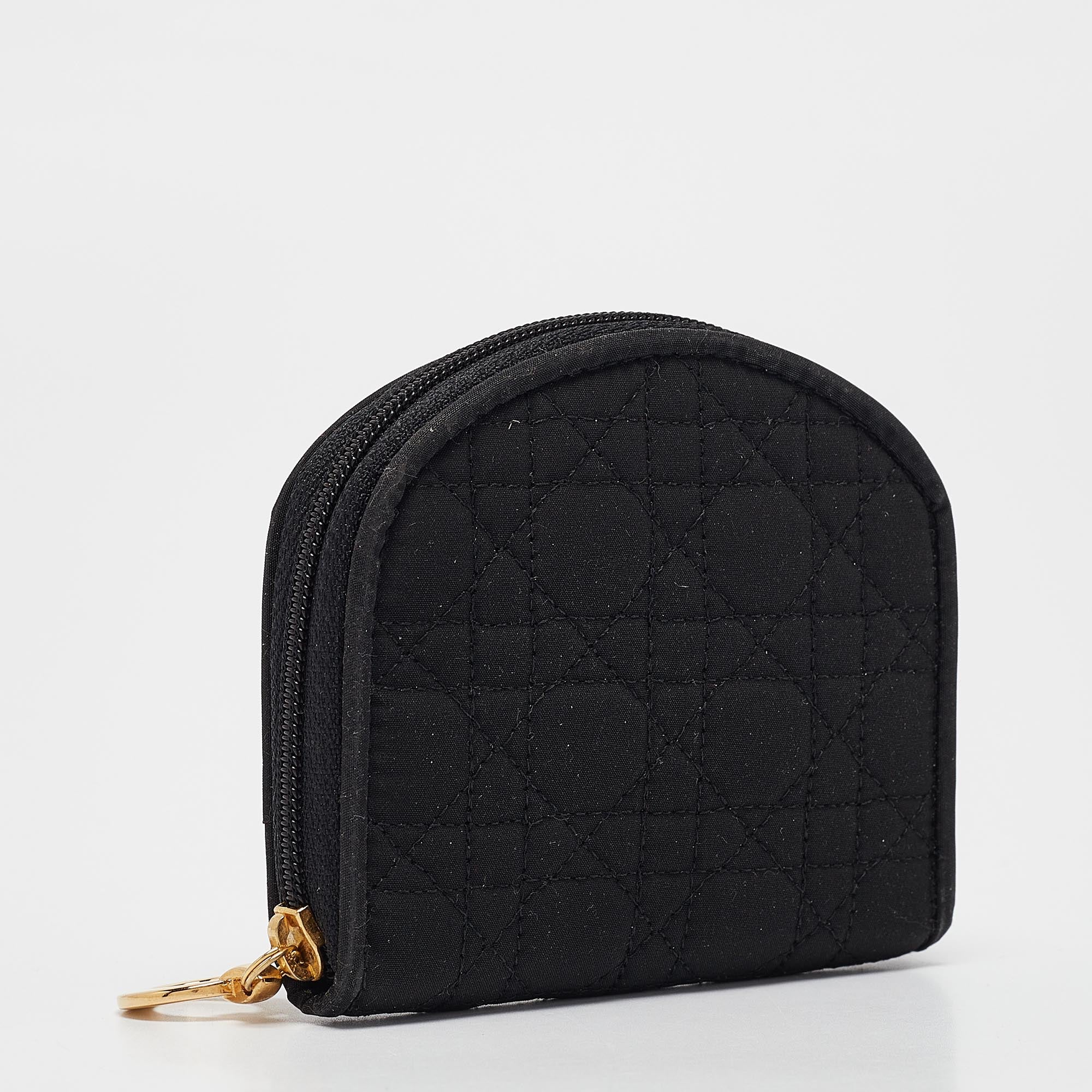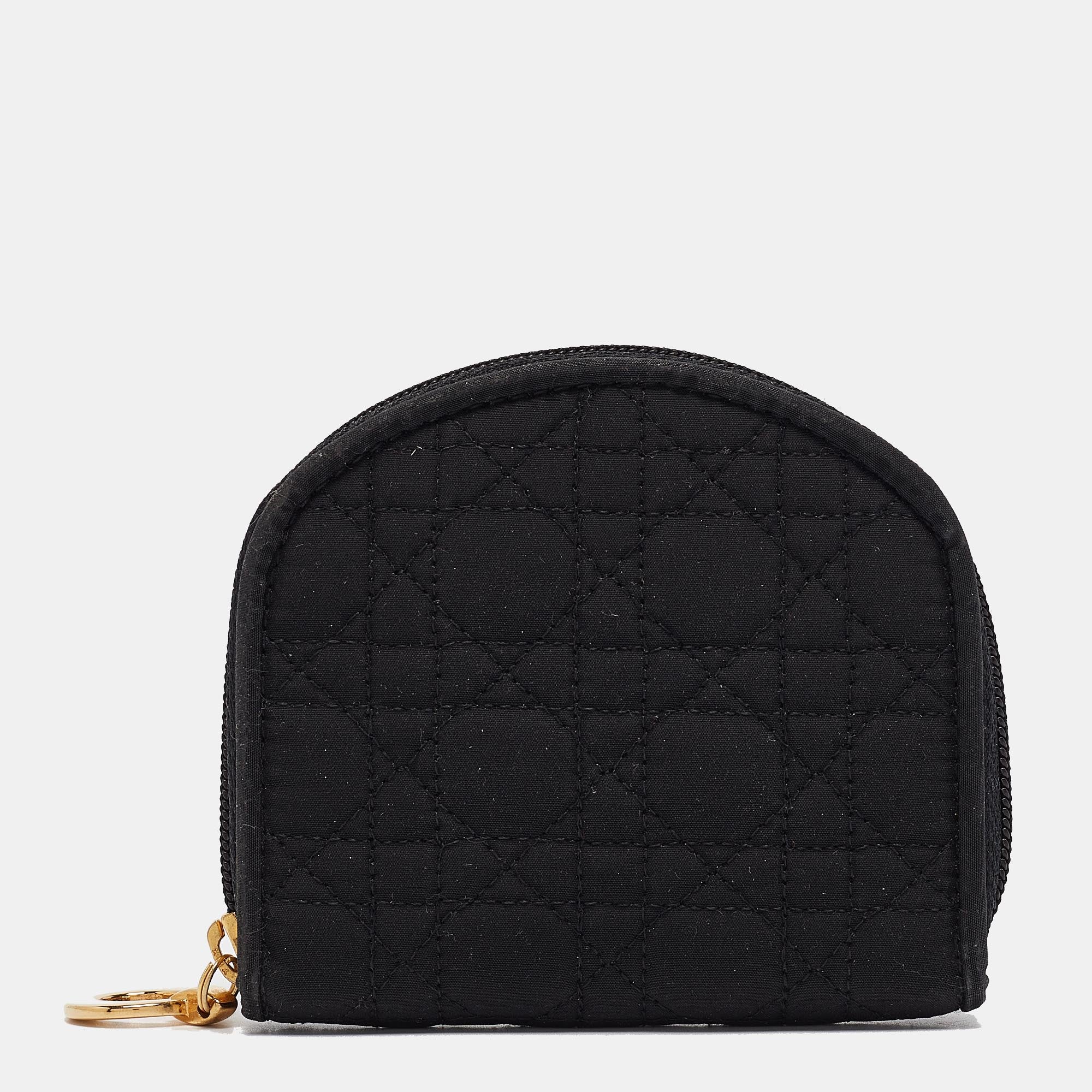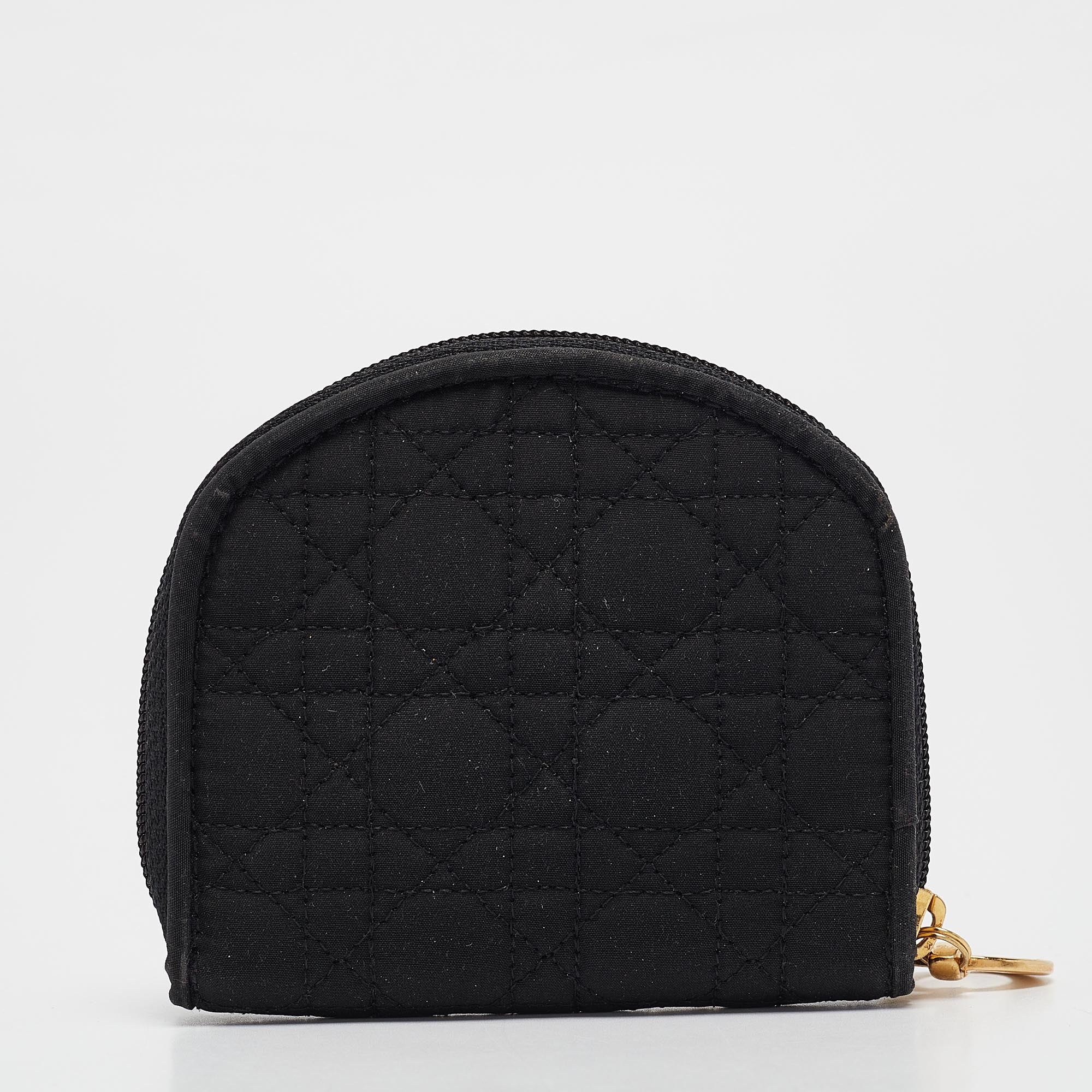 Crafted from fabric this Dior coin pouch has a beautiful cannage exterior and a wide gold tone zipper. It comes with a cute shape and two compartments. This black piece can easily fit into your handbags.