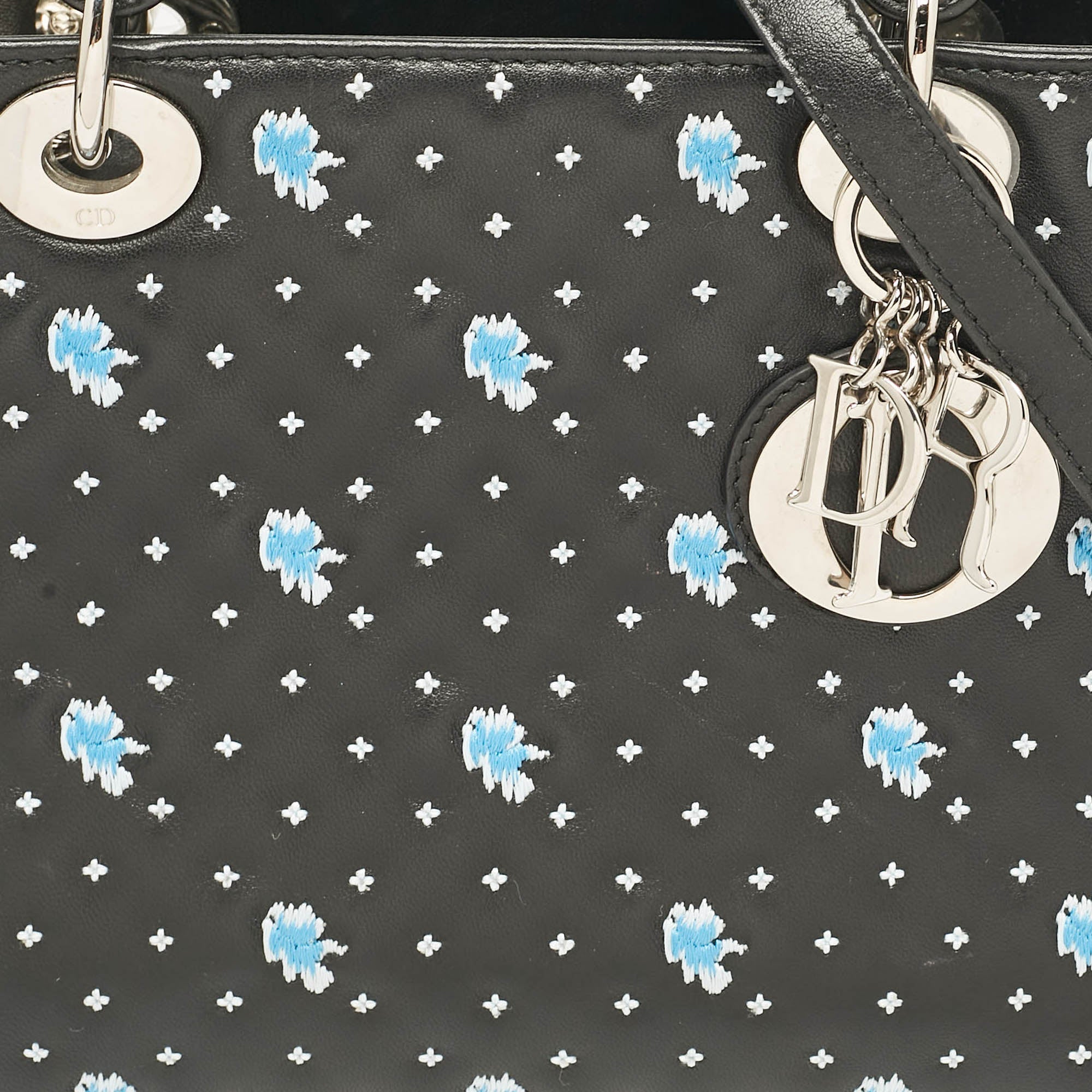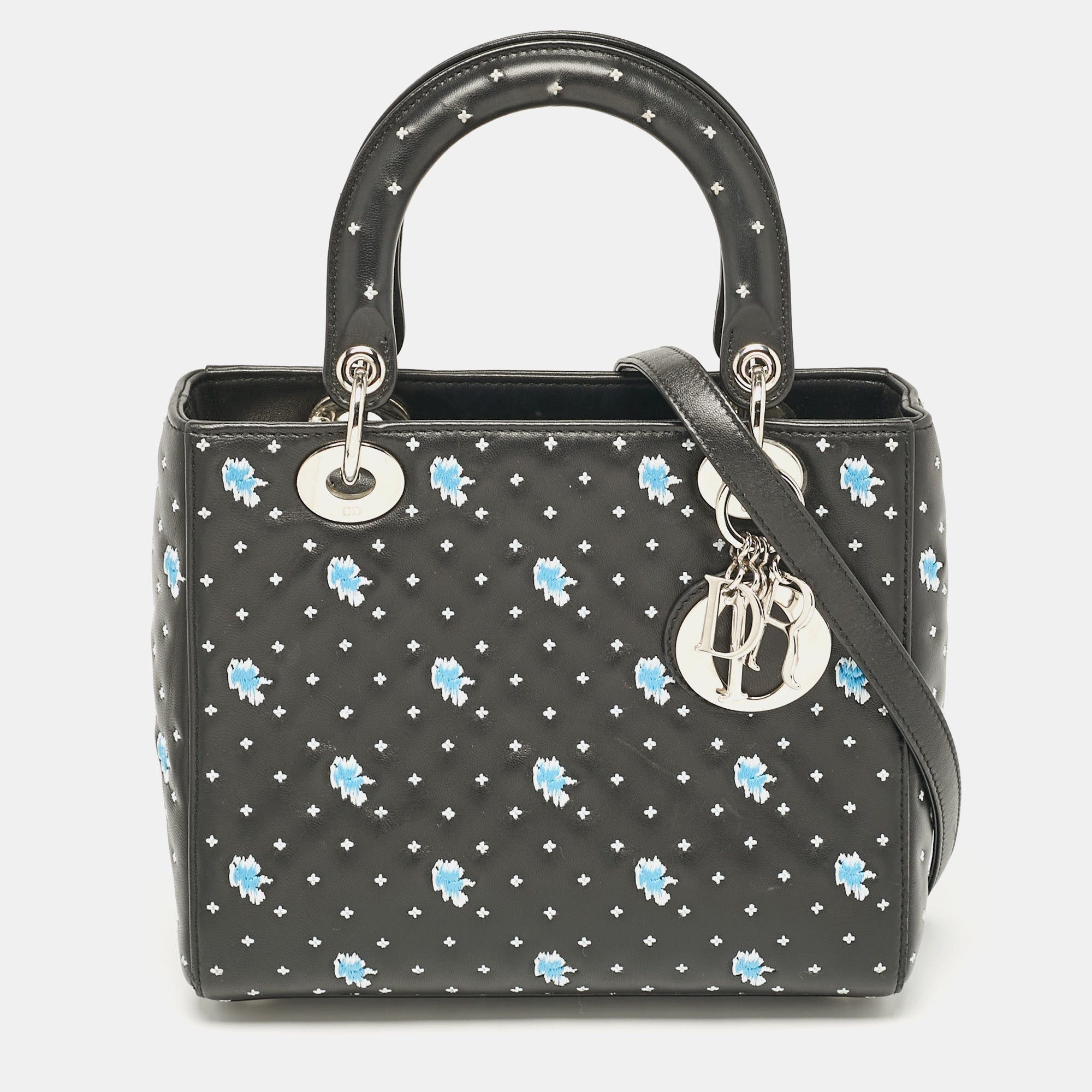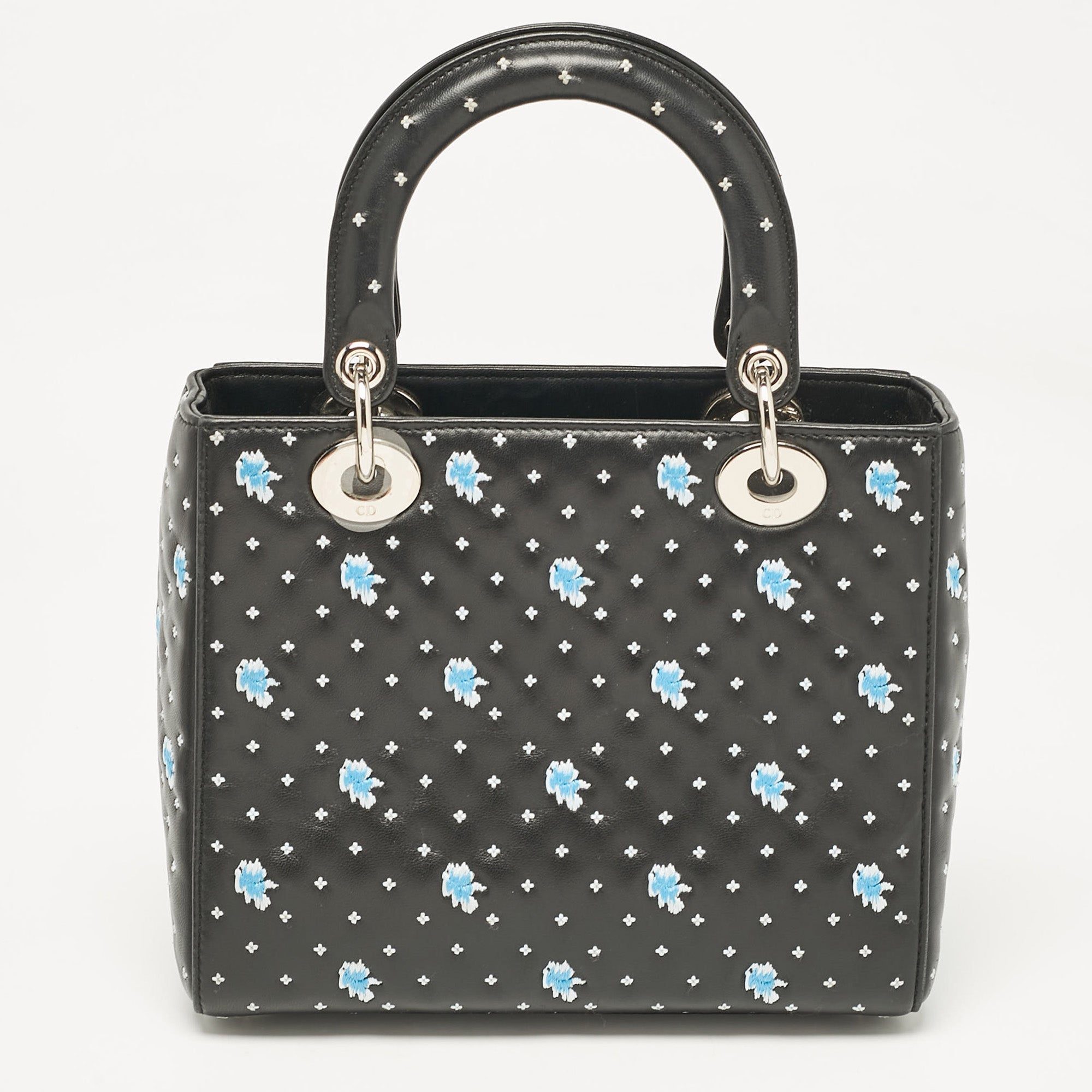 Due to detailed and innovative designs Dior has managed to be at the top of fashions hierarchy through the years. Infuse the signature aesthetics of the brand into your outfit by accessorizing it with this Lady Dior tote. With a classic design it is crafted from leather with a striking embroidery detailing and the brands letter charms mark its quality craftsmanship. The double handles at the top a chain link and its perfectly sized interior make it a functional companion for your next soiree.