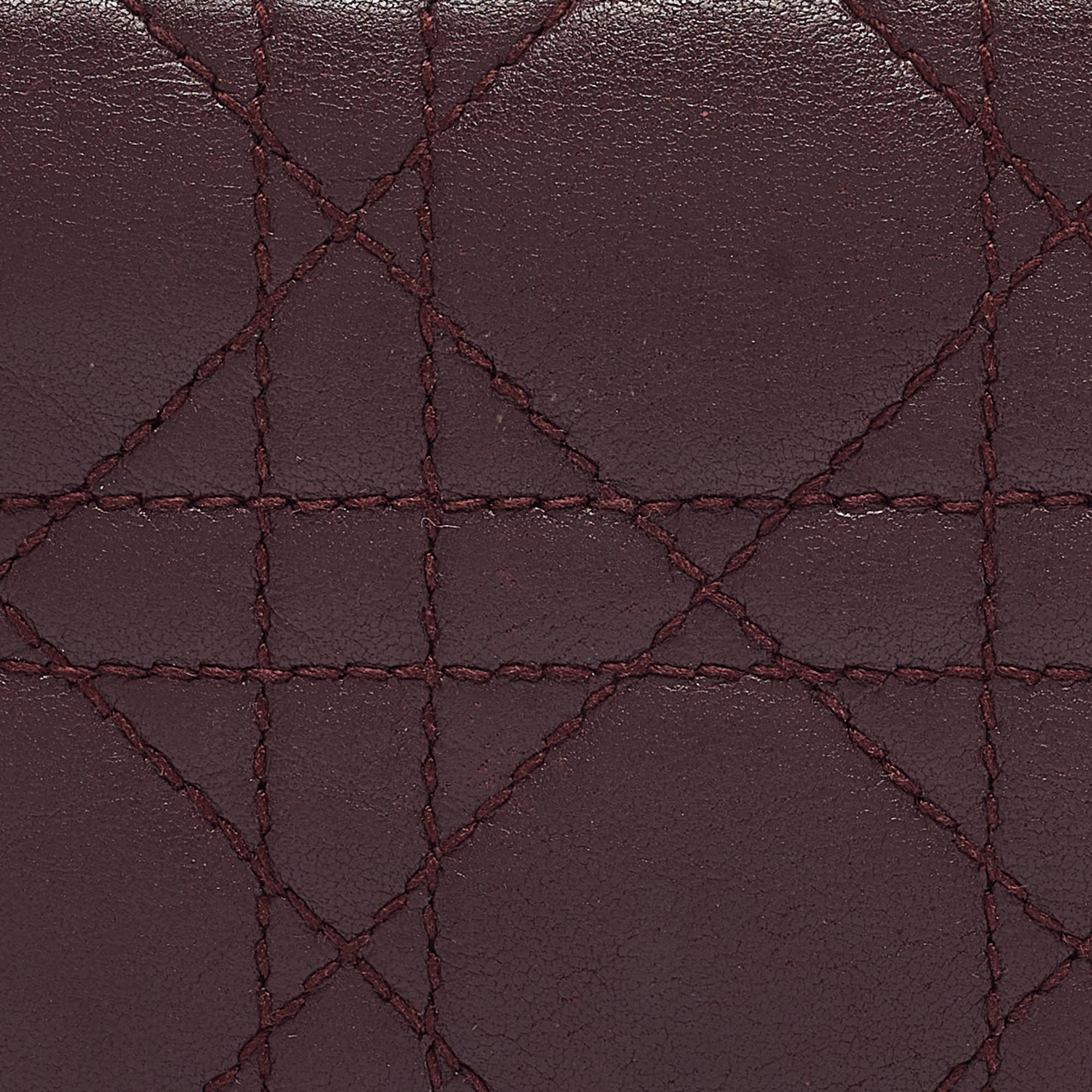 Infuse the signature aesthetics of the brand into your outfit by accessorizing it with this Lady Dior card holder. With a classic design it is crafted from leather with a striking Cannage pattern and the brands letter charms mark its quality craftsmanship. The leather and fabric interior of this burgundy creation is divided into different compartments.