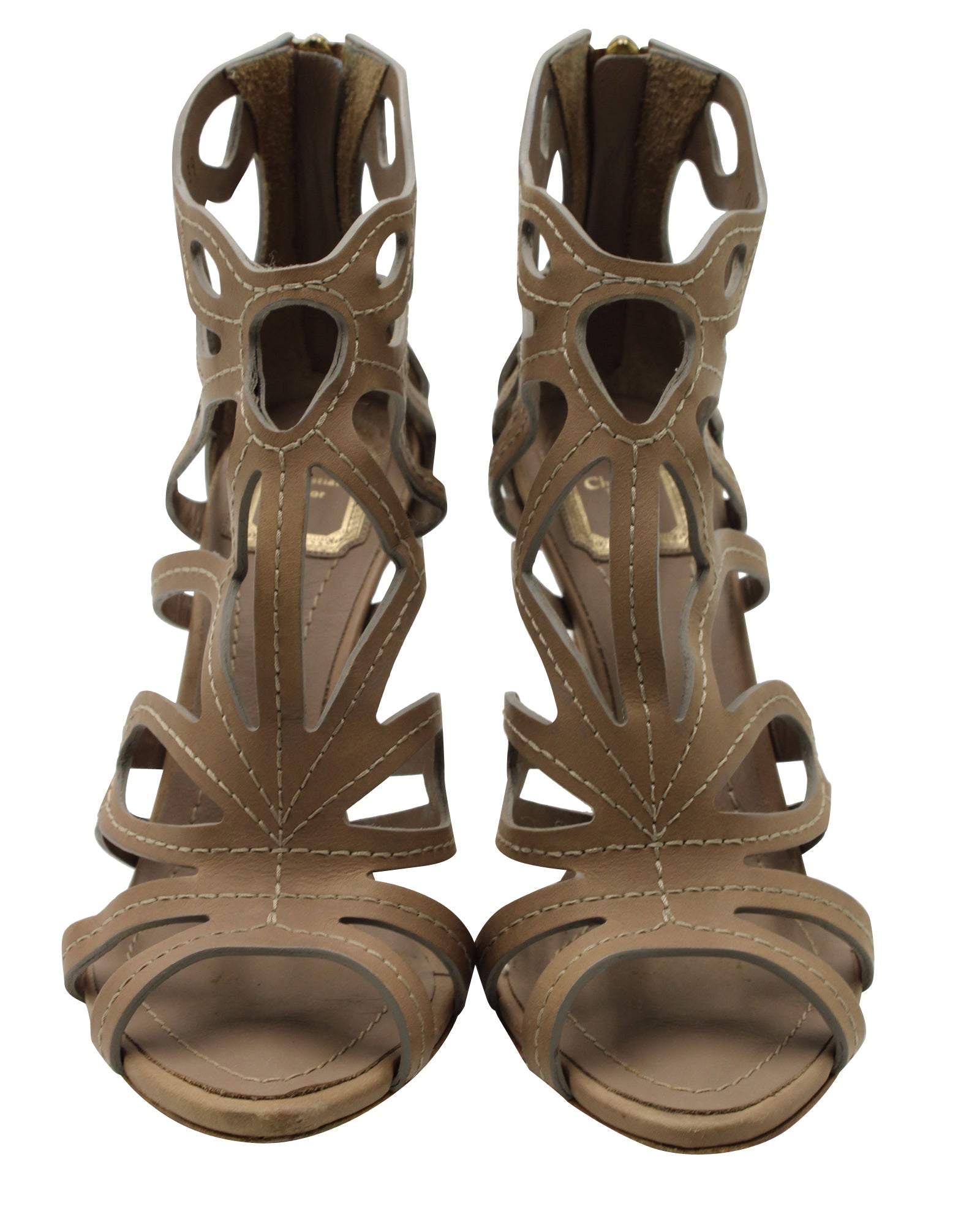 Opt for a unique style this season with these caged Dior sandals. Designed in a brown leather with cut out designs. These sandals are set on a comfortable, high heel and finished with a zippered closure at the rear. It makes a great combination to summer dresses.Dior Caged High Heel Sandals in Brown Leather Condition - Good, with dust bag Sign of wear - Moderate wear on soles, fair creasing of leather Size - EU 39/US 8.5Color - Brown Material - Leather SKU - 153142