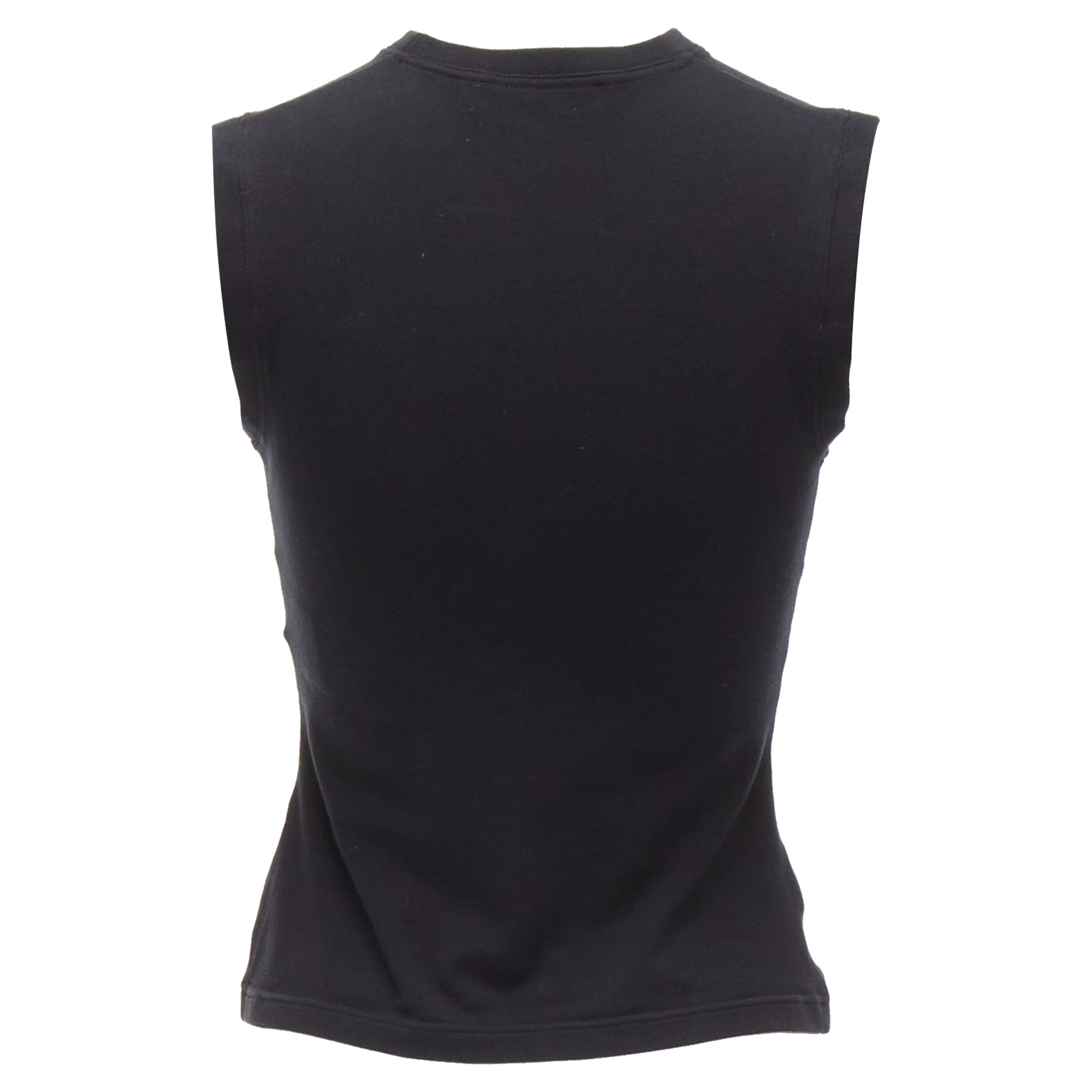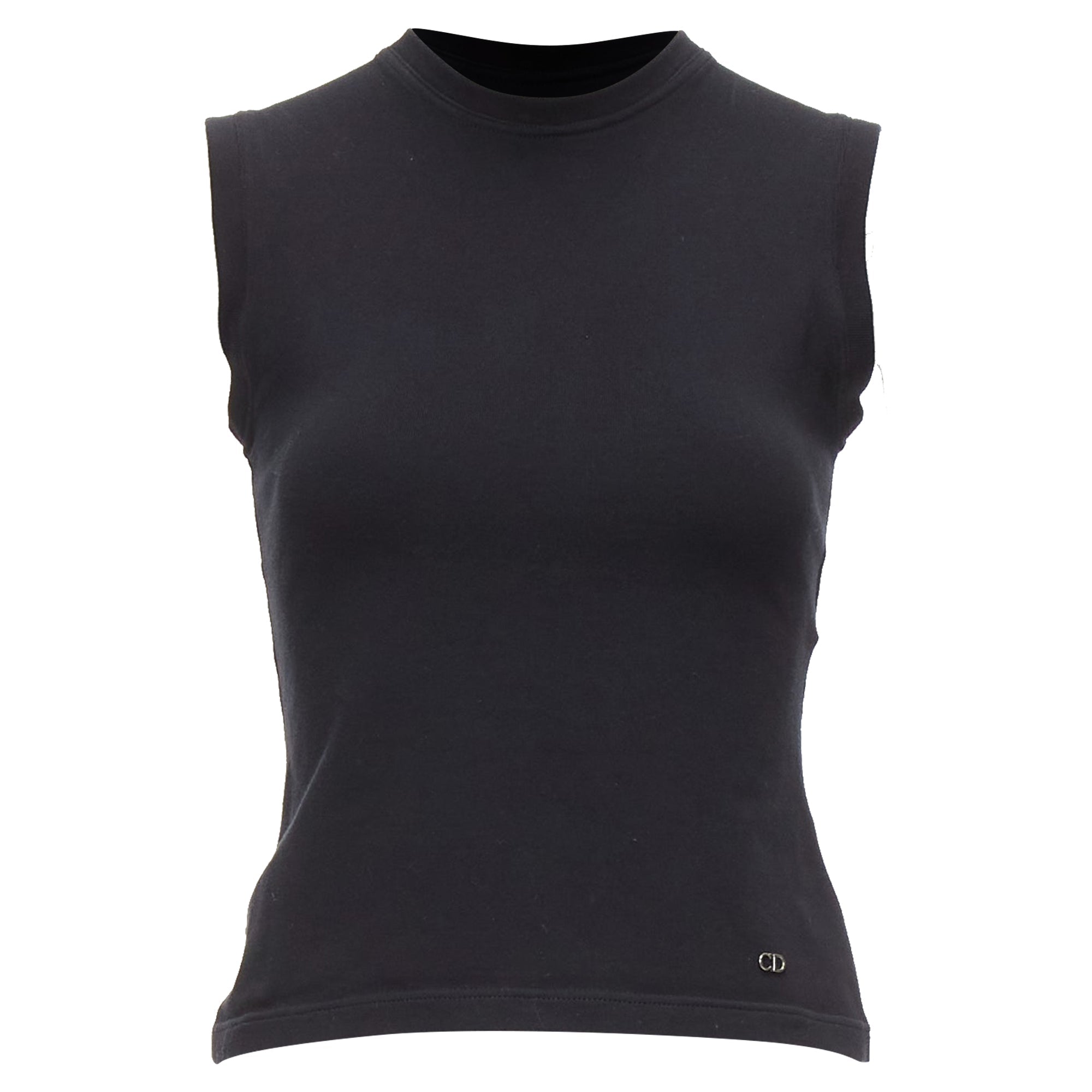DIOR black cotton silver CD logo plate sleeveless crew neck tank top FR36 SReference - AAWC/A01114Brand - DiorMaterial - Cotton, BlendColor - Black, SilverPattern - SolidClosure - PulloverExtra Details - CD logo at left hem.Made in - ItalyCONDITION - Condition - Very good, this item was and is in very good condition. Please refer to image gallery for thorough condition check. Hanger marks at left shoulder and back top.Comes with - Style code present (Generic) SIZINGDesigner size - FR36Size reference - US2-4 / UK8 / IT40 / FR36 / XS-SMEASUREMENTS - Shoulder to shoulder - 32.5cm / 12.7"Chest - 37cm / 14.4"Waist - 33cm / 12.9"Length - 50cm / 19.5"Measurments - length - 500 mm