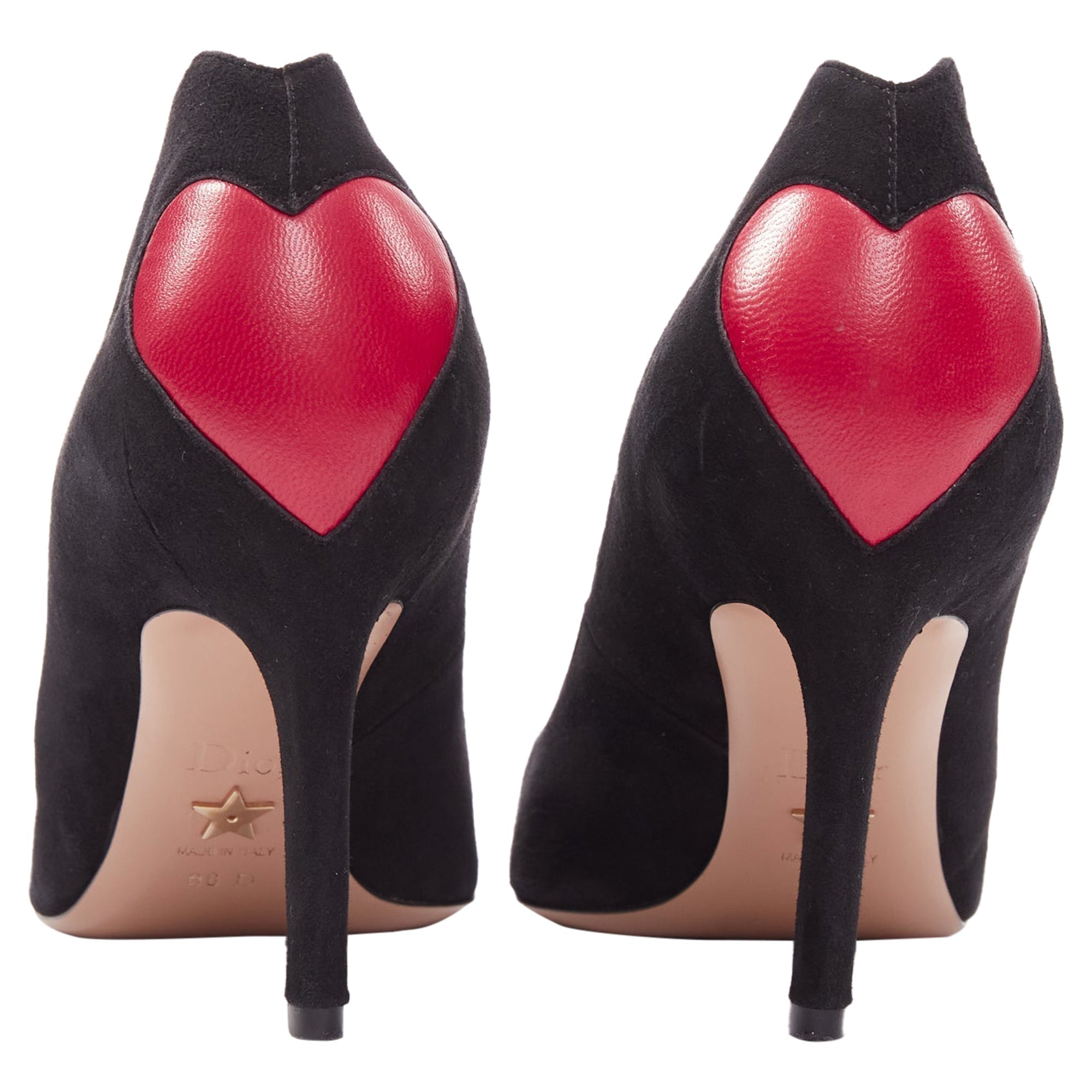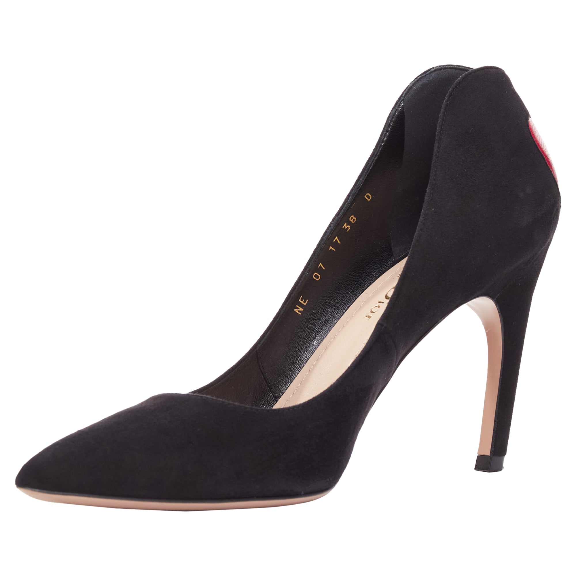 DIOR Dioramour red leather heart black suede curved heeled pumps EU38Reference - KEDG/A00302Brand - DiorCollection - DioramourMaterial - Suede, LeatherColor - Black, RedPattern - SolidClosure - Slip OnLining - Nude LeatherExtra Details - Red leather heart detail at back.Made in - ItalyCONDITION - Condition - Very good, this item was and is in very good condition. Please refer to image gallery for thorough condition check. Minor dirty surface on suede leather.Comes with - Style code present (Generic) Two dust bags. SIZINGDesigner size - EU38Size reference - EU38 / US8 / UK5 / JP25.5Measurments -