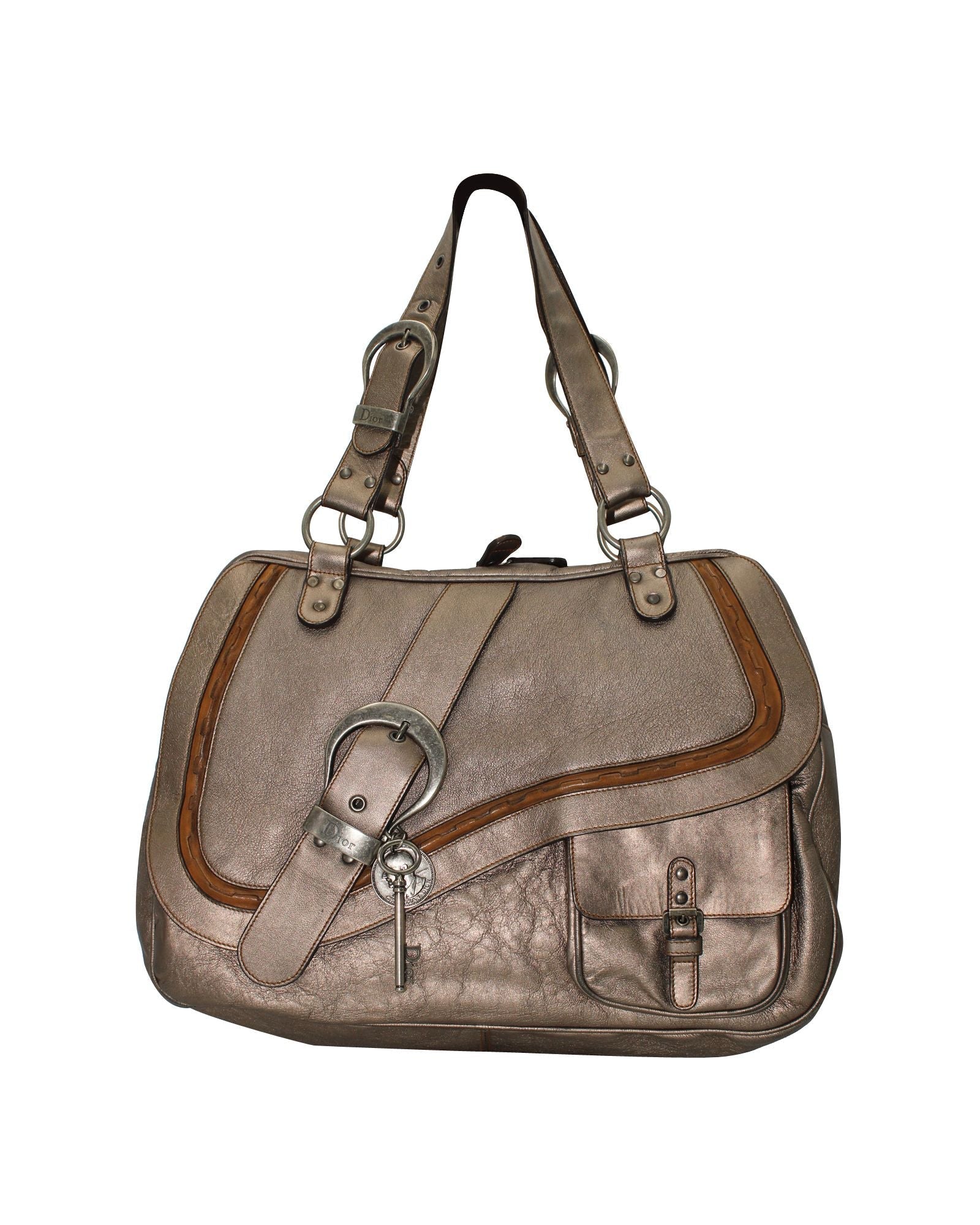 This Gaucho Large Tote Bag is crafted with metallic silver leather and a chunky buckle, along with a medallion and key hardware. The satchel-style features two compartments and is designed with two top handles plus a hidden pocket under the flap. Dior Gaucho Large Tote Bag in Silver Metallic LeatherCondition - Good with dust bagSign of wear - Scuffs, scratches, and discolorationMaterial - LeatherColor - Metallic | SilverDimensions - Length - 440 mmWidth - 200 mmHeight - 300 mmSKU - 340308 / TONBKGBBA301174W