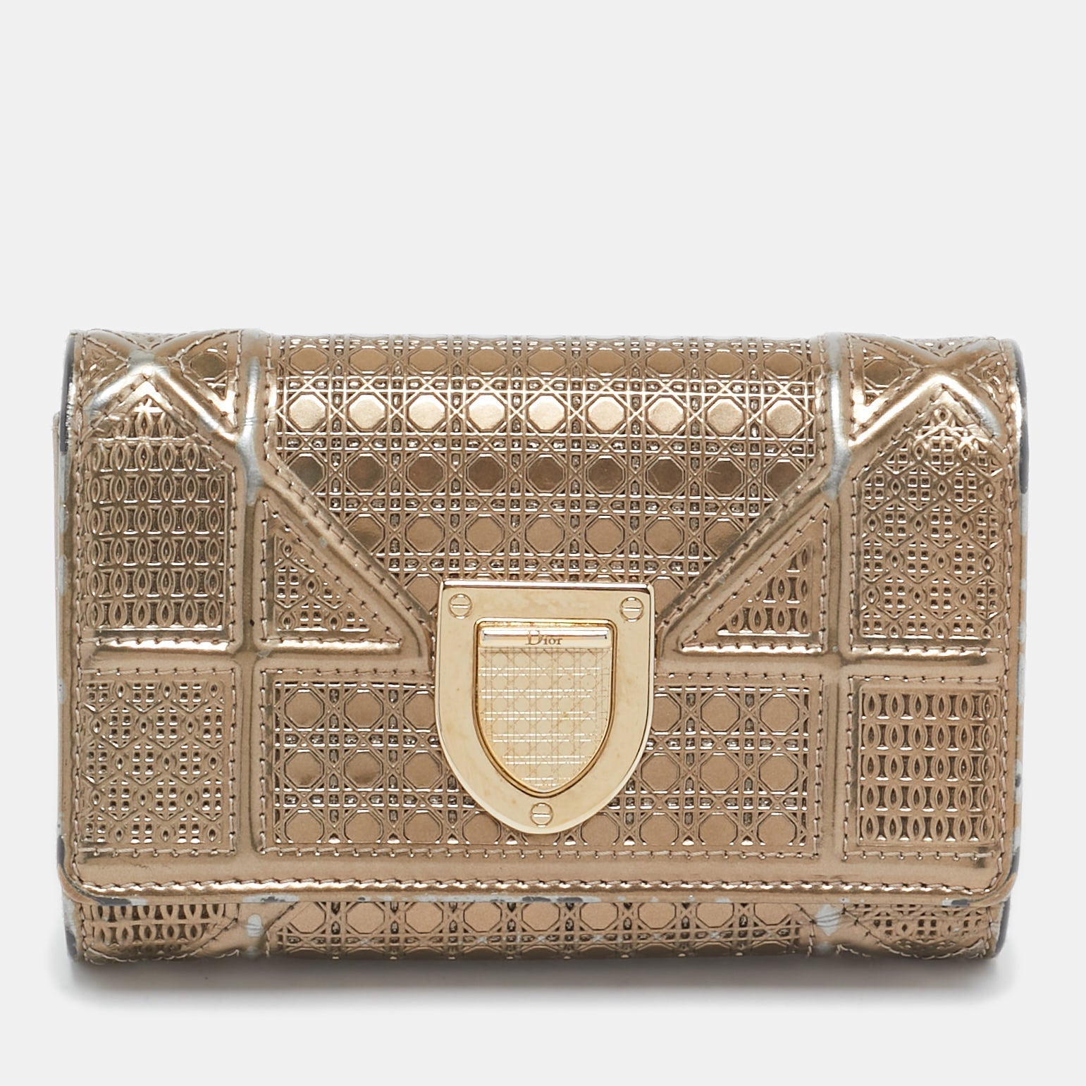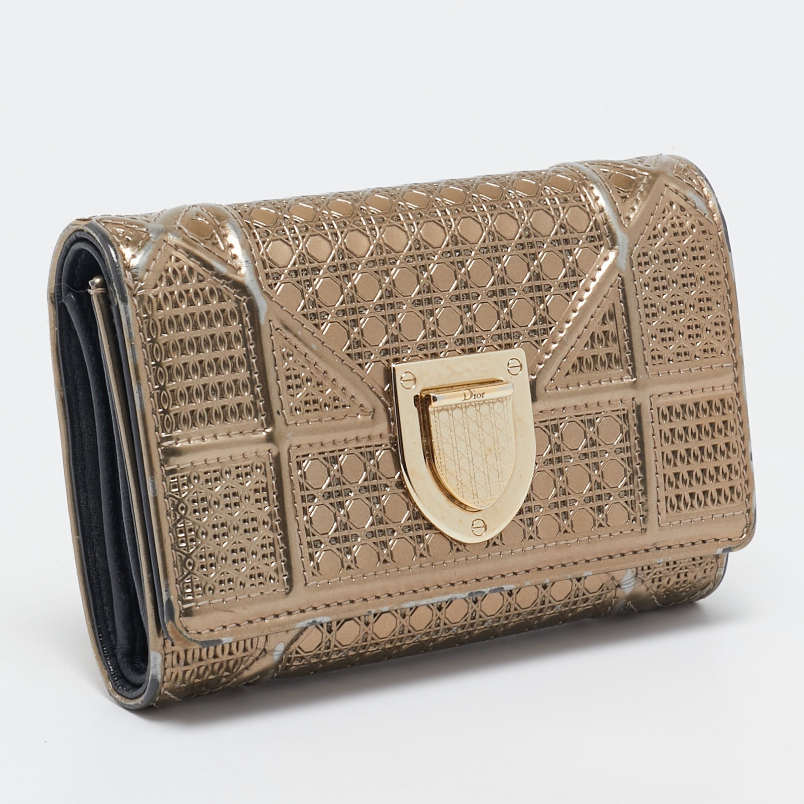 Introduced in Spring/Summer 2015 runaway the Diorama embodies refined shape and celebrates femininity through its artistic design. The signature Cannage pattern and its silver tone accents bring out the appeal of this Dior wallet. Made from patent leather it features a branded lock closure at the front. The leather and nylon interior makes for a luxurious abode for your monetary essentials.