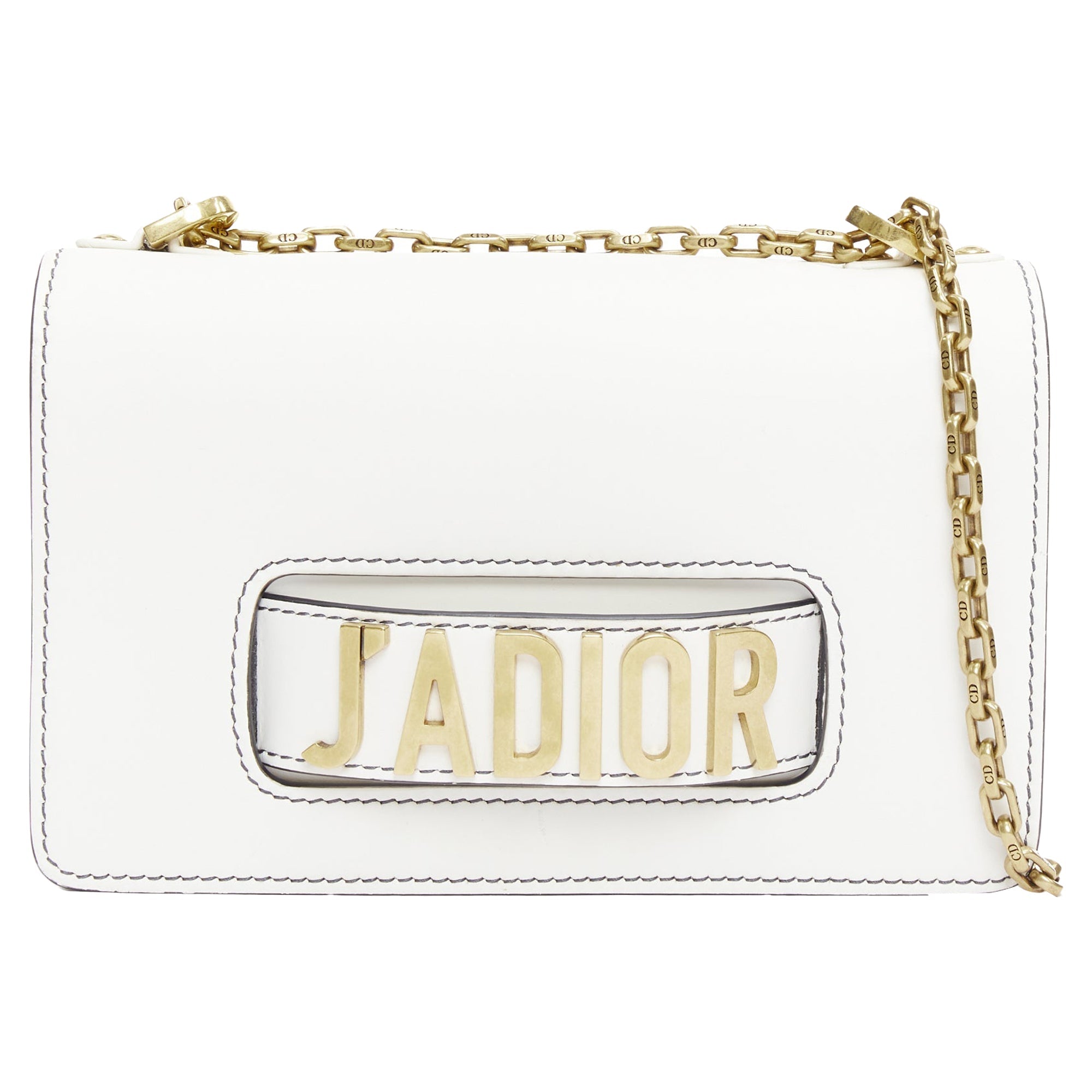Extra Details - This J'ADIOR chain flap bag is modern and effortlessly classy. This bag features white calfskin leather, a brand new bold logo with a slot hand clasp. The bag has a long chain strap and an interior perfect for your bare essentials.