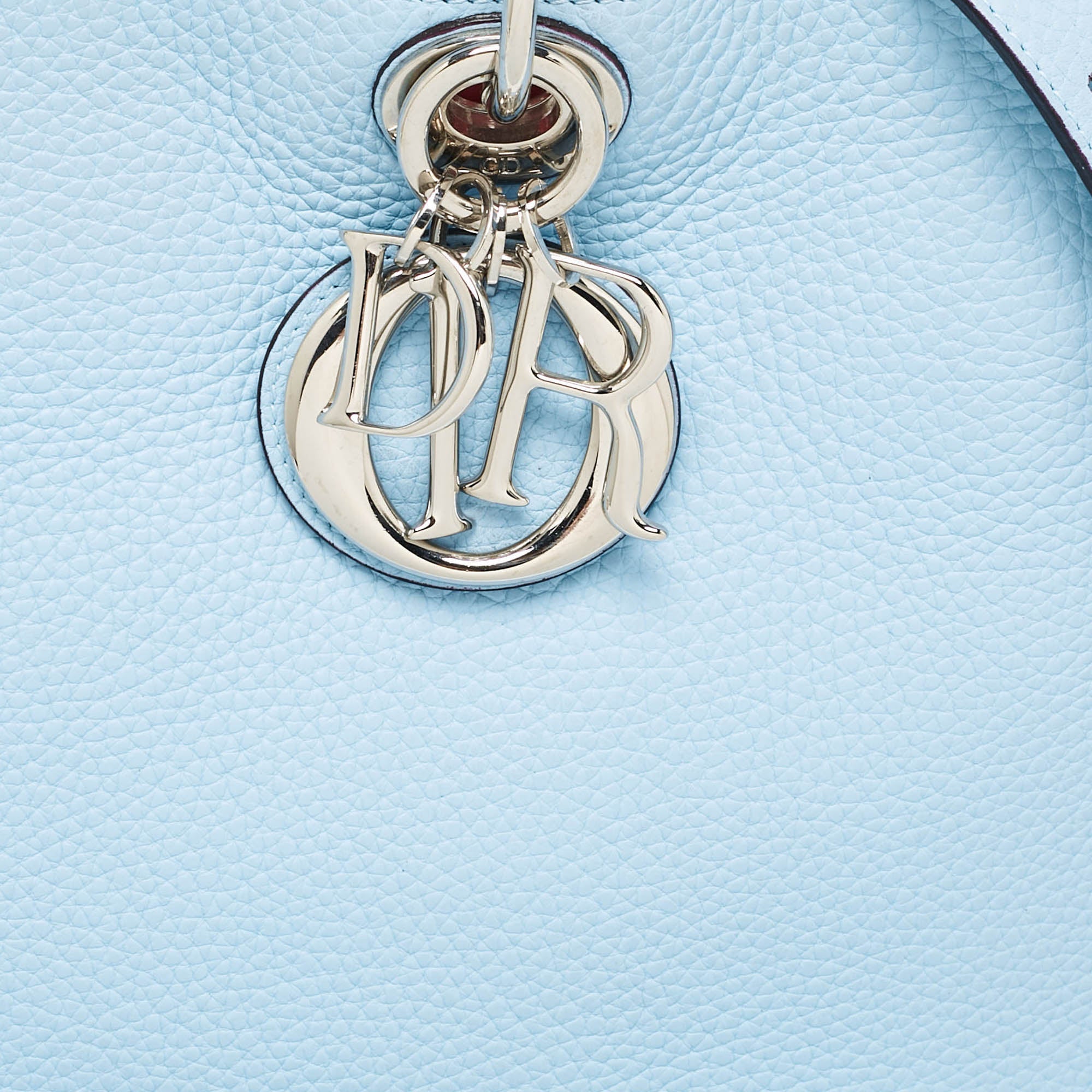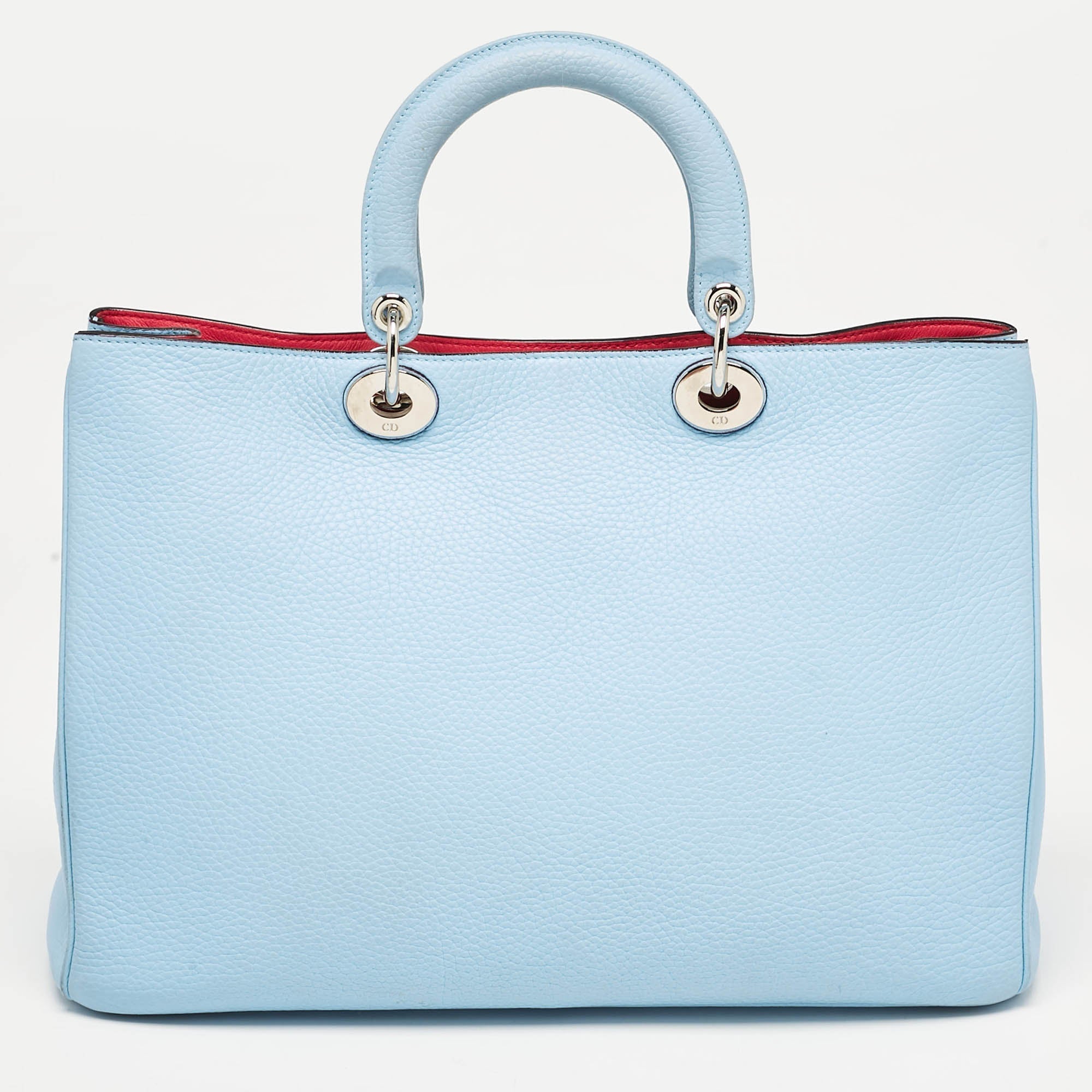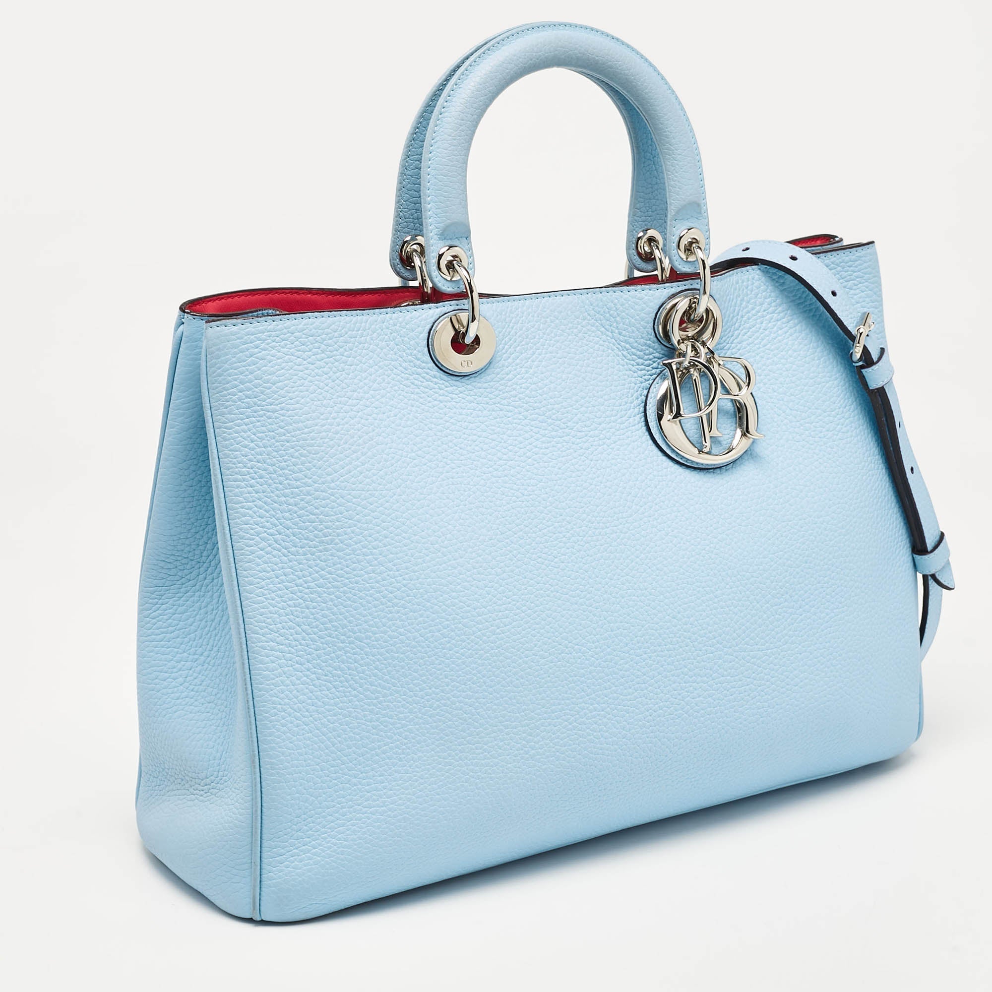 A sophisticated Dior shopper tote in light blue leather the Diorissimo combines elegance with practicality for daily use. It has classic brand elements and a bright pink interior.