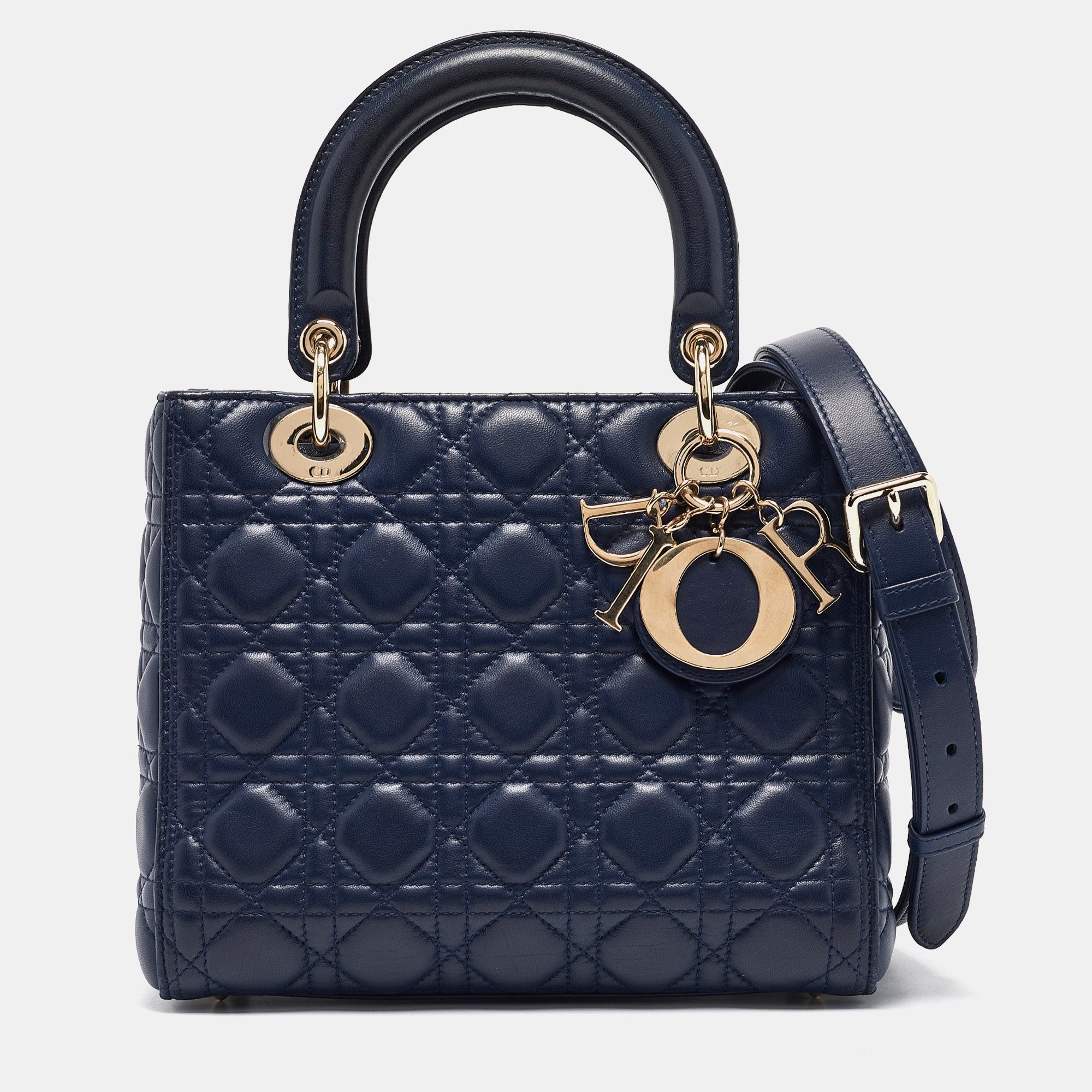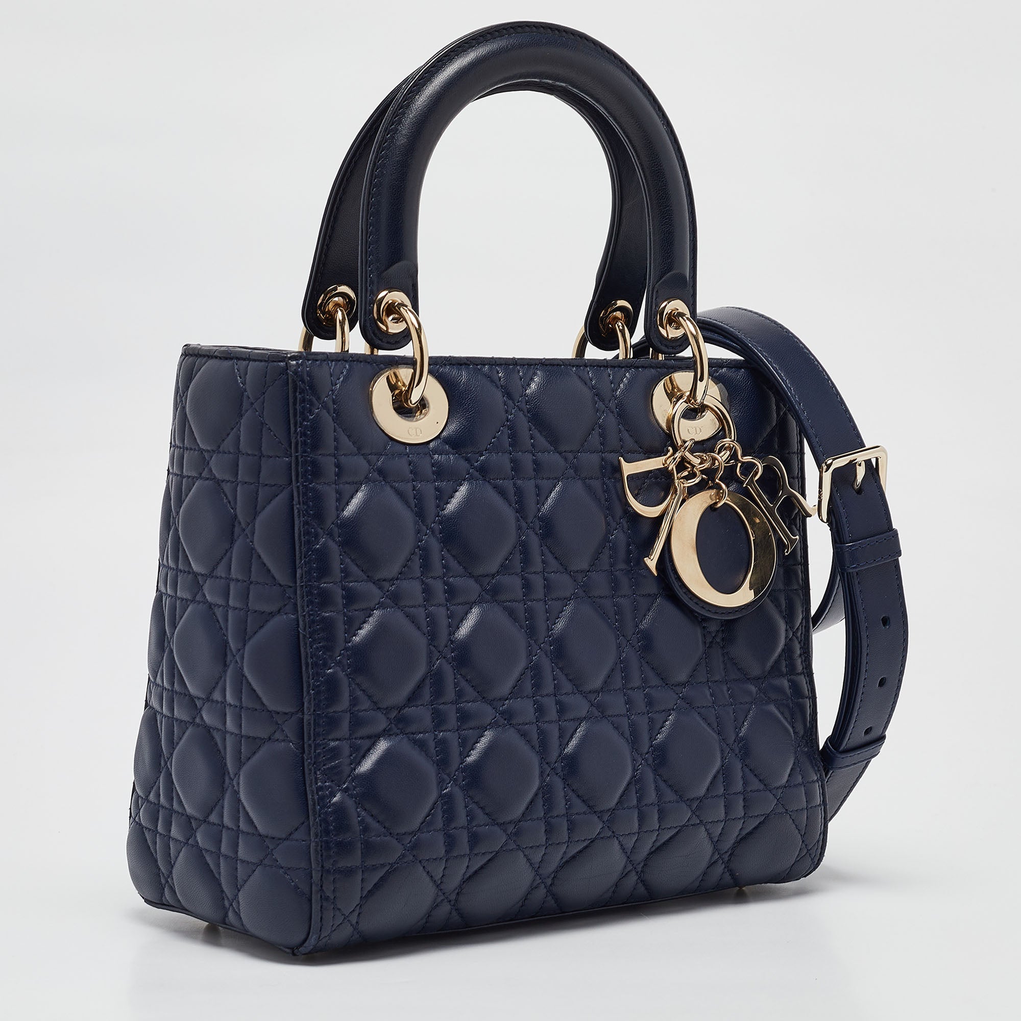 Due to detailed and innovative designs Dior has managed to be at the top of fashions hierarchy through the years. Infuse the signature aesthetics of the brand into your outfit by accessorizing it with this Lady Dior tote. With a classic design it is crafted from leather with a striking Cannage pattern and the brands letter charms mark its quality craftsmanship. The double handles at the top and its perfectly sized interior make it a functional companion for your next soiree.