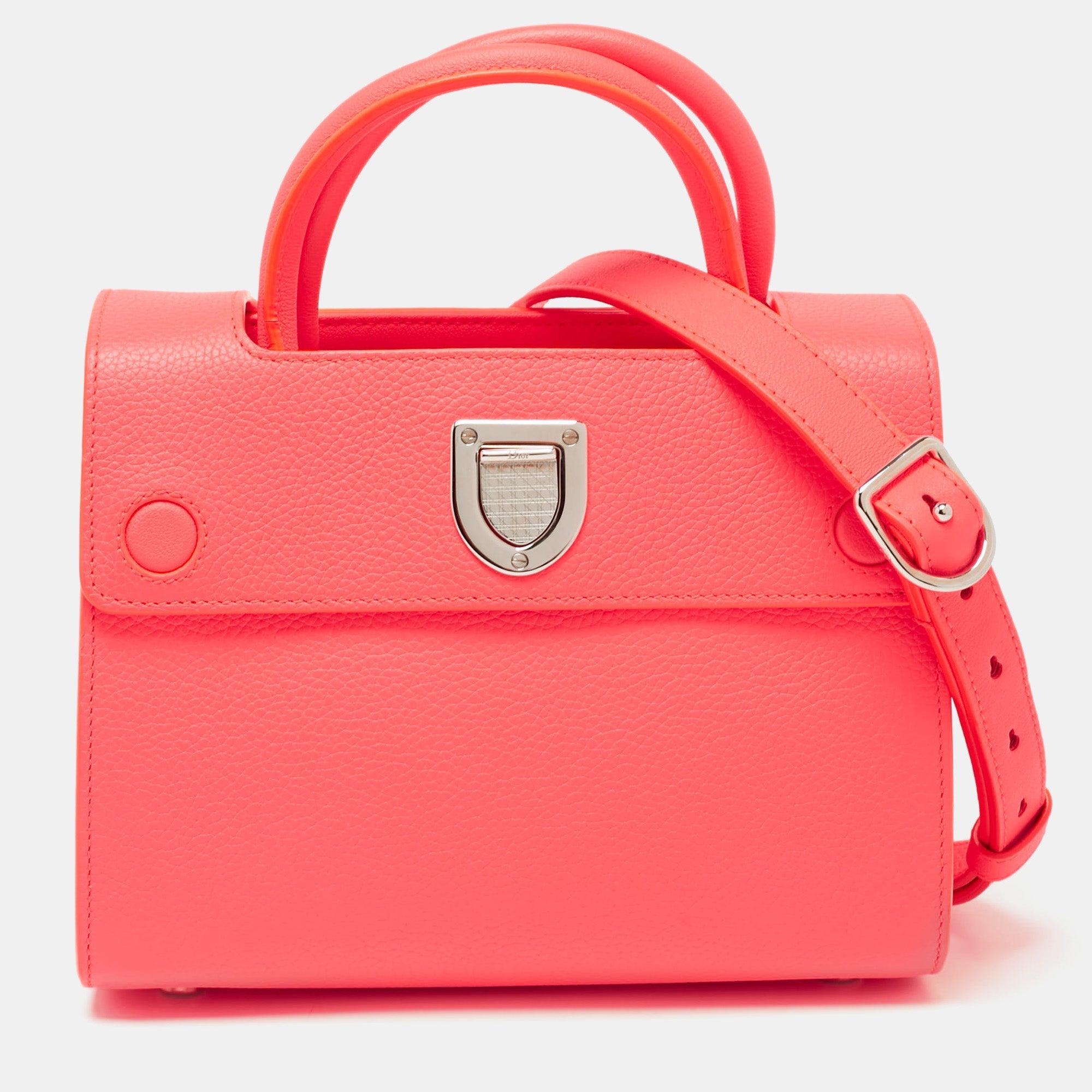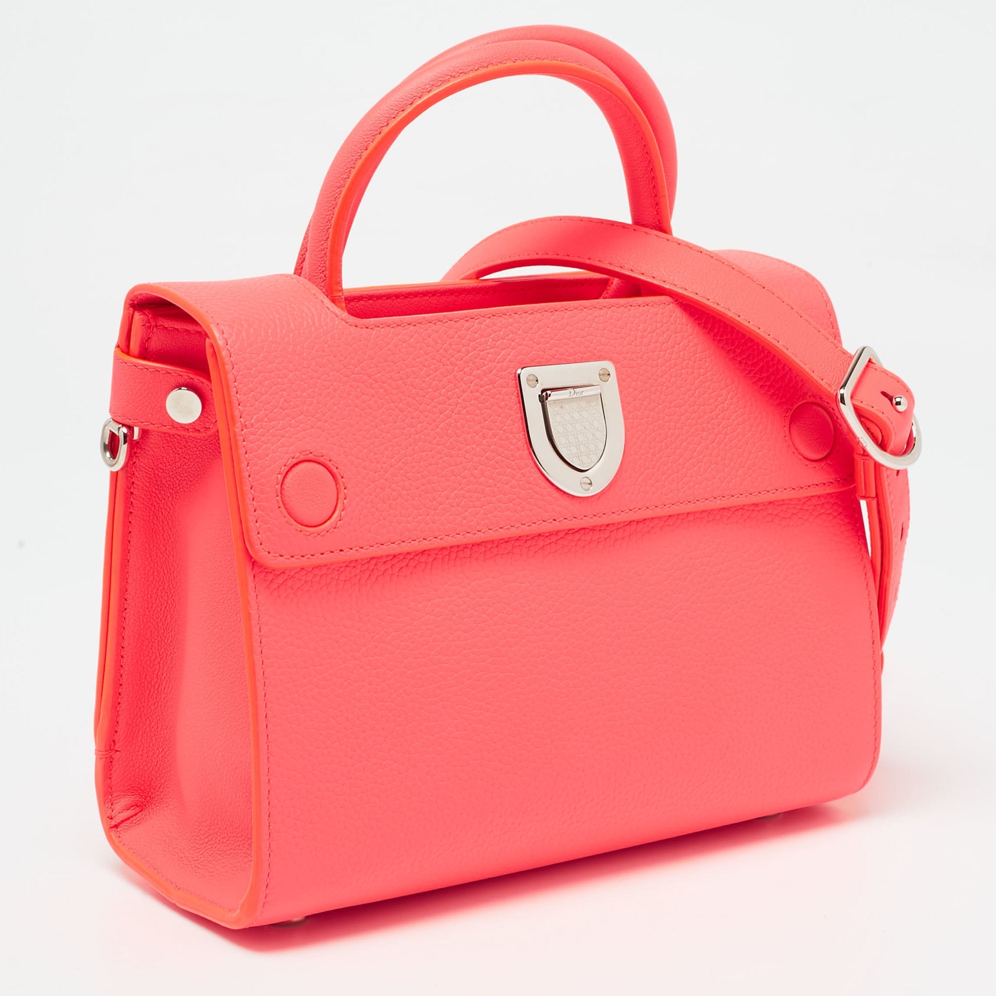 Every stitch and detail on this Diorever bag gives high praise to quality craftsmanship and validates the painstaking effort that goes into making a handbag art as fine as this. Structured to perfection using leather and designed with a crest shaped clasp that truly says DIOR this bag is a beauty. A flap secures the leather insides and two top handles plus a strap are provided for you to hold the bag.