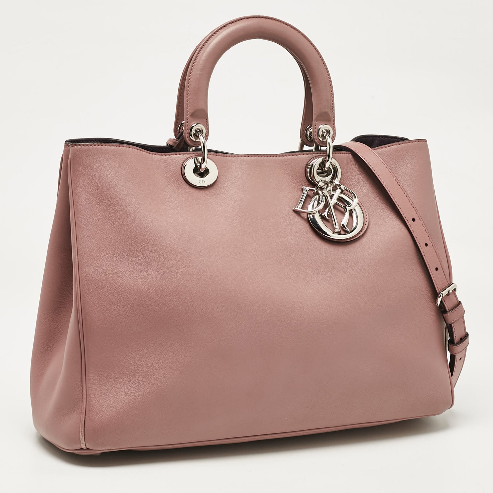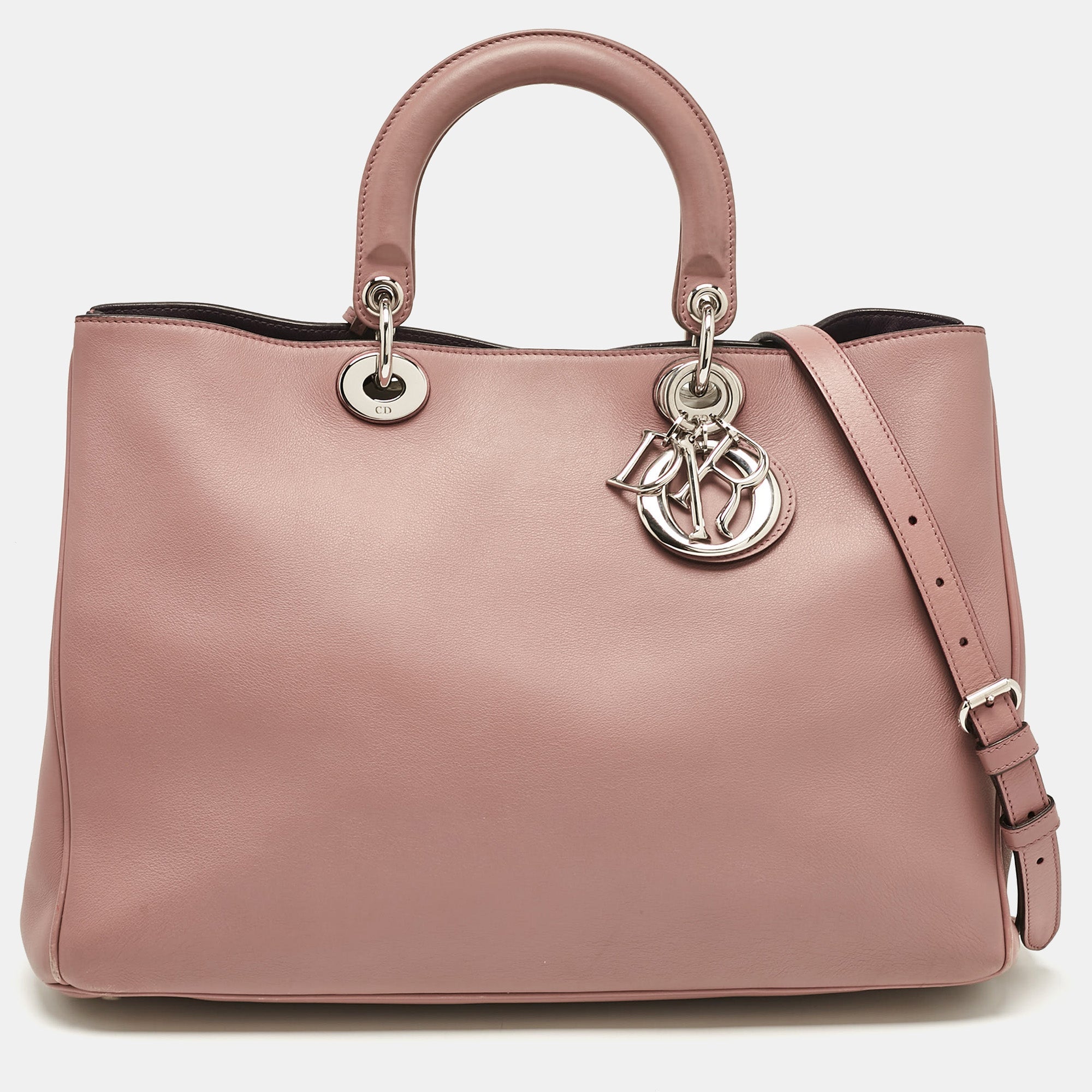 The Diorissimo perfectly captures the high craftsmanship and timeless elegance of the maison. The spacious interior makes this Dior tote a highly functional accessory. Created from leather it is complemented with dual top handles a shoulder strap and silver tone hardware. The DIOR letter charms on the front lend it a recognizable sign off.