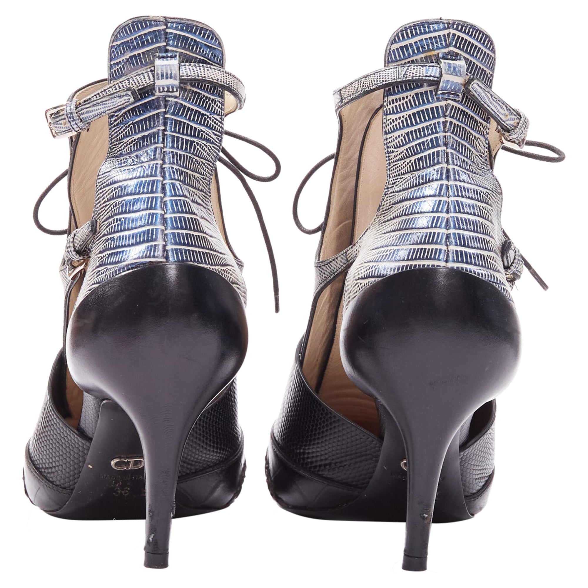 DIOR Raf Simons Runway metallic blue black scale embossed cut out booties EU36Reference - EALU/A00055Brand - DiorDesigner - Raf SimonsCollection - 2016 - RunwayMaterial - LeatherColor - Blue, BlackPattern - Animal PrintClosure - Lace UpLining - Nude LeatherExtra Details - Lace up and side ankle buckles closure.Made in - ItalyCONDITION - Condition - Good, this item was and is in good condition. Please refer to image gallery for thorough condition check. Scuffed back heels at both sides.Yellow stains at outside of left shoe and dot stain at front toes at left side.Comes with - Style code present (Generic) Order will NOT be shipped with original box, but the original box is available if shipping cost is paid separately. Please contact us directly to get a shipping quote with box. SIZINGDesigner size - EU36Size reference - EU36 / US6 / UK3 / JP23.5Measurments -