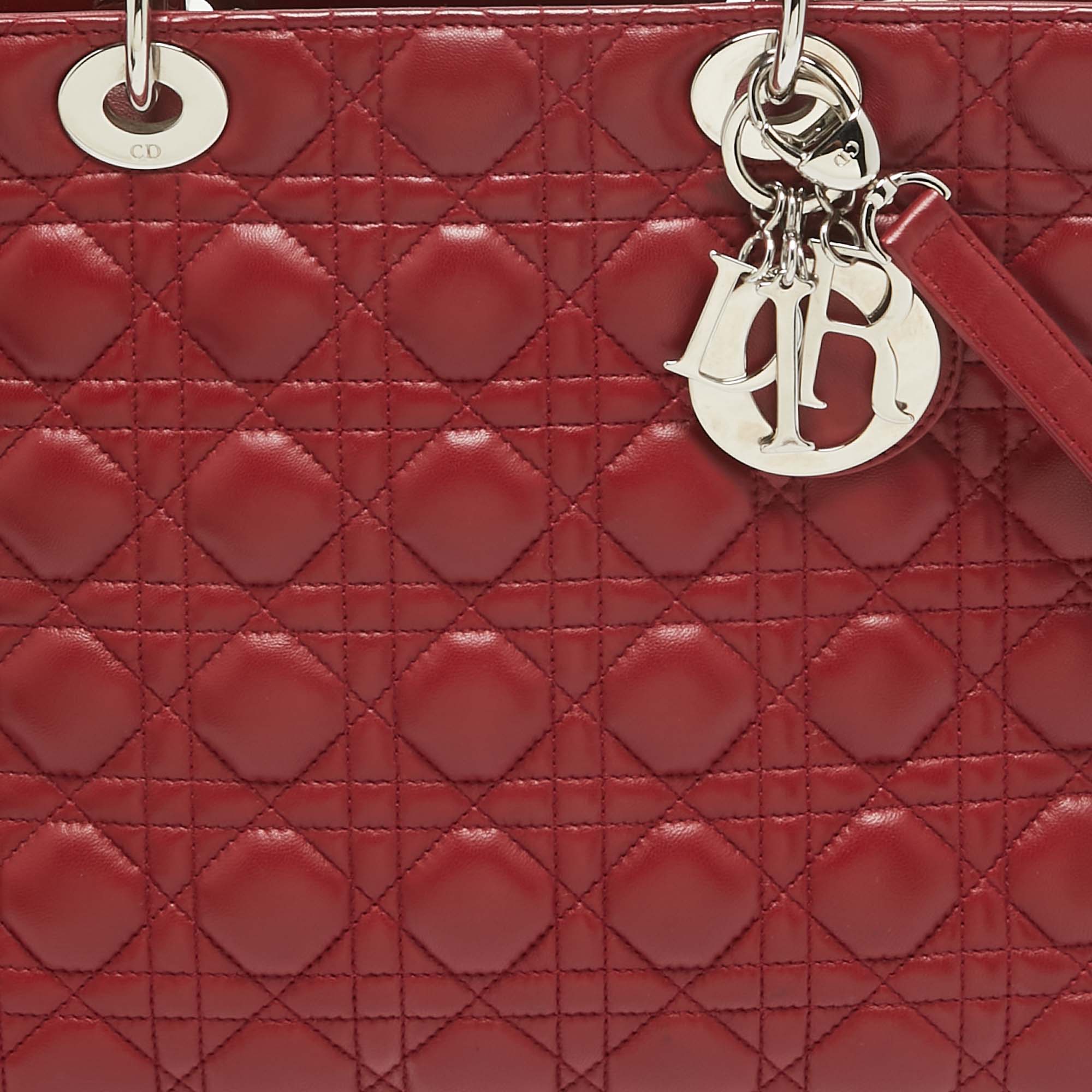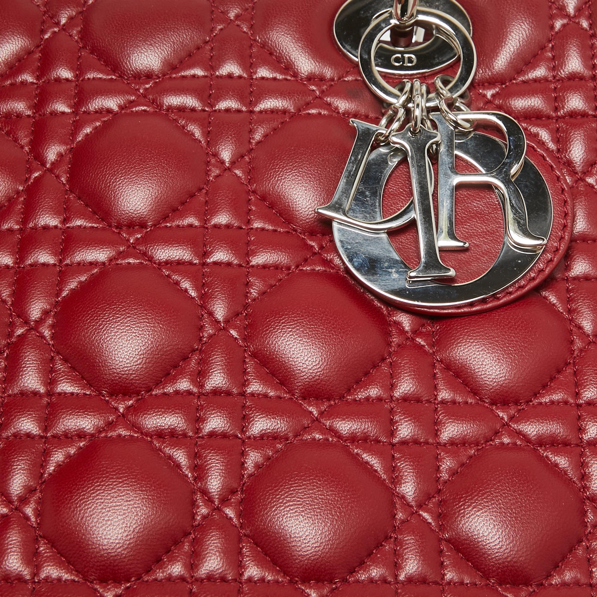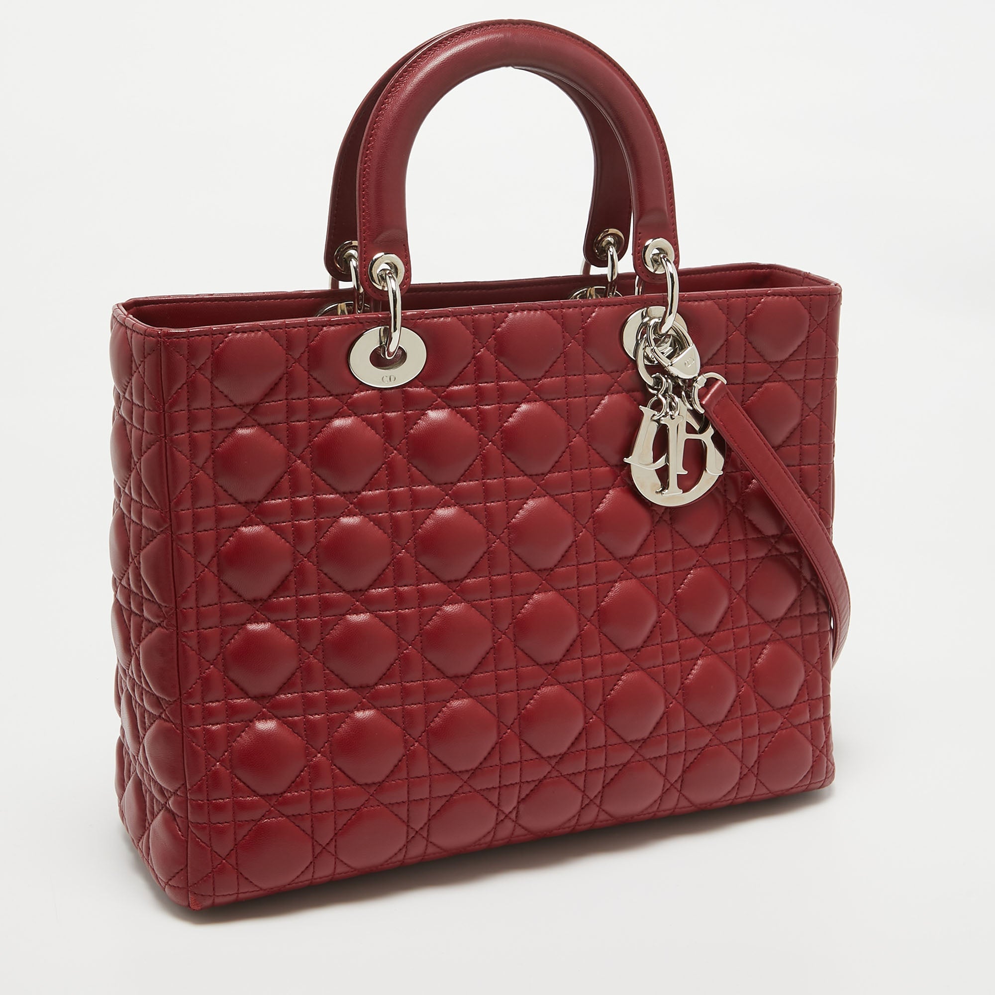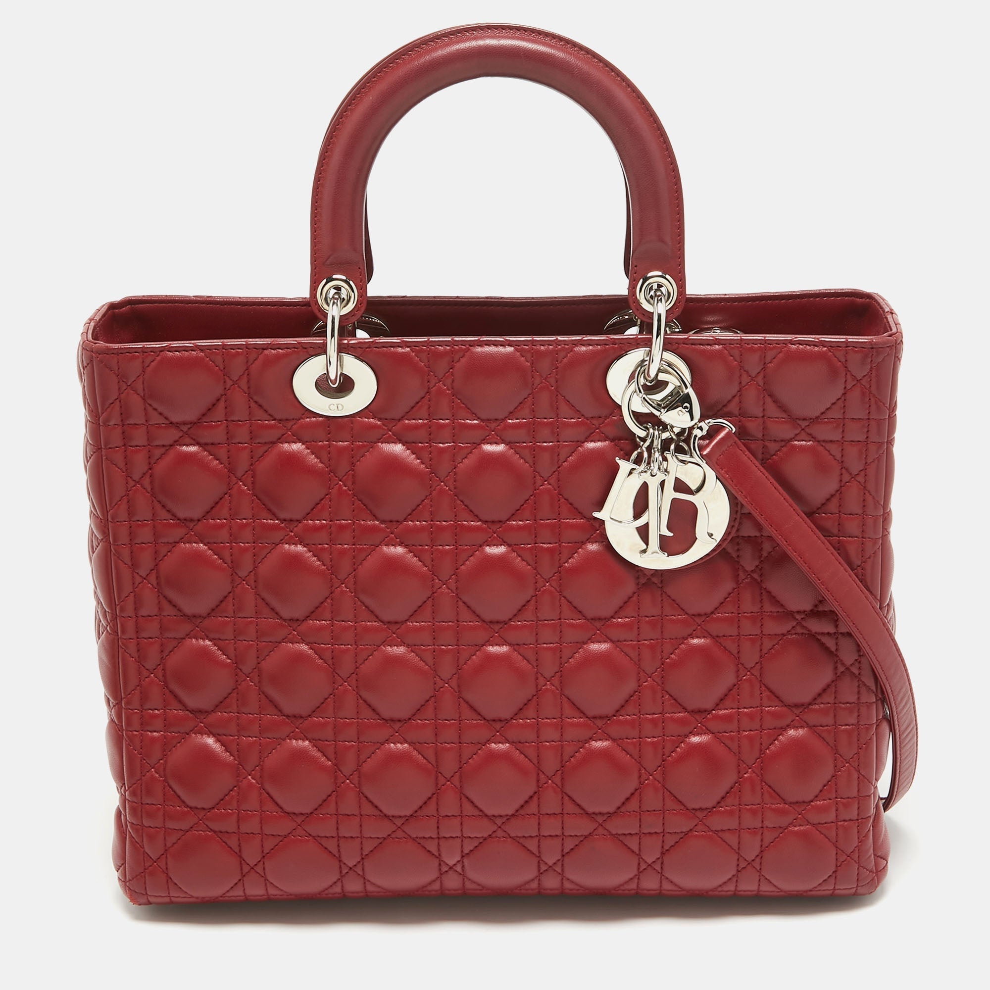 The Lady Dior tote from Dior is remarkable highly coveted and since its birth in 1994 it has swayed us with its shape design and beauty. This version is a joy to witness It comes meticulously crafted from red leather and designed with their signature Cannage pattern all over and a spacious nylon interior for your essentials. It is complete with two top handles a shoulder strap and the classic Dior letter charms. This piece is sure to win your love.
