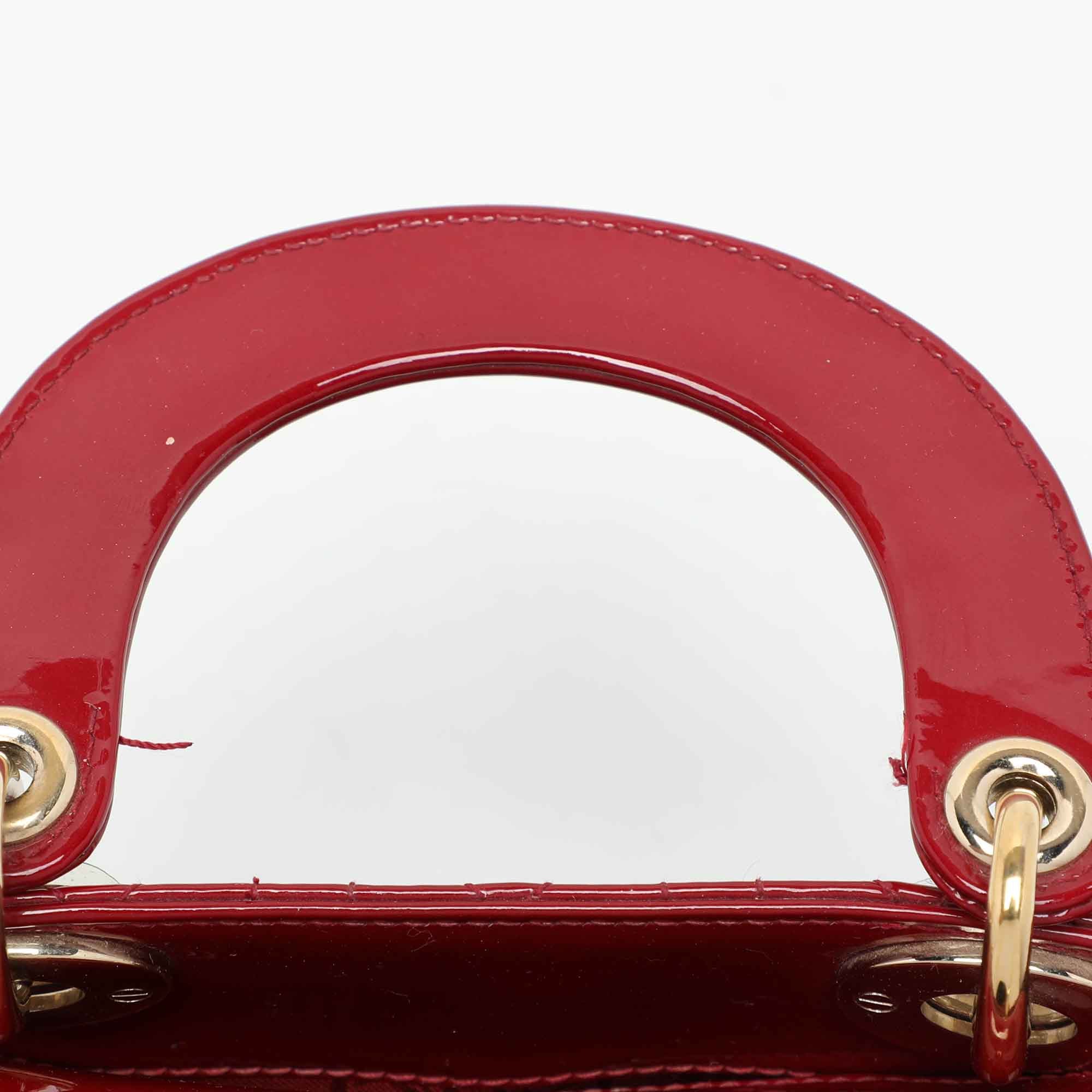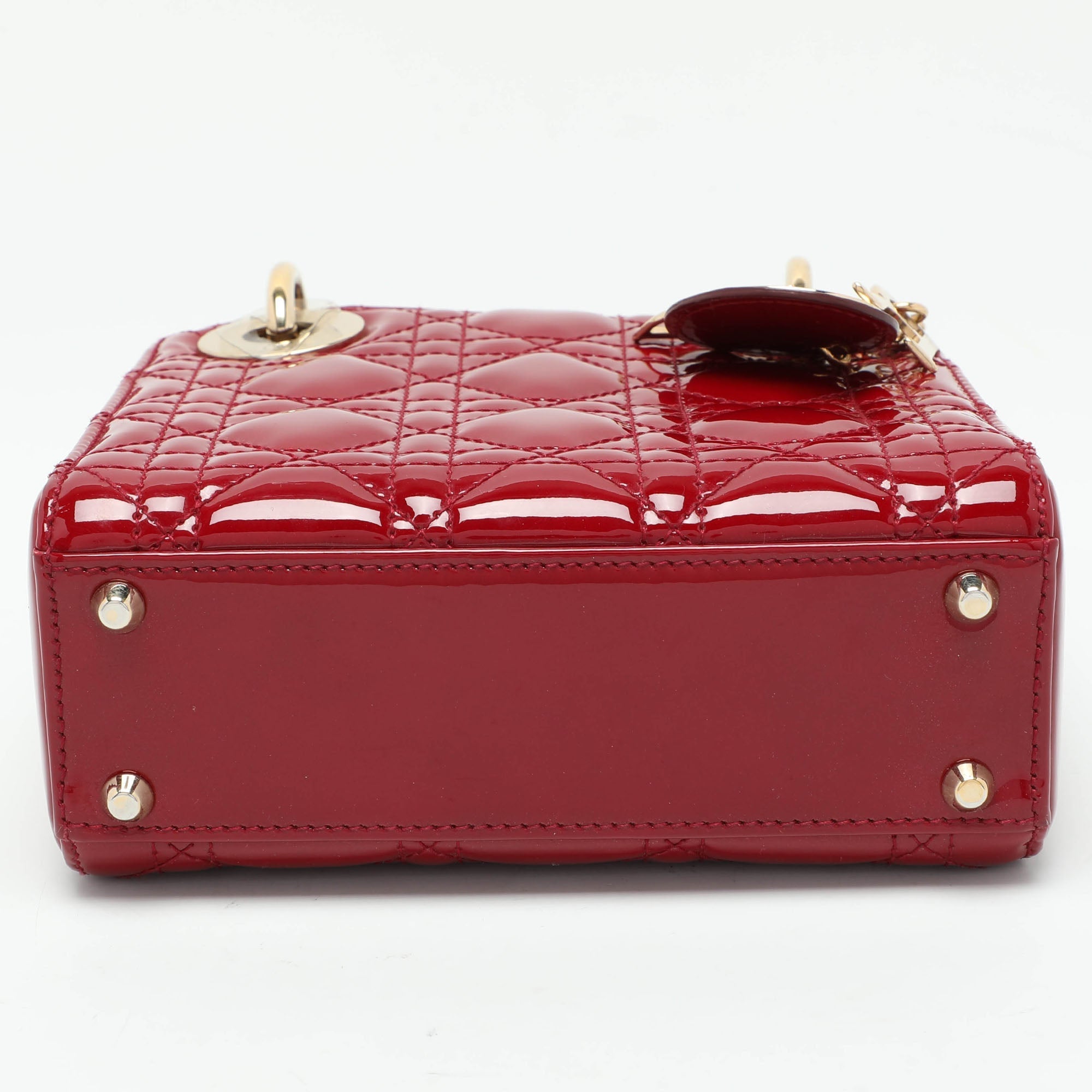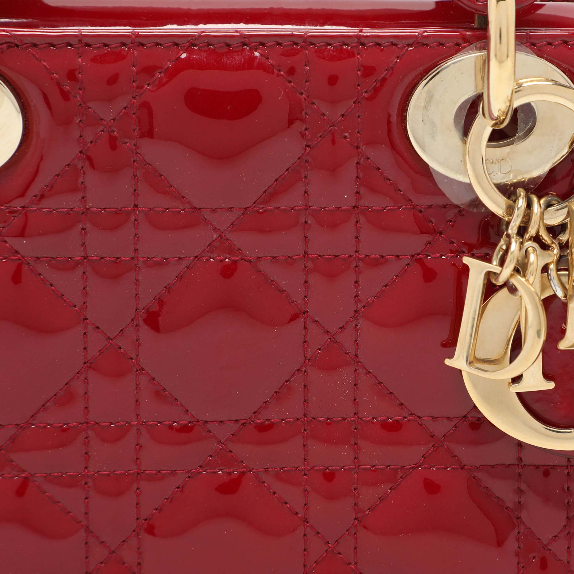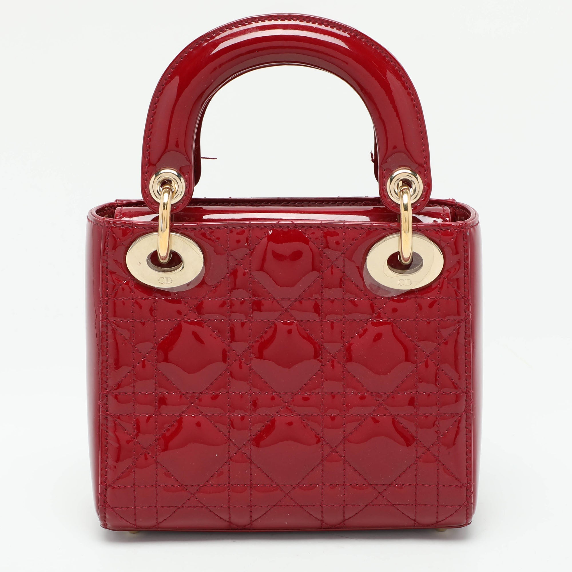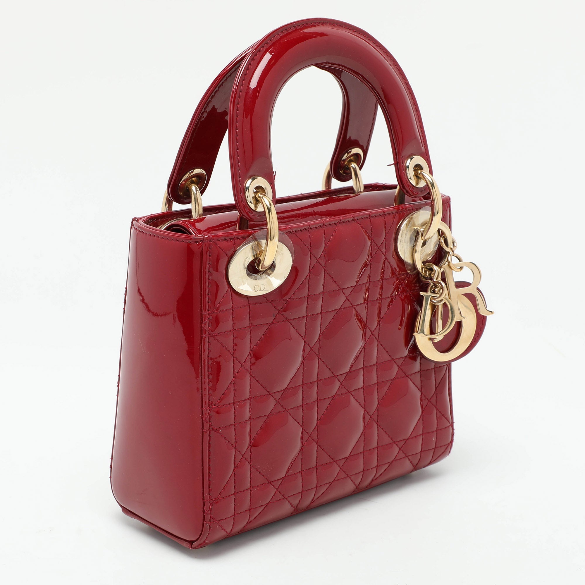 The Lady Dior tote is a Dior creation that has gained recognition worldwide and is today a coveted bag that every fashionista craves to possess. This stunning red tote has been crafted from patent leather and carries the signature Cannage quilt. It is equipped with a well sized nylon interior two top handles and a luxurious gold tone chain strap. The gorgeous piece is complete with the classic Dior letter charms.