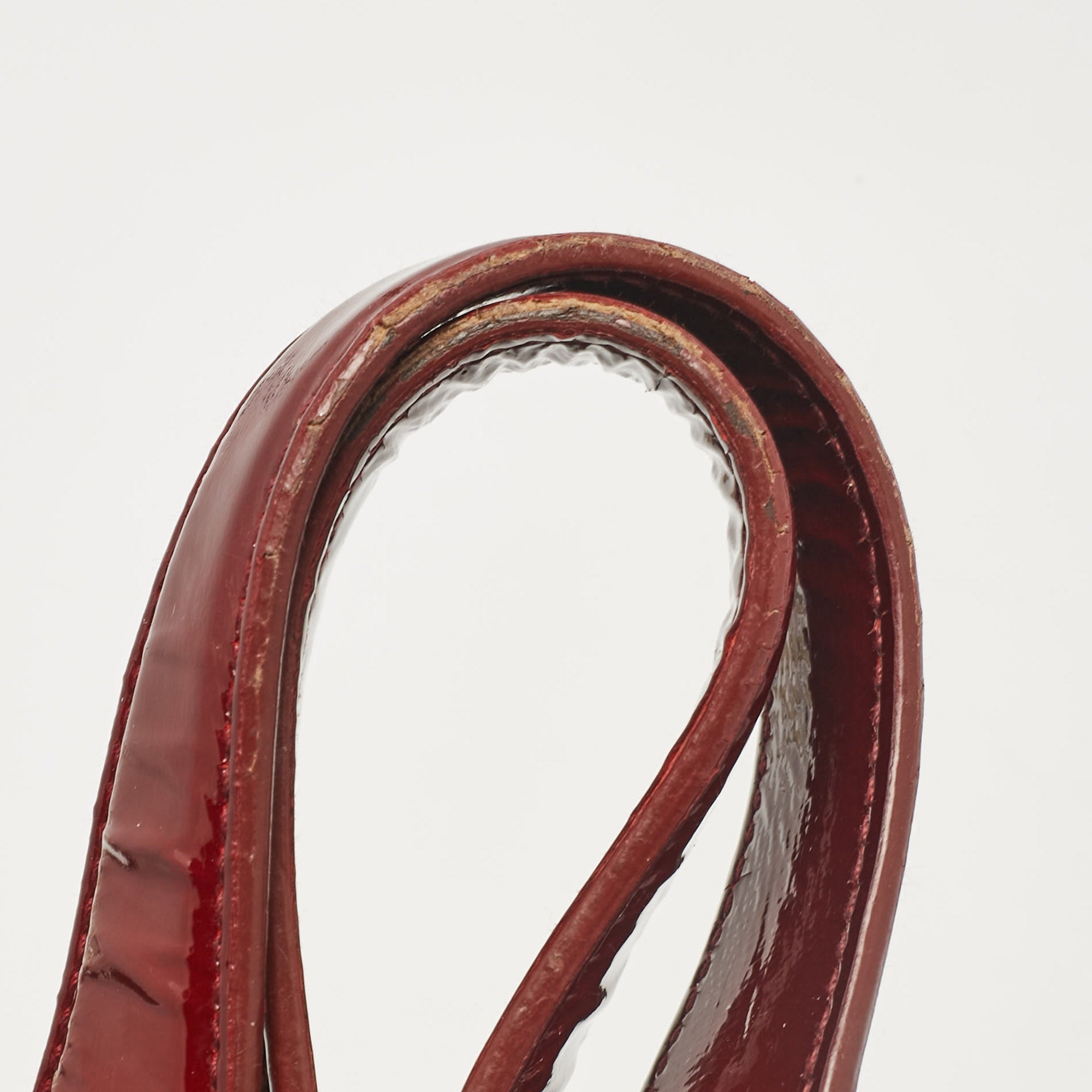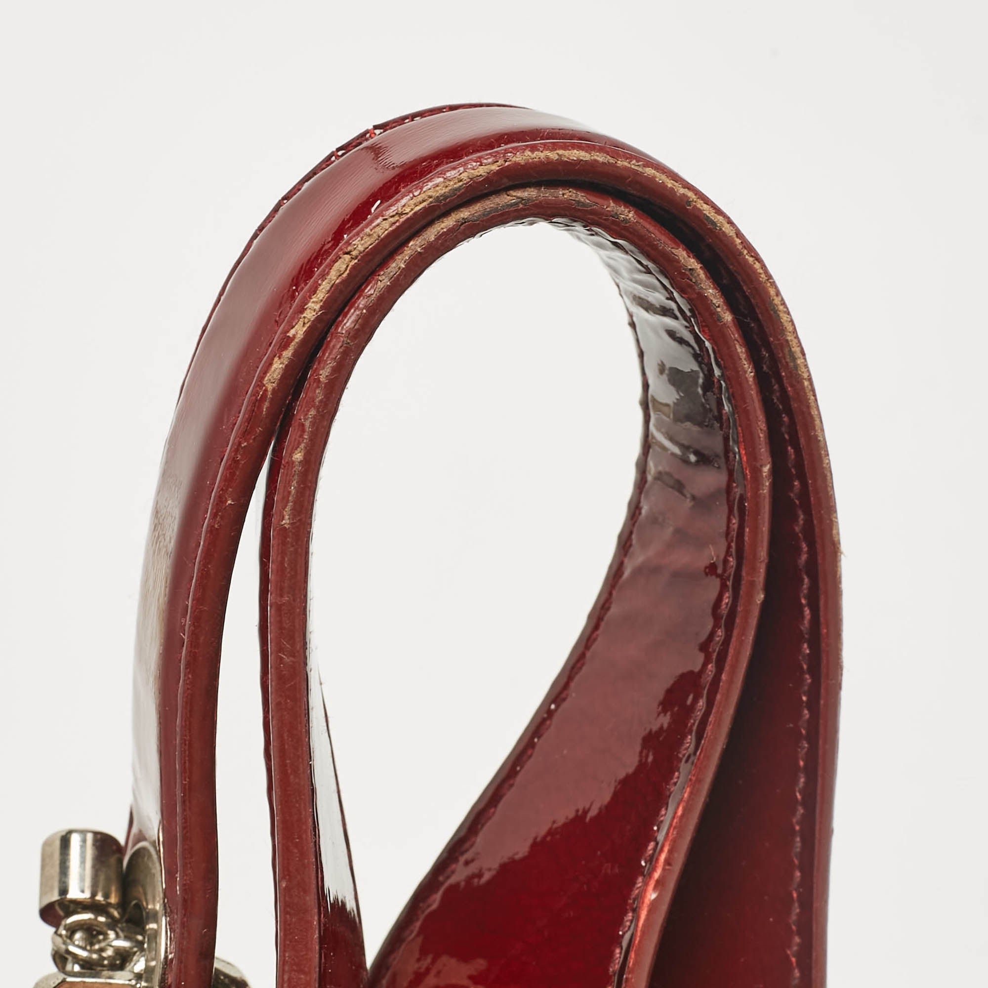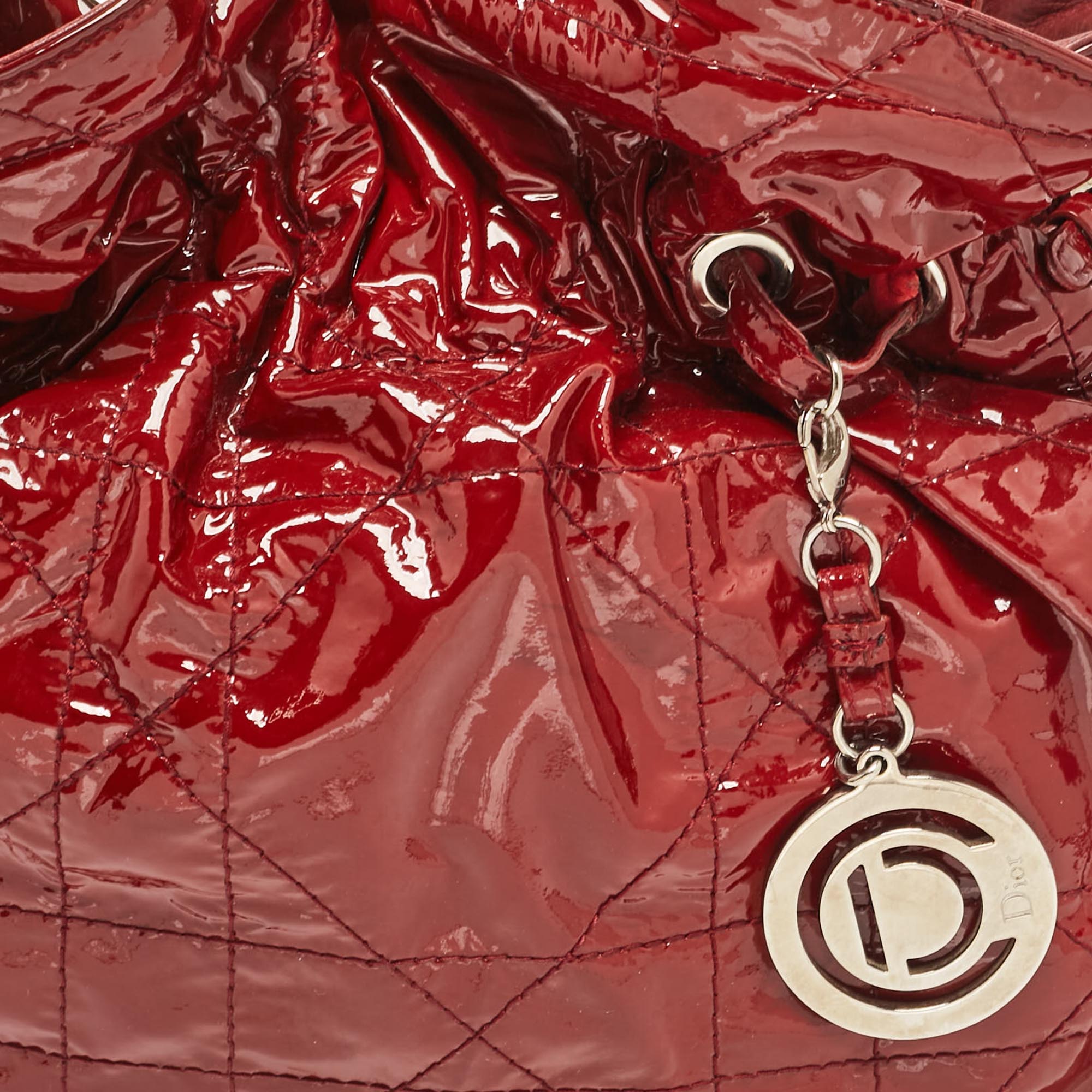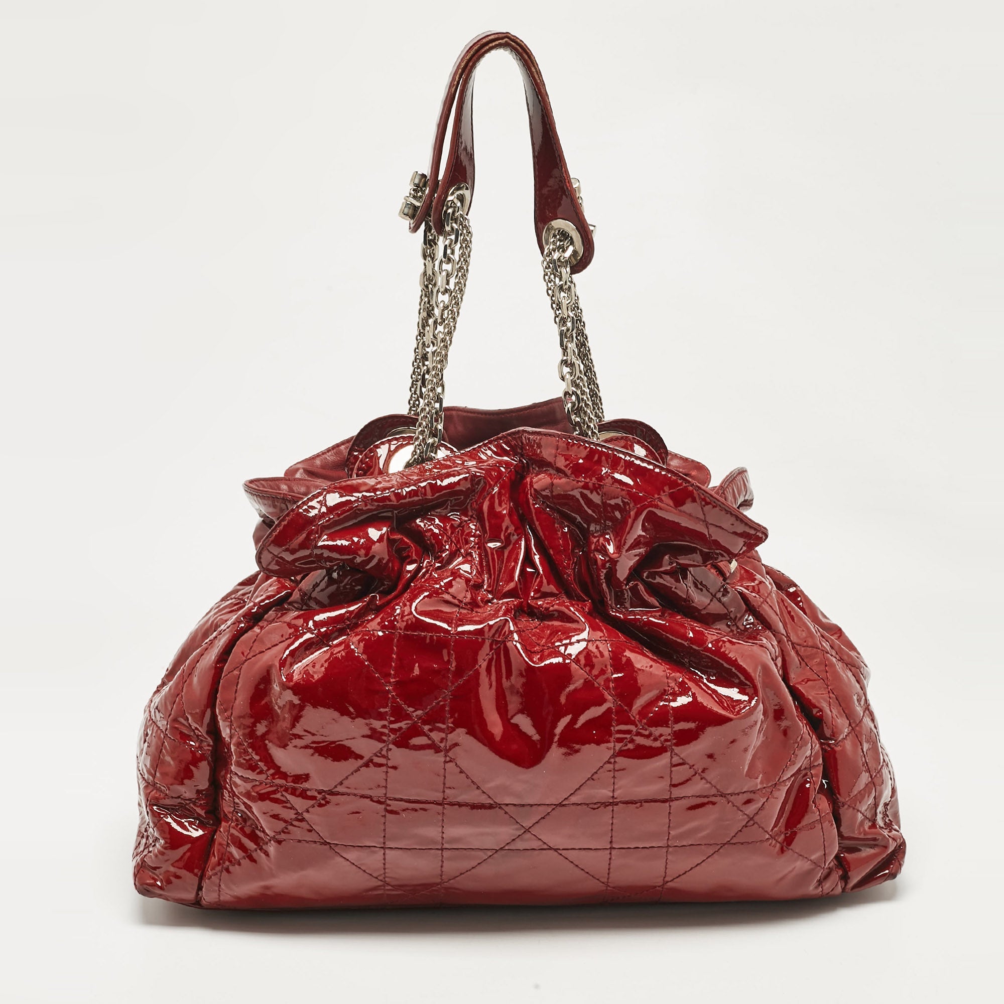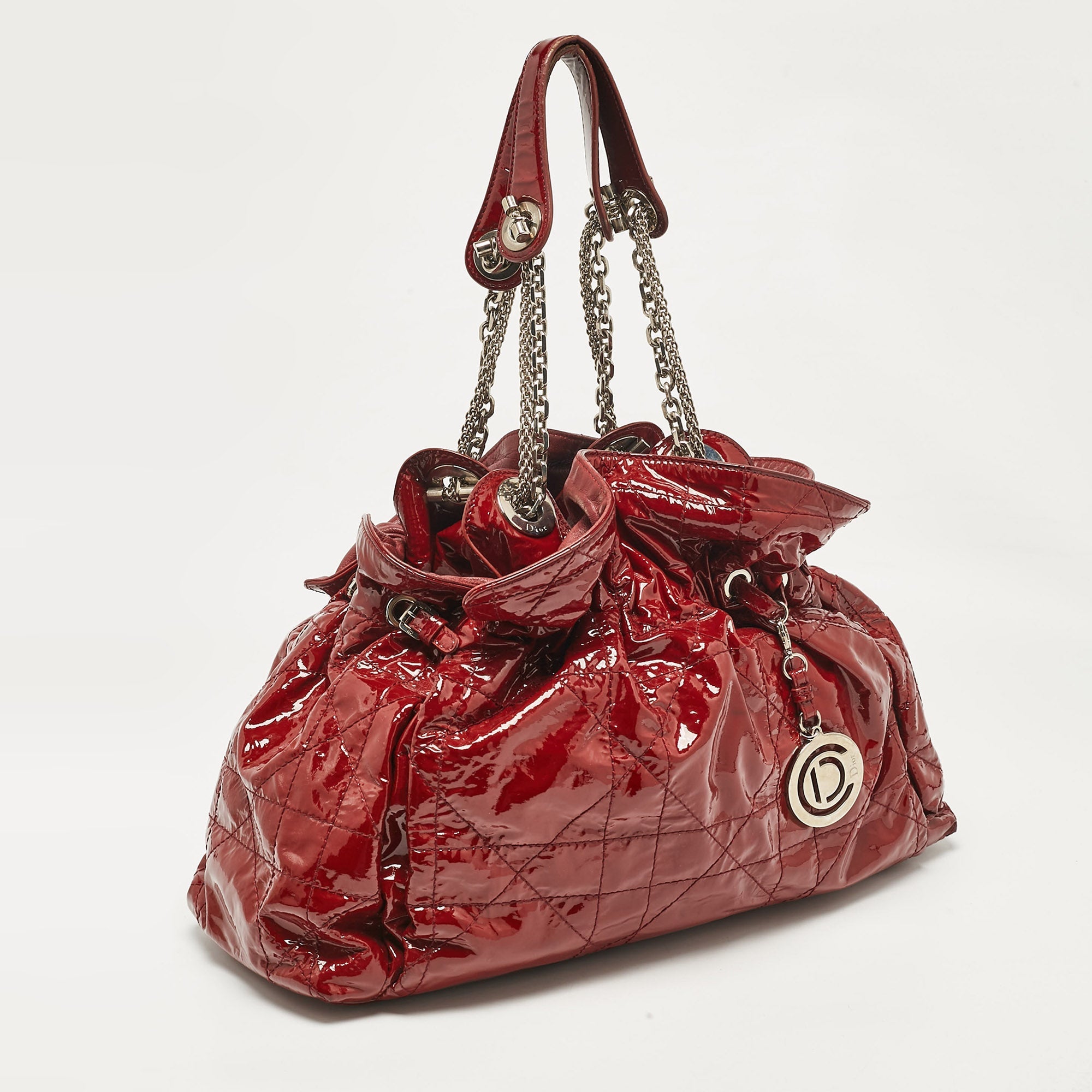 This stylish Le Trente hobo from Dior has been crafted from red patent leather. The bag features dual chain straps with leather shoulder rest a CD cutout charm in silver tone metal a drawstring closure and protective metal feet at the bottom. The insides are fabric lined and spacious enough to hold your daily essentials.