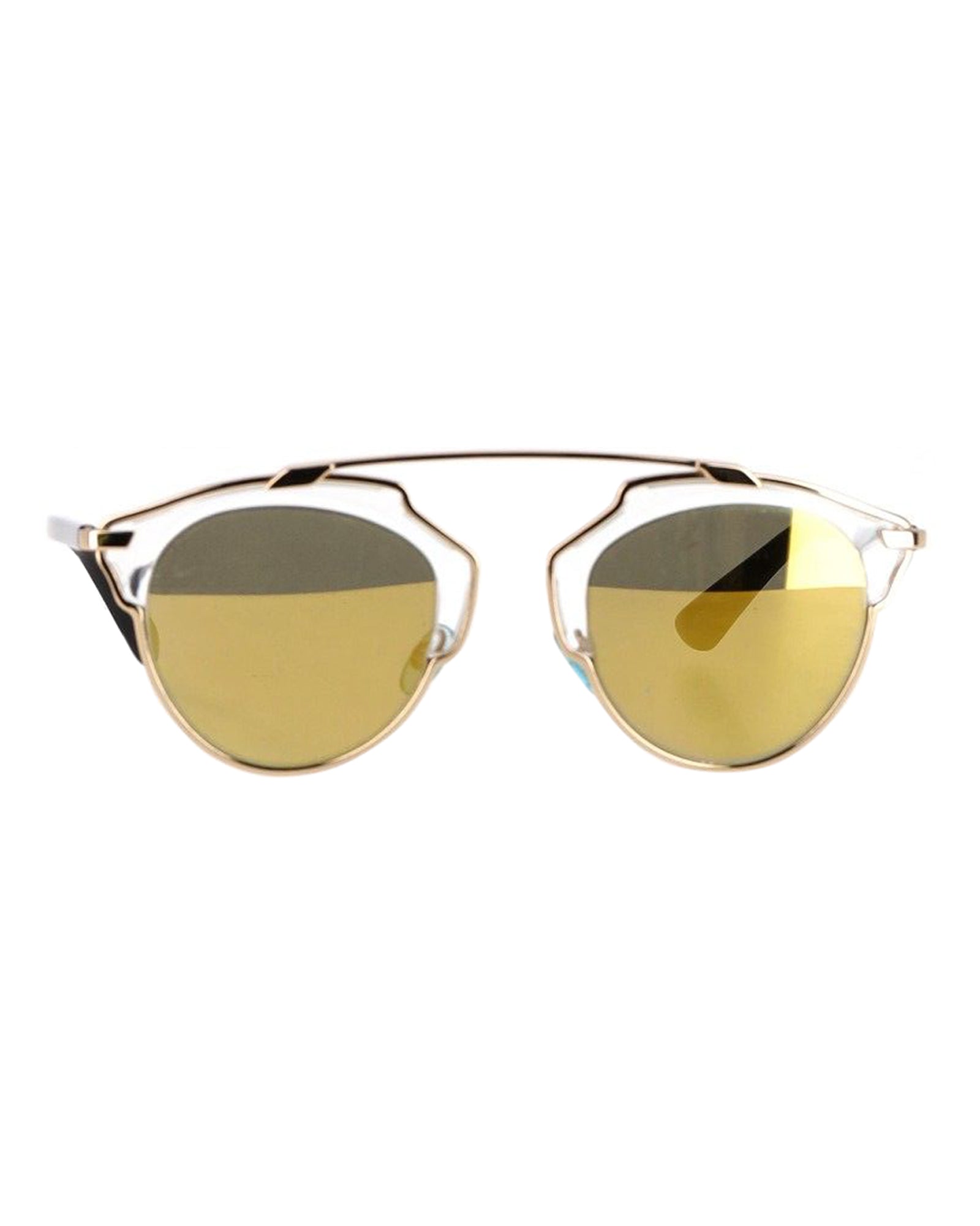 Step into the world of high fashion with the Dior So Real Sunglasses in Gold Metal. Boasting a glamorous and sophisticated design, these sunglasses feature a luxurious gold metal frame and striking architectural lenses that redefine modern style. The sleek brow bar detail adds a touch of contemporary elegance, while the mirrored lenses reflect a sense of effortless chic. Dior So Real Sunglasses in Gold MetalMaterial - MetalColor - Gold Size - One sizeDimensions - Width - 50mm; Height - 50mmCondition - Very goodSign of wear - Light wearSKU - 365151