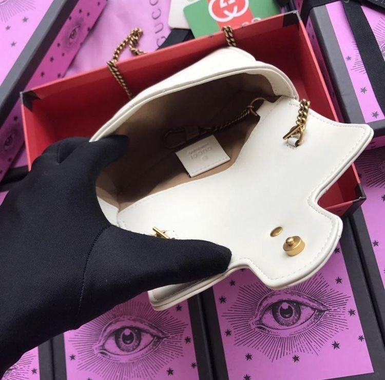 The small GG Marmont chain shoulder bag has a softly structured shape and an oversized flap closure with Double G hardware. The sliding chain strap can be multiple ways, changing between a shoulder and a top handle bag. Made in matelassé chevron leather with a heart on the back.