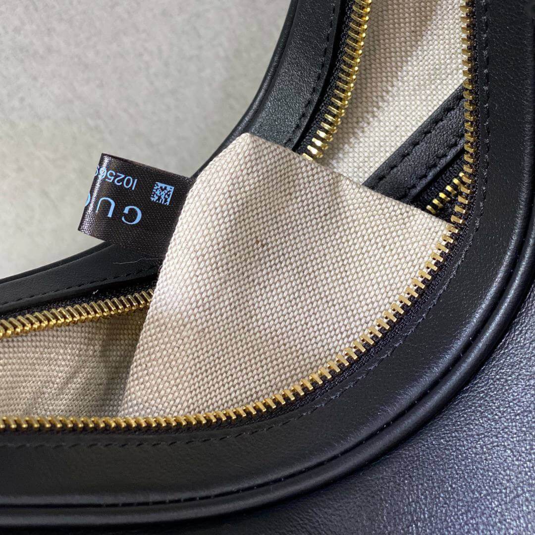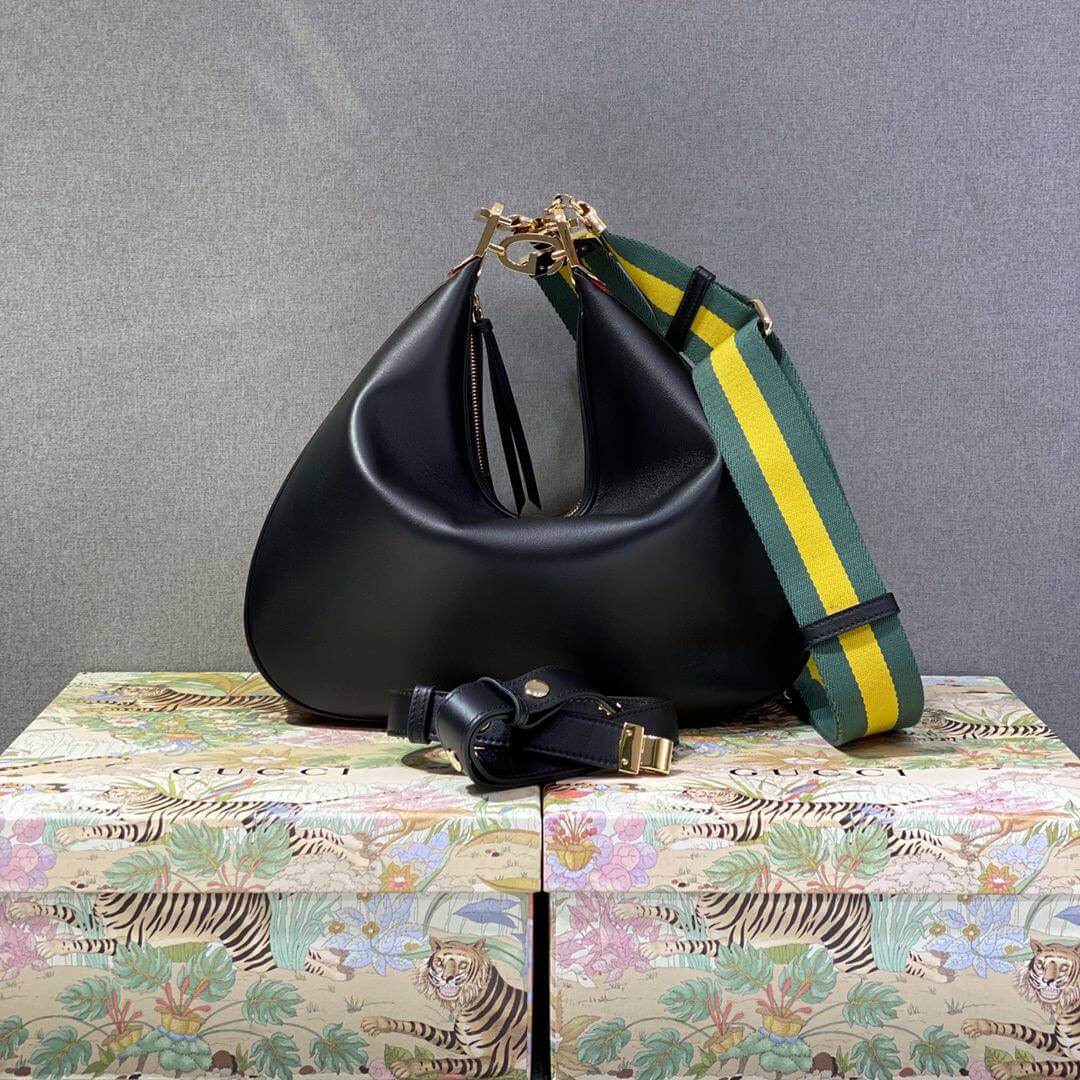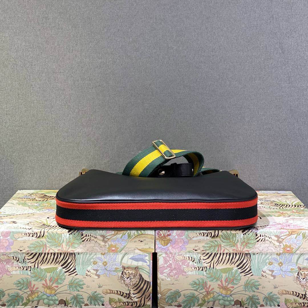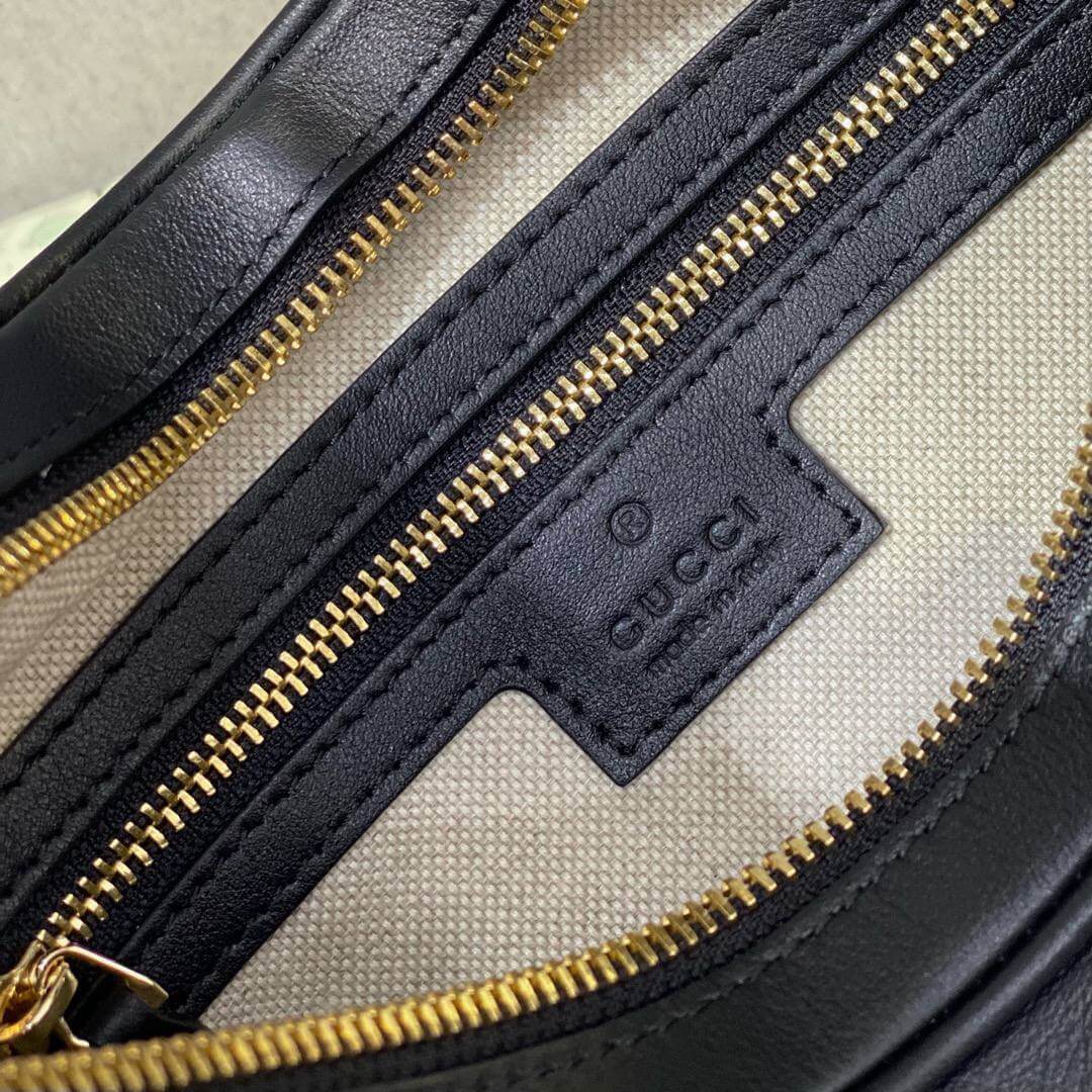 An ode to the timeless Hollywood glamour that shaped Gucci Love Parade, classic elements from the House's archives are reintroduced. Distinguished by its crescent moon shape, the accessory is further defined by a G shaped hook closure. Paired with soft materials, the heritage hardware creates a refined design with vintage appeal. This small version is crafted in black leather with orange and black Web trim.