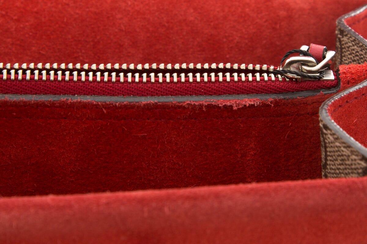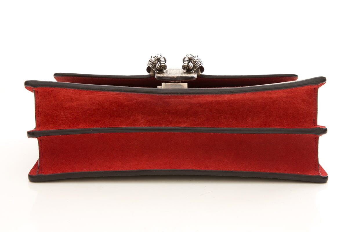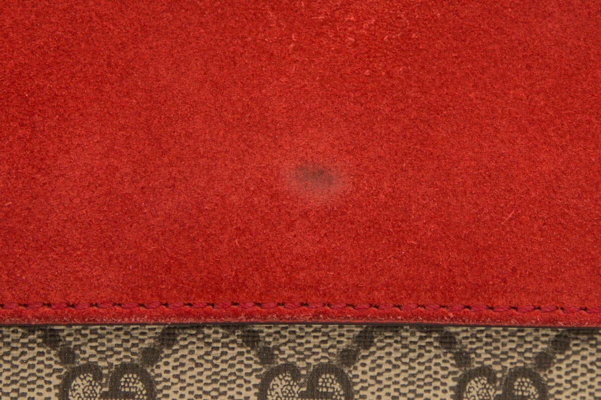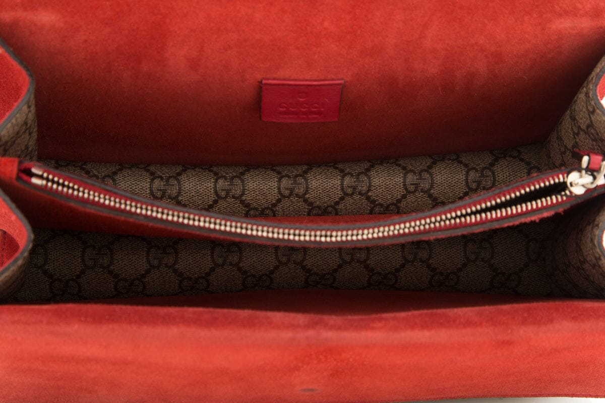 Gucci Dionysus Monogram With Red Suede Contrast Cross-Body W/ Silvertone Hardware. This item is in good condition with some wear to suede on interior.