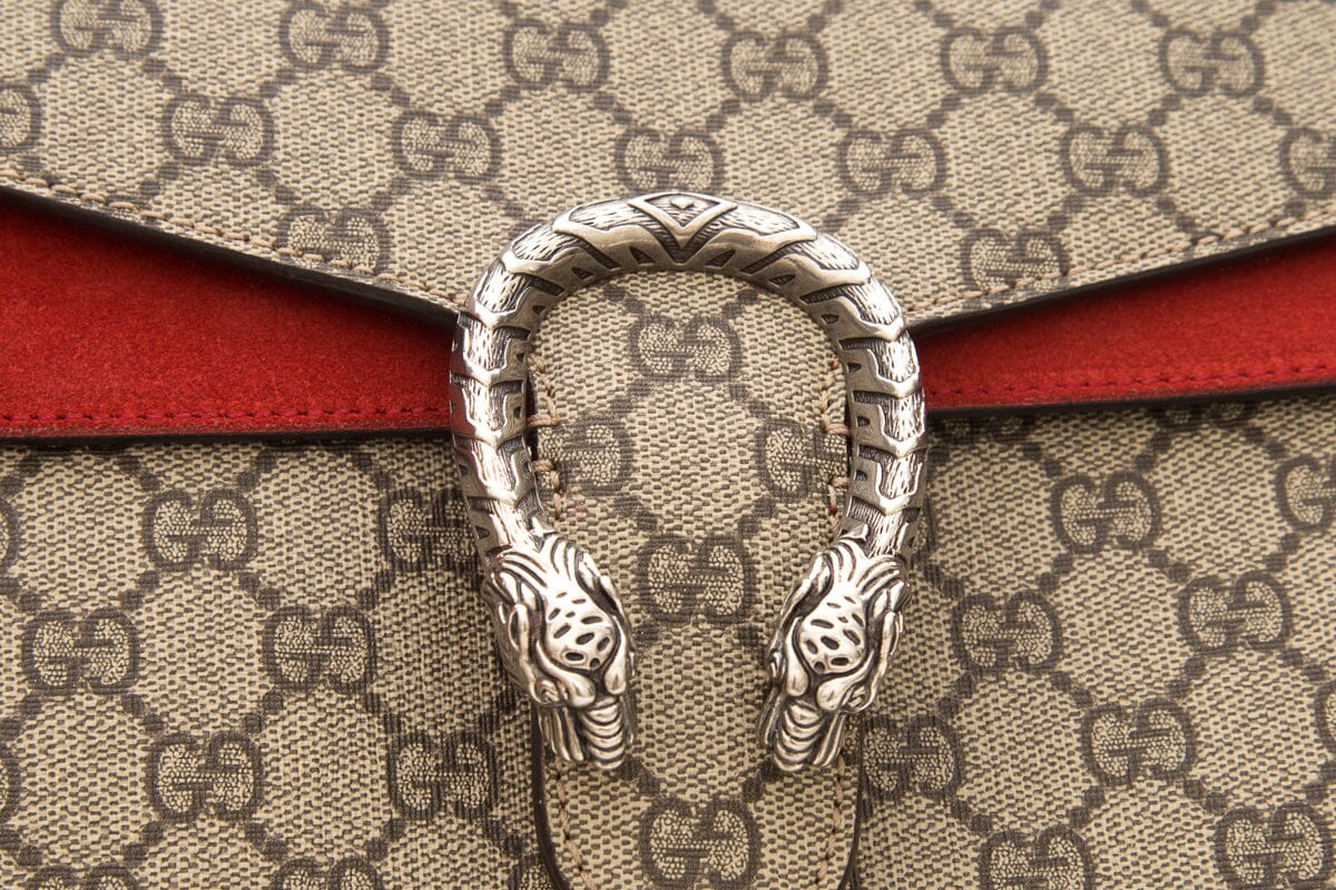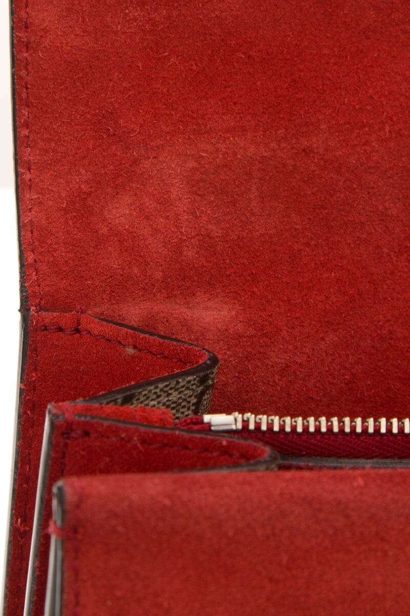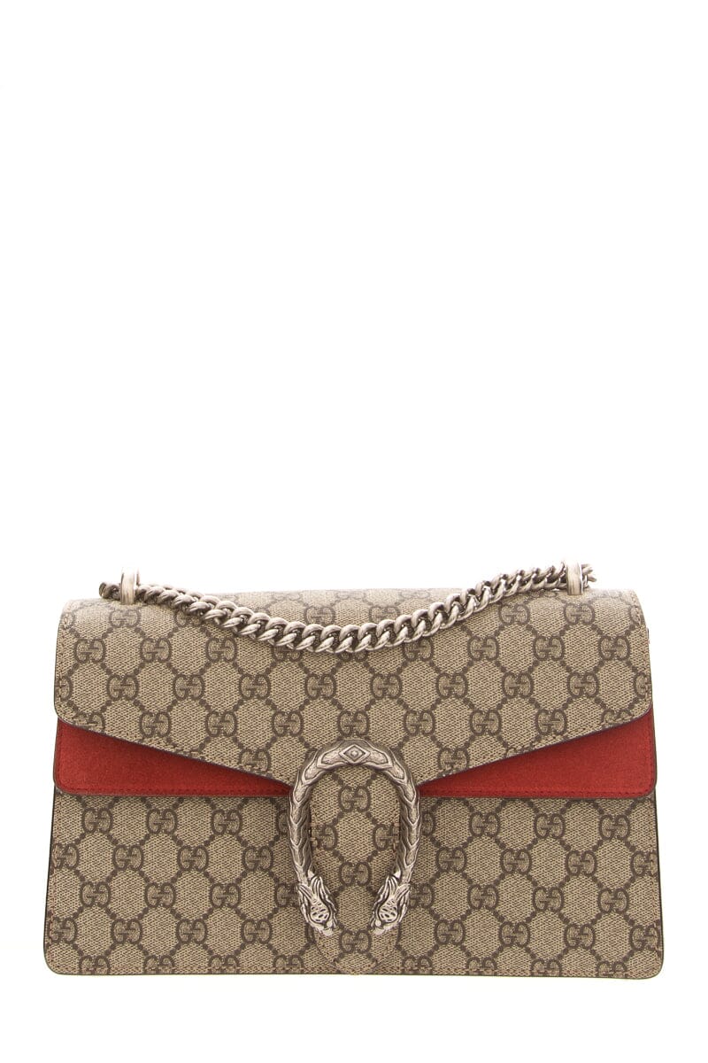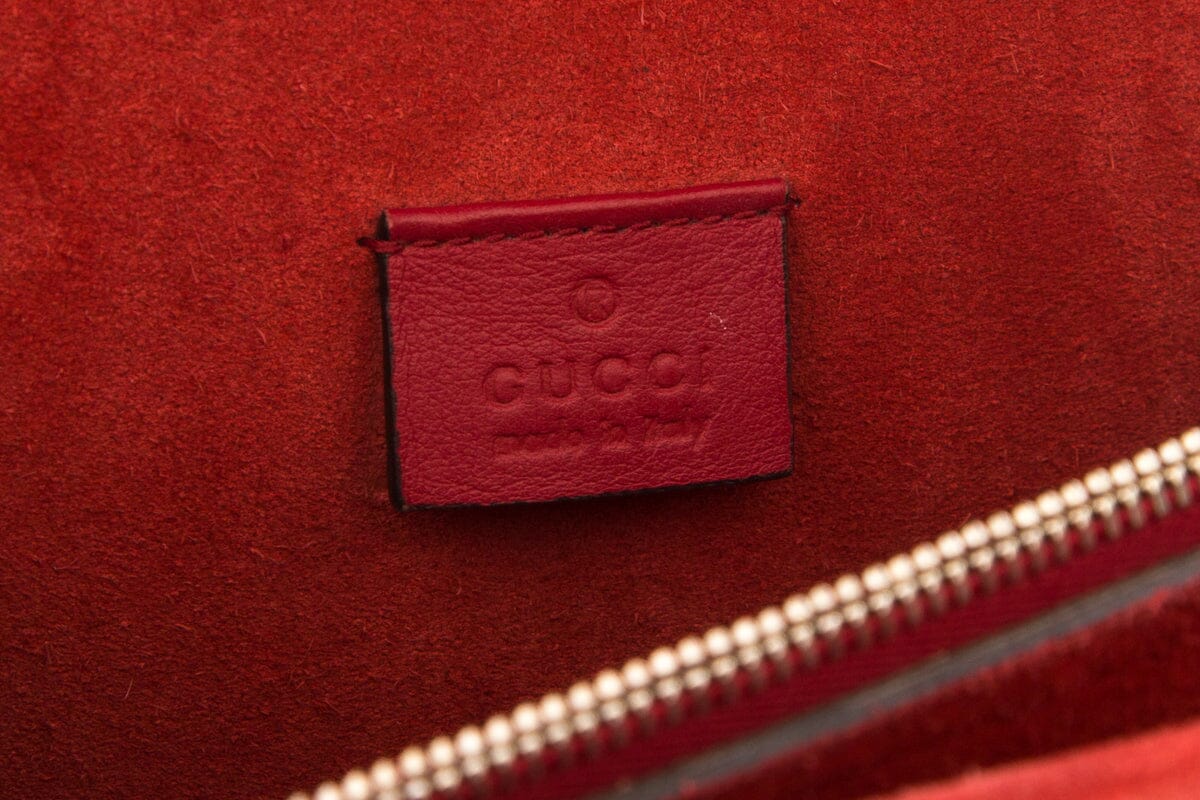 Gucci Dionysus Monogram With Red Suede Contrast Cross-Body W/ Silvertone Hardware. This item is in good condition with some wear to suede on interior.