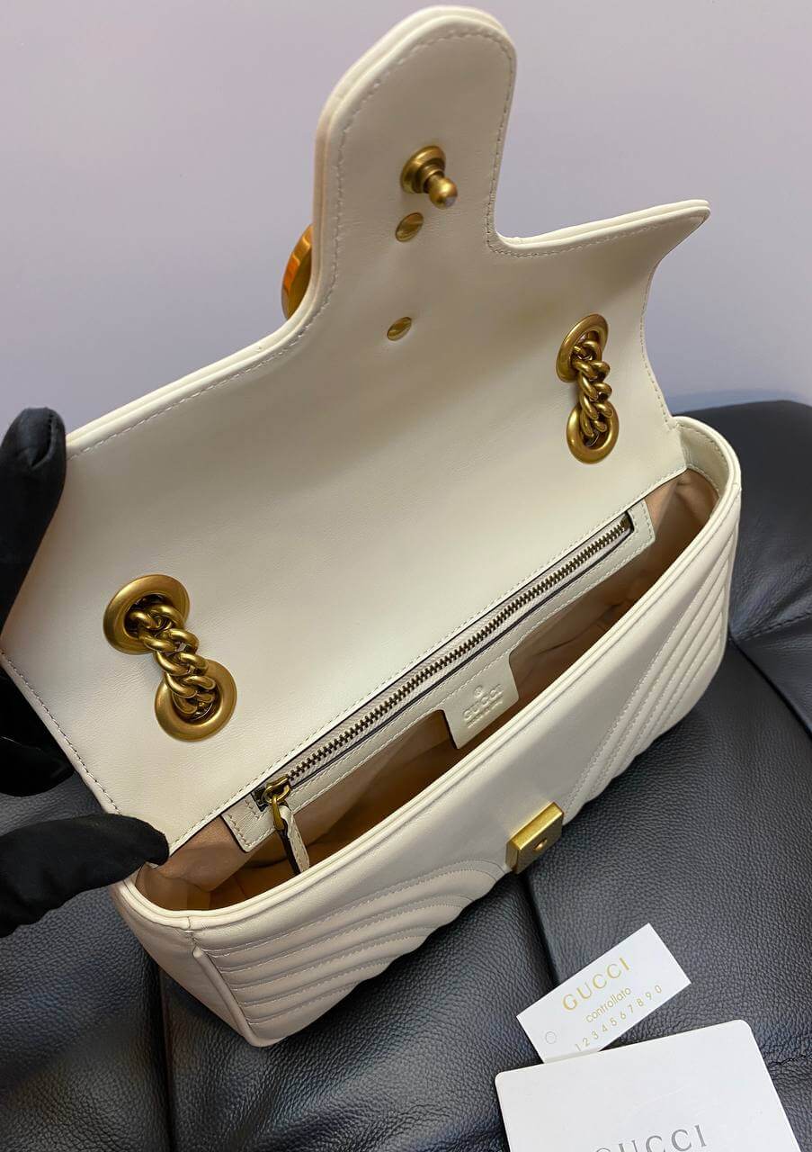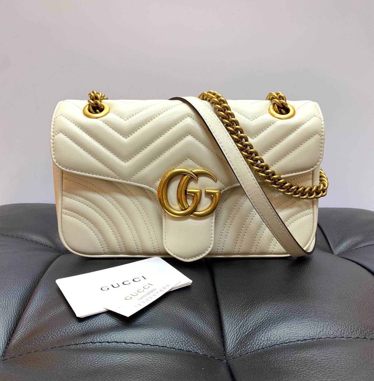 Gucci's GG Marmont bag is a refined everyday staple. It's crafted in Italy from black chevron-quilted leather, with the original 1933 gold-tone GG logo plaque and chain. On the back, a tonal heart is discreetly stitched into the leather – a detail lifted from the house archives. Carry it alongside feminine tailoring during the week.