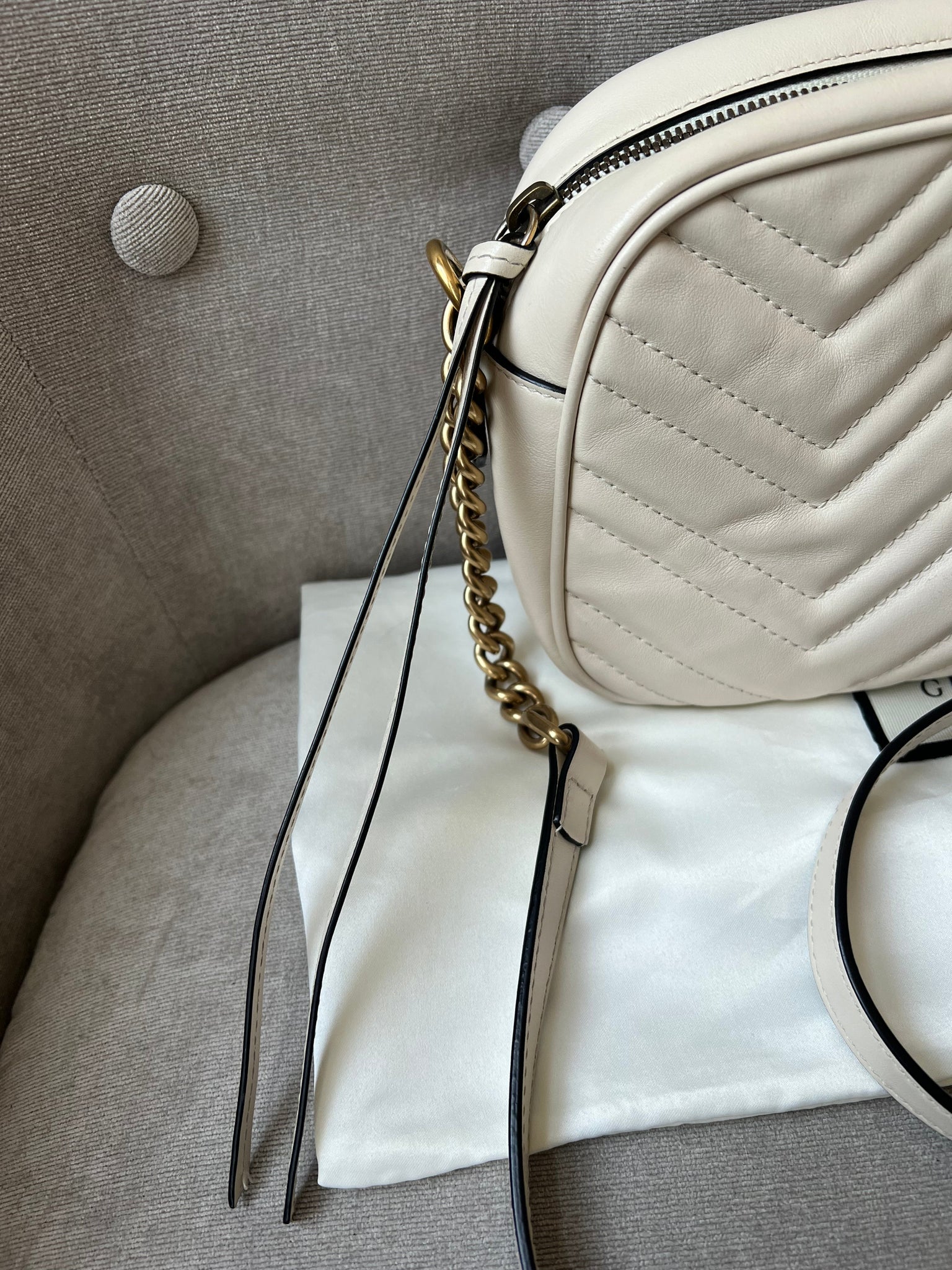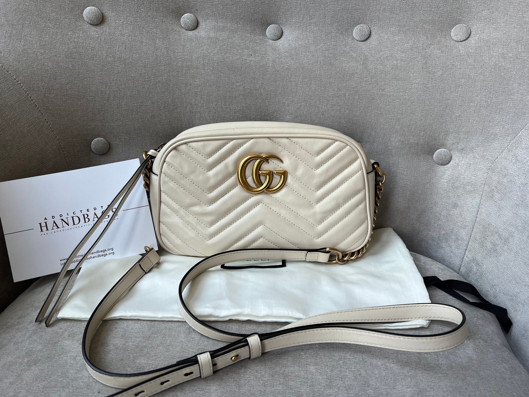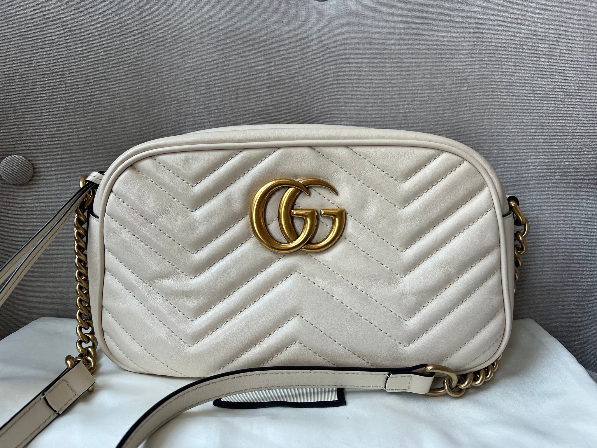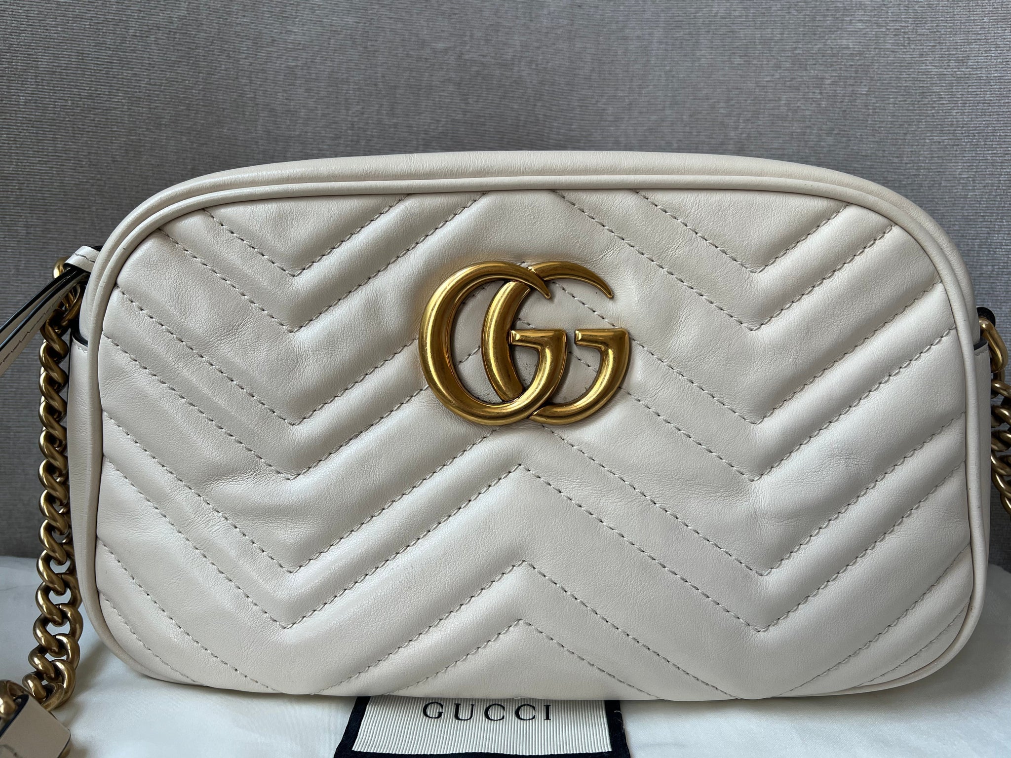 Gucci GG Marmont small shoulder bag in white chevron matelassé leather with gold hardware. This small Marmont chain camera style bag has a softly structured shape and zip top closure. Effortlessly chic and sophisticated, this style can be both with a casual outfit or for evening wear. Suitable for both day to day or occasion wear and ideal for those who prefer a cross body option. Although termed "white", the colour is a pale cream.
