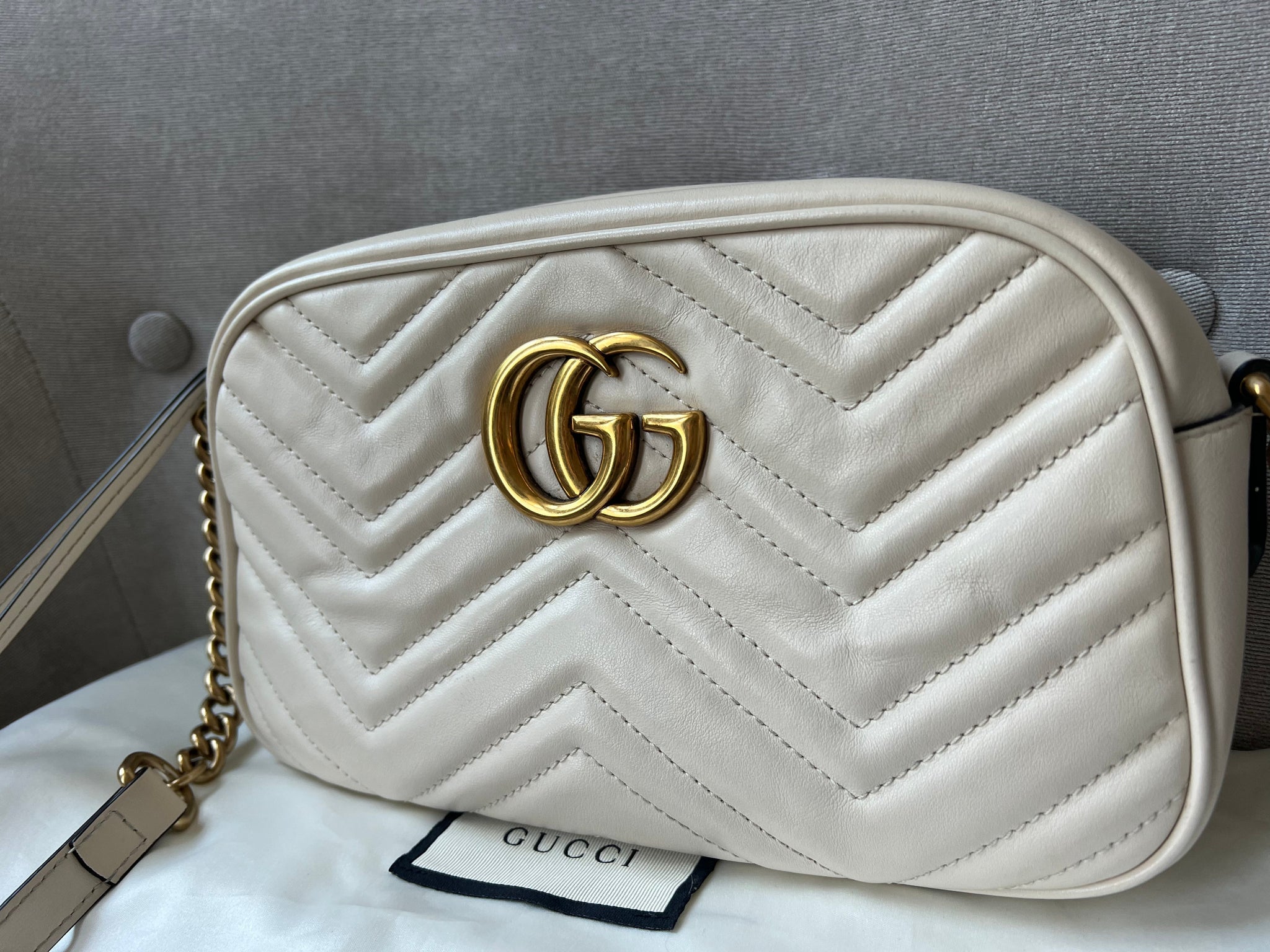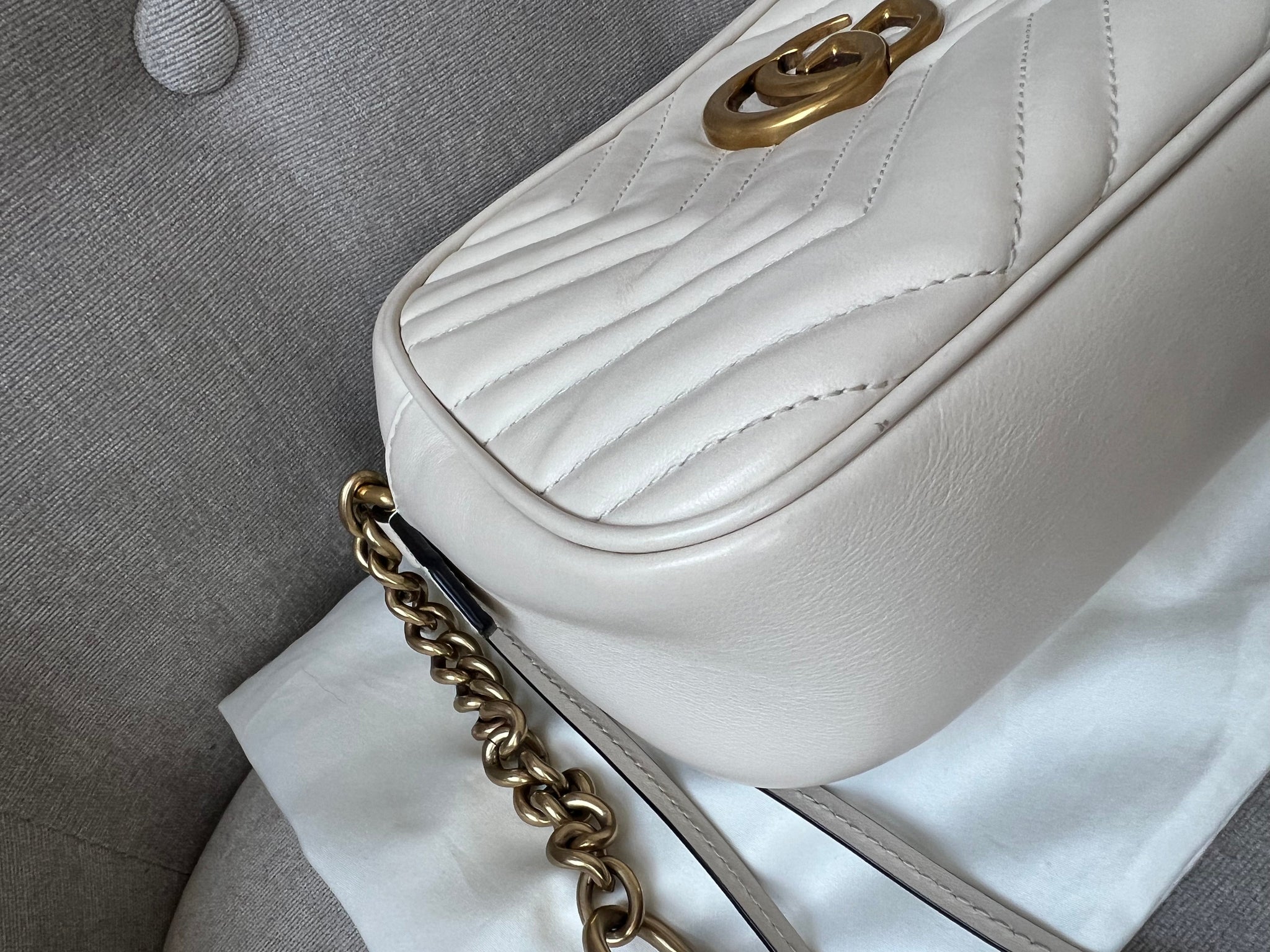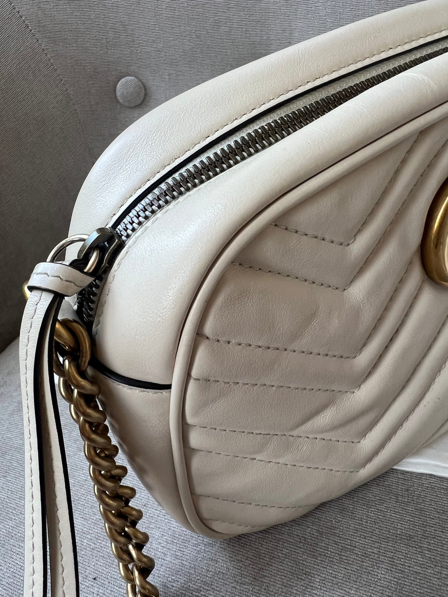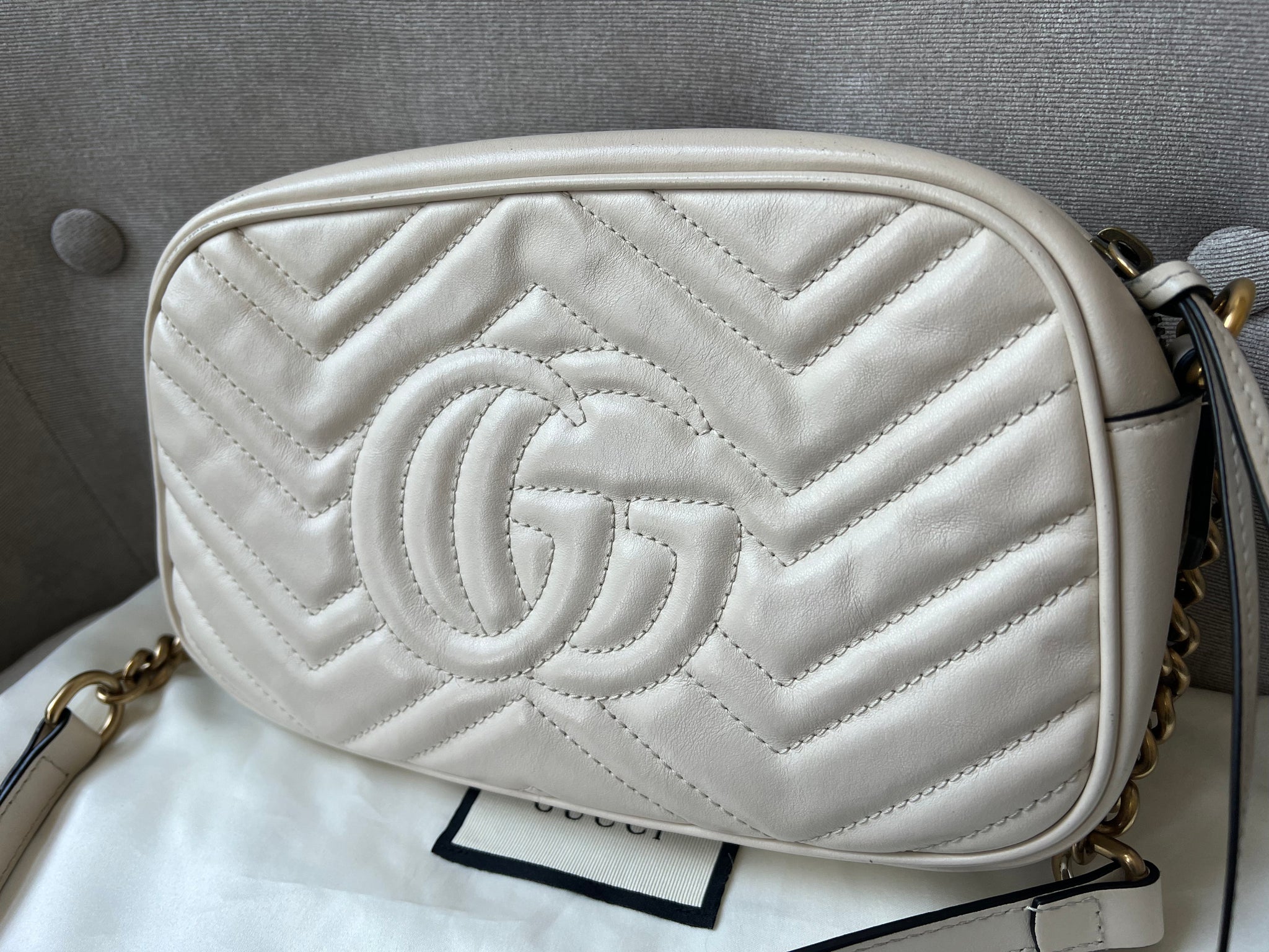 Gucci GG Marmont small shoulder bag in white chevron matelassé leather with gold hardware. This small Marmont chain camera style bag has a softly structured shape and zip top closure. Effortlessly chic and sophisticated, this style can be both with a casual outfit or for evening wear. Suitable for both day to day or occasion wear and ideal for those who prefer a cross body option. Although termed "white", the colour is a pale cream.