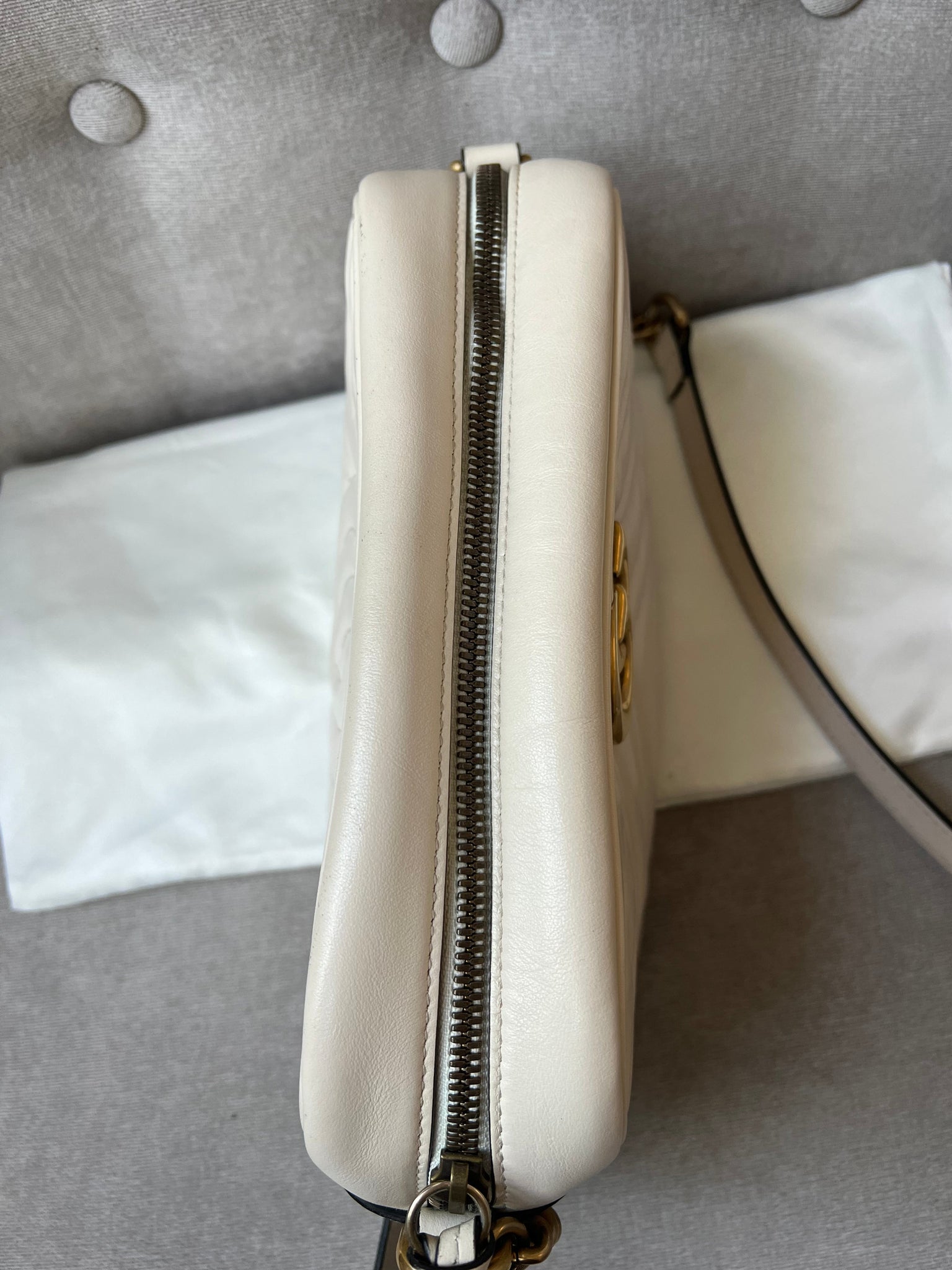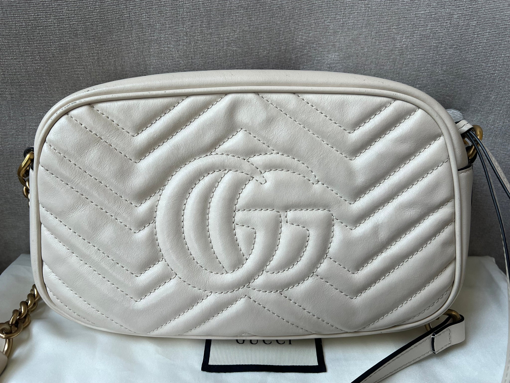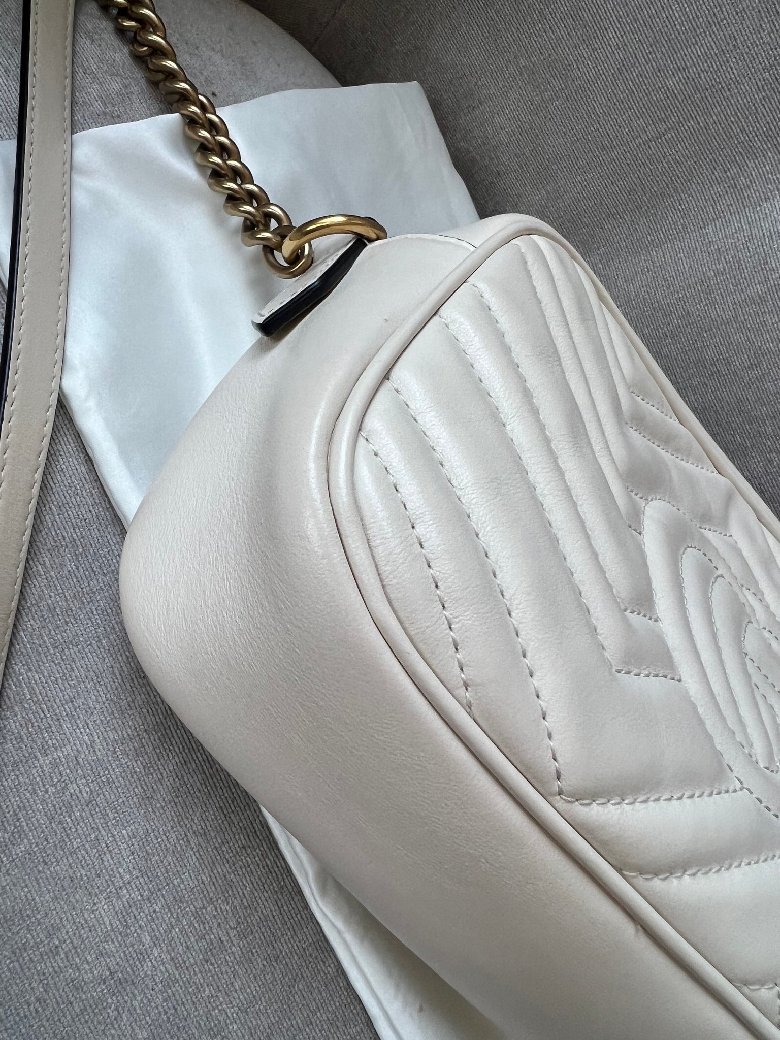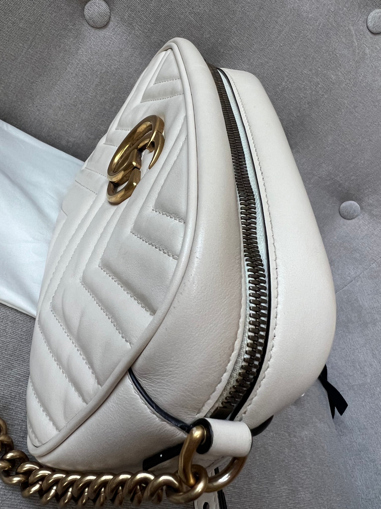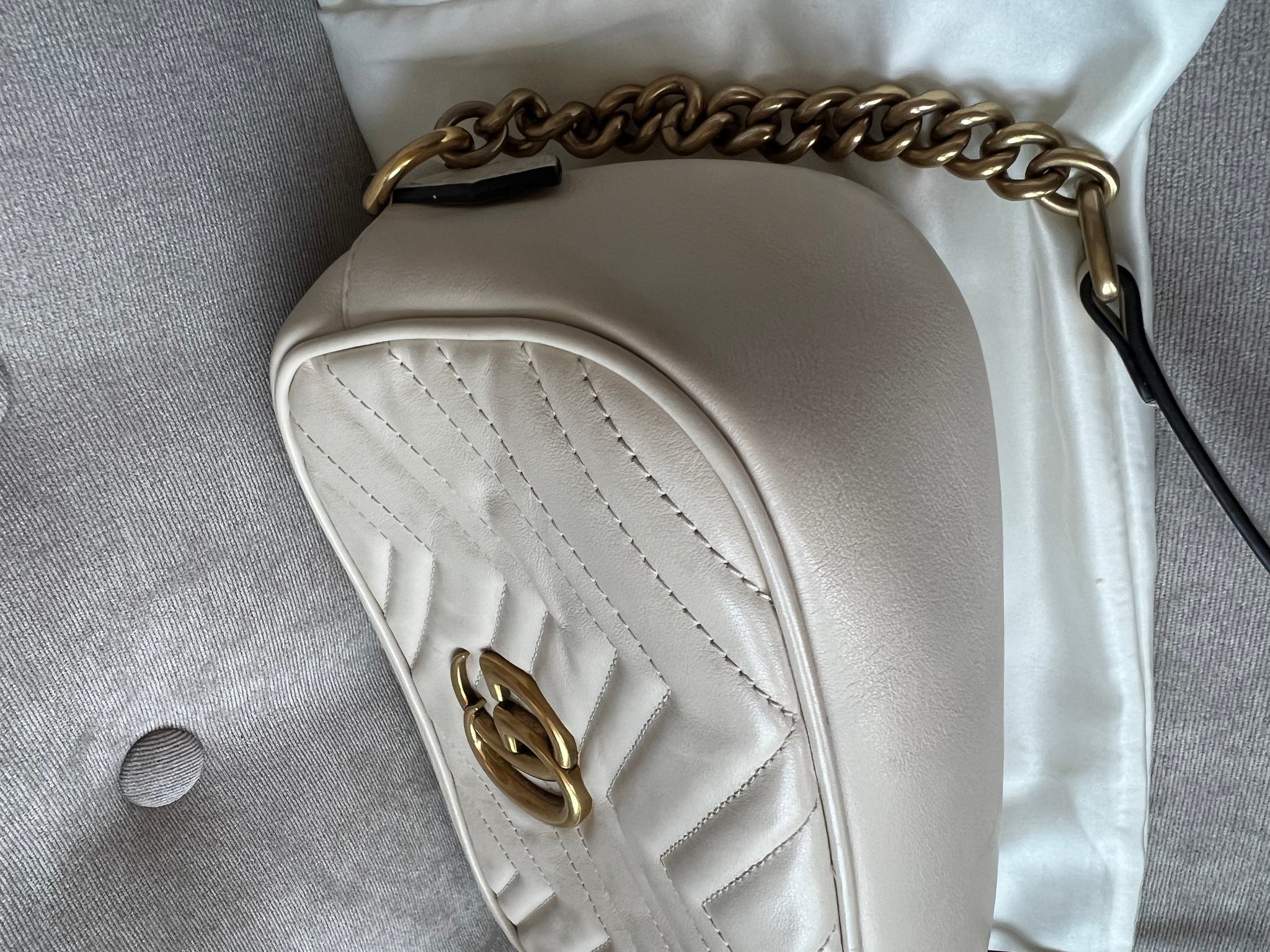 Gucci GG Marmont small shoulder bag in white chevron matelassé leather with gold hardware. This small Marmont chain camera style bag has a softly structured shape and zip top closure. Effortlessly chic and sophisticated, this style can be both with a casual outfit or for evening wear. Suitable for both day to day or occasion wear and ideal for those who prefer a cross body option. Although termed "white", the colour is a pale cream.