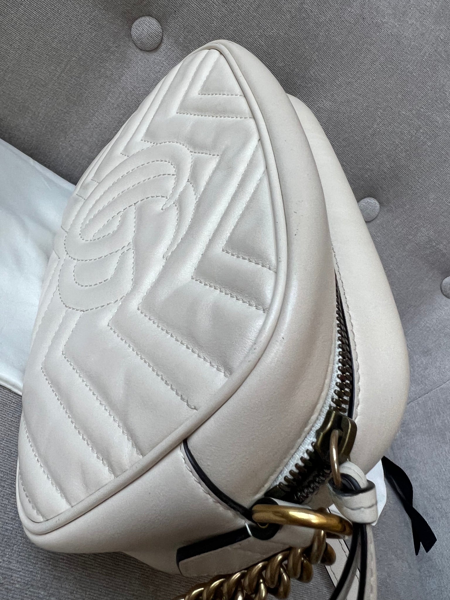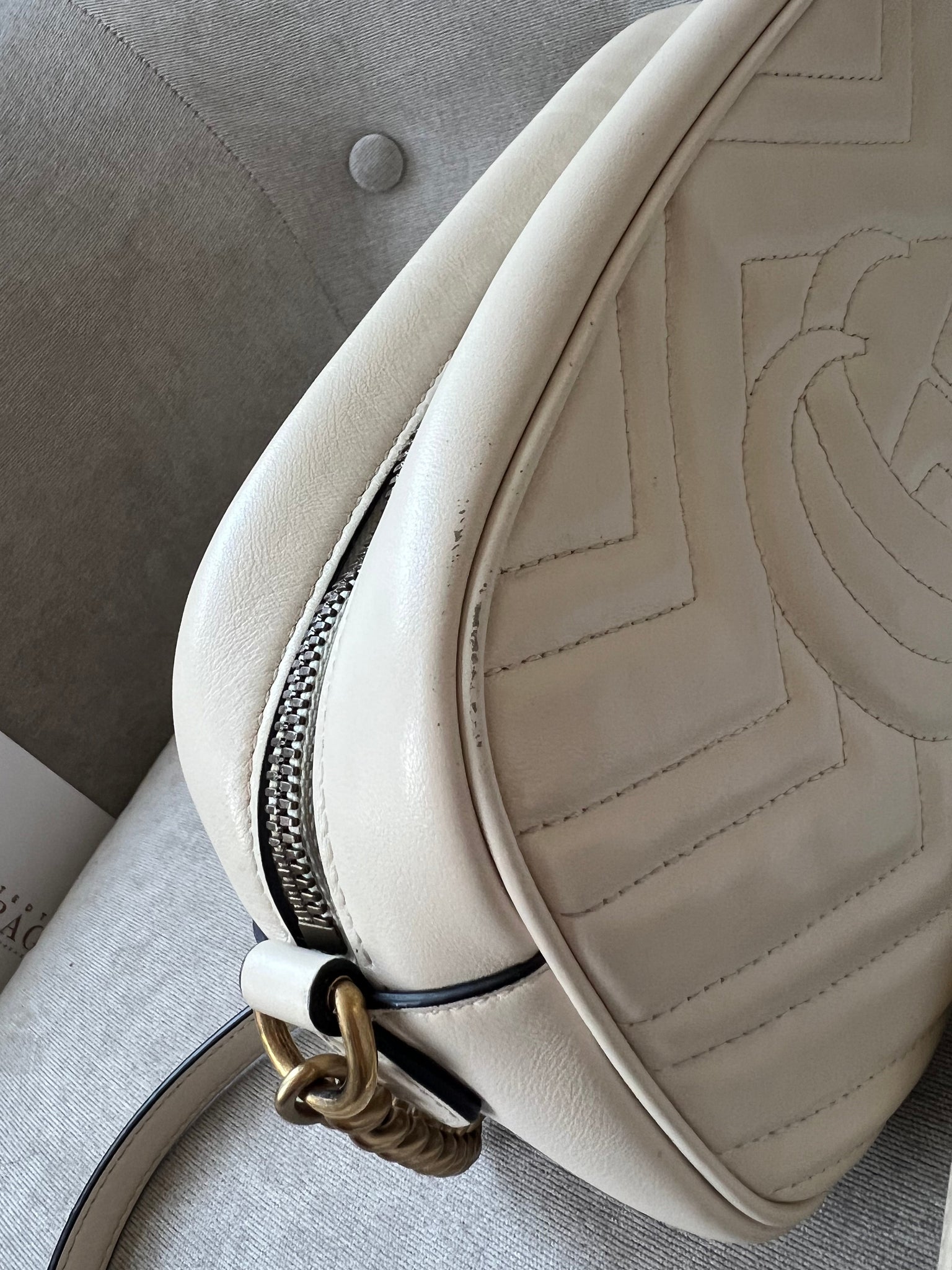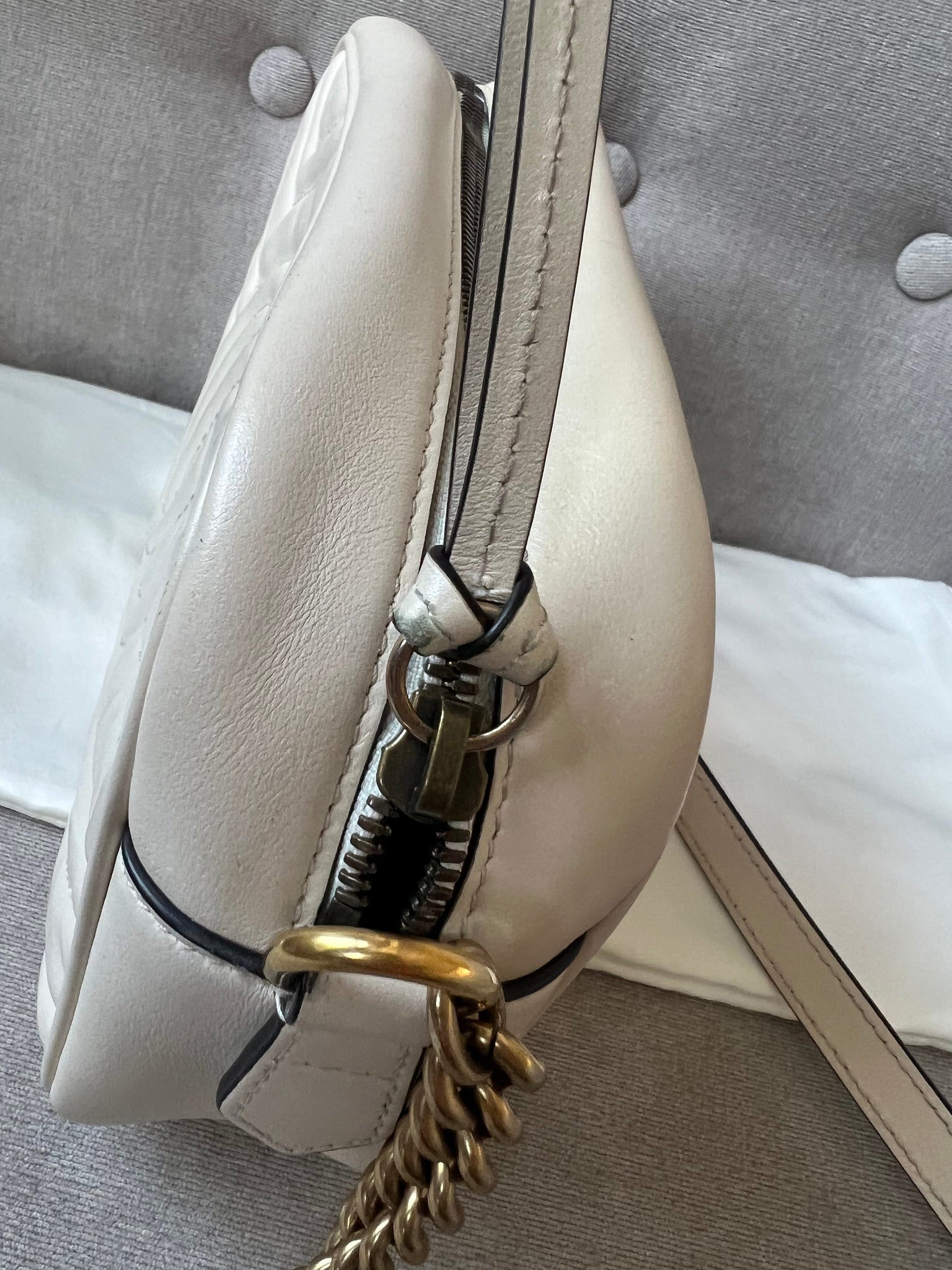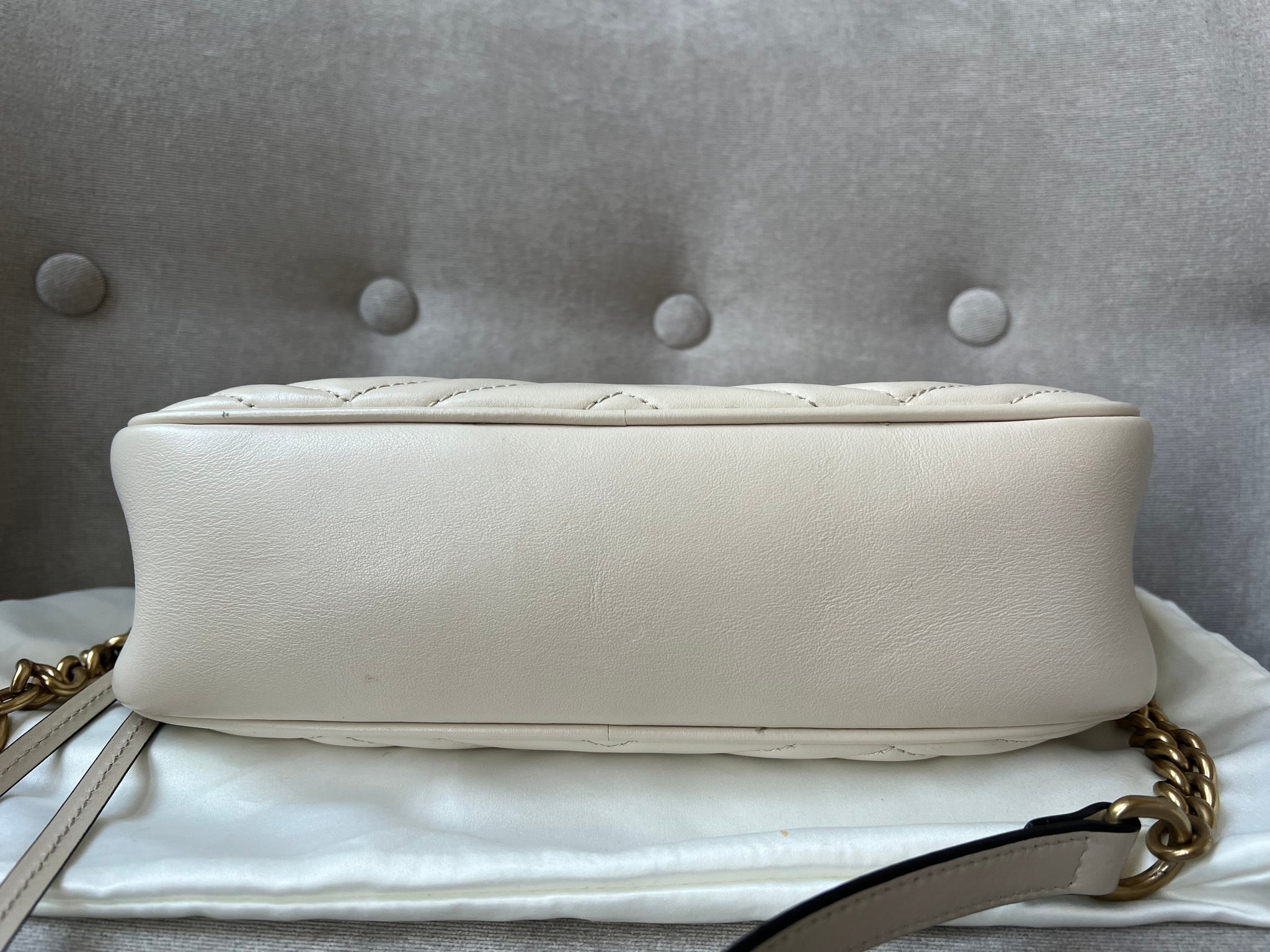 Gucci GG Marmont small shoulder bag in white chevron matelassé leather with gold hardware. This small Marmont chain camera style bag has a softly structured shape and zip top closure. Effortlessly chic and sophisticated, this style can be both with a casual outfit or for evening wear. Suitable for both day to day or occasion wear and ideal for those who prefer a cross body option. Although termed "white", the colour is a pale cream.