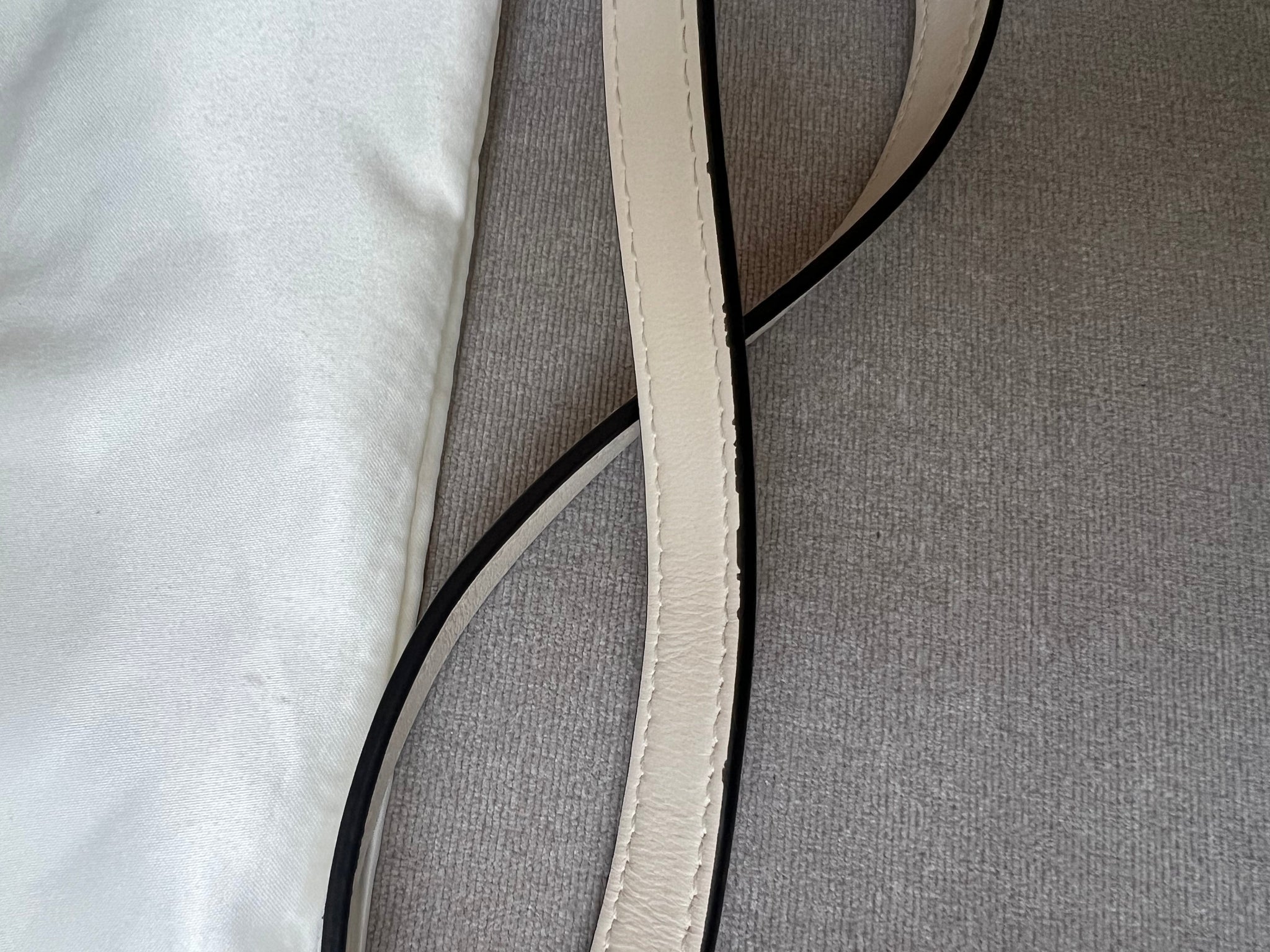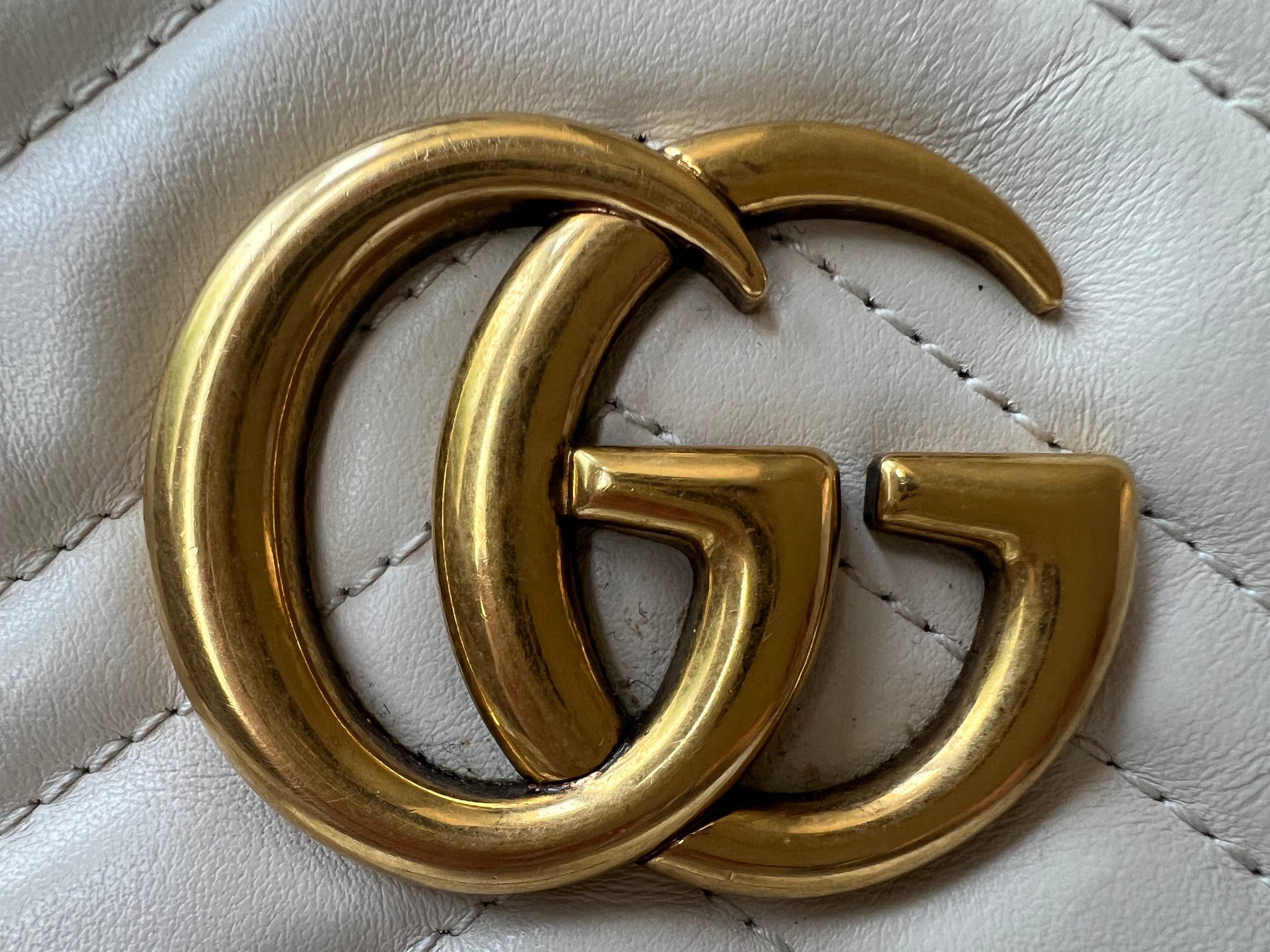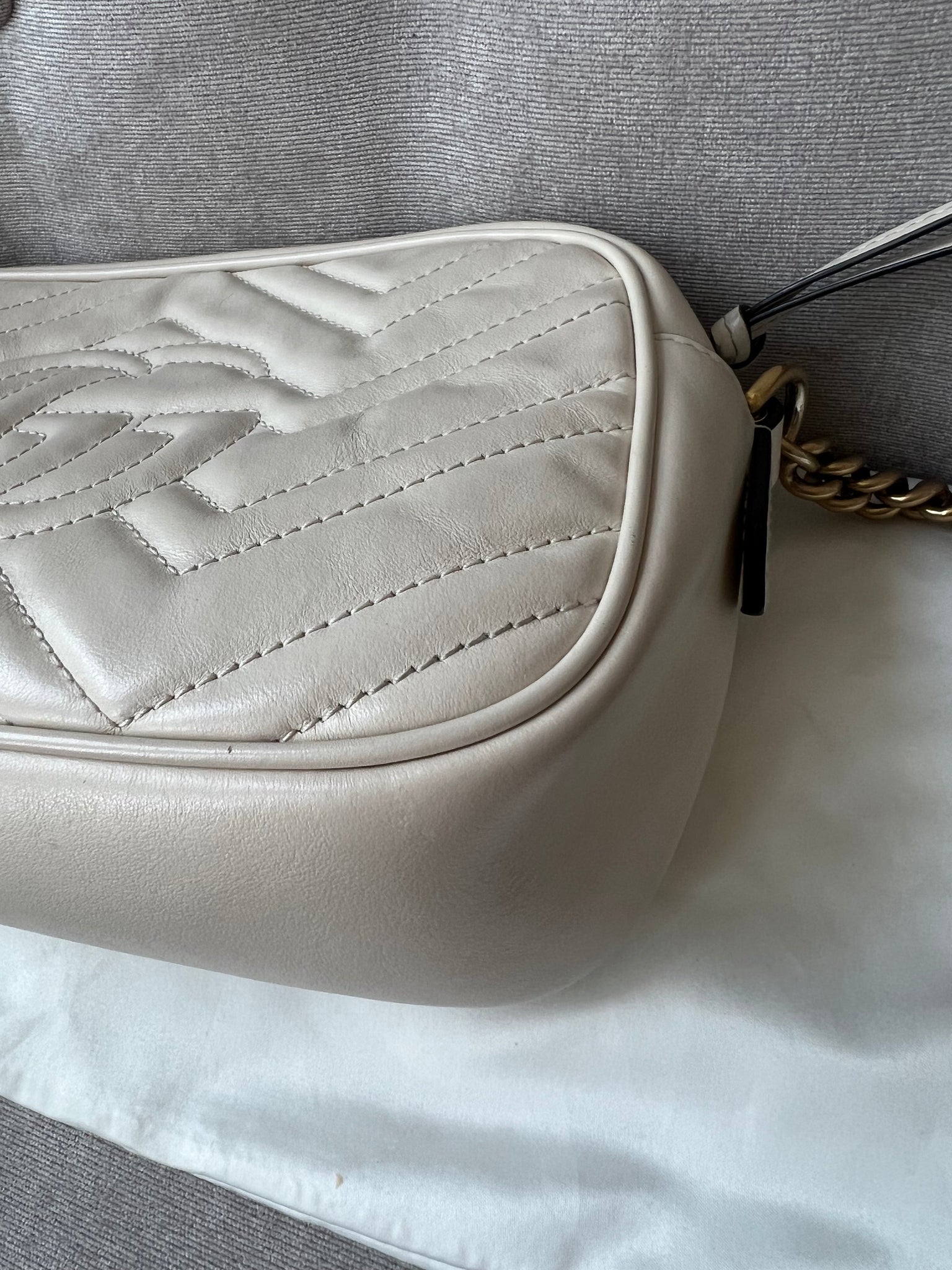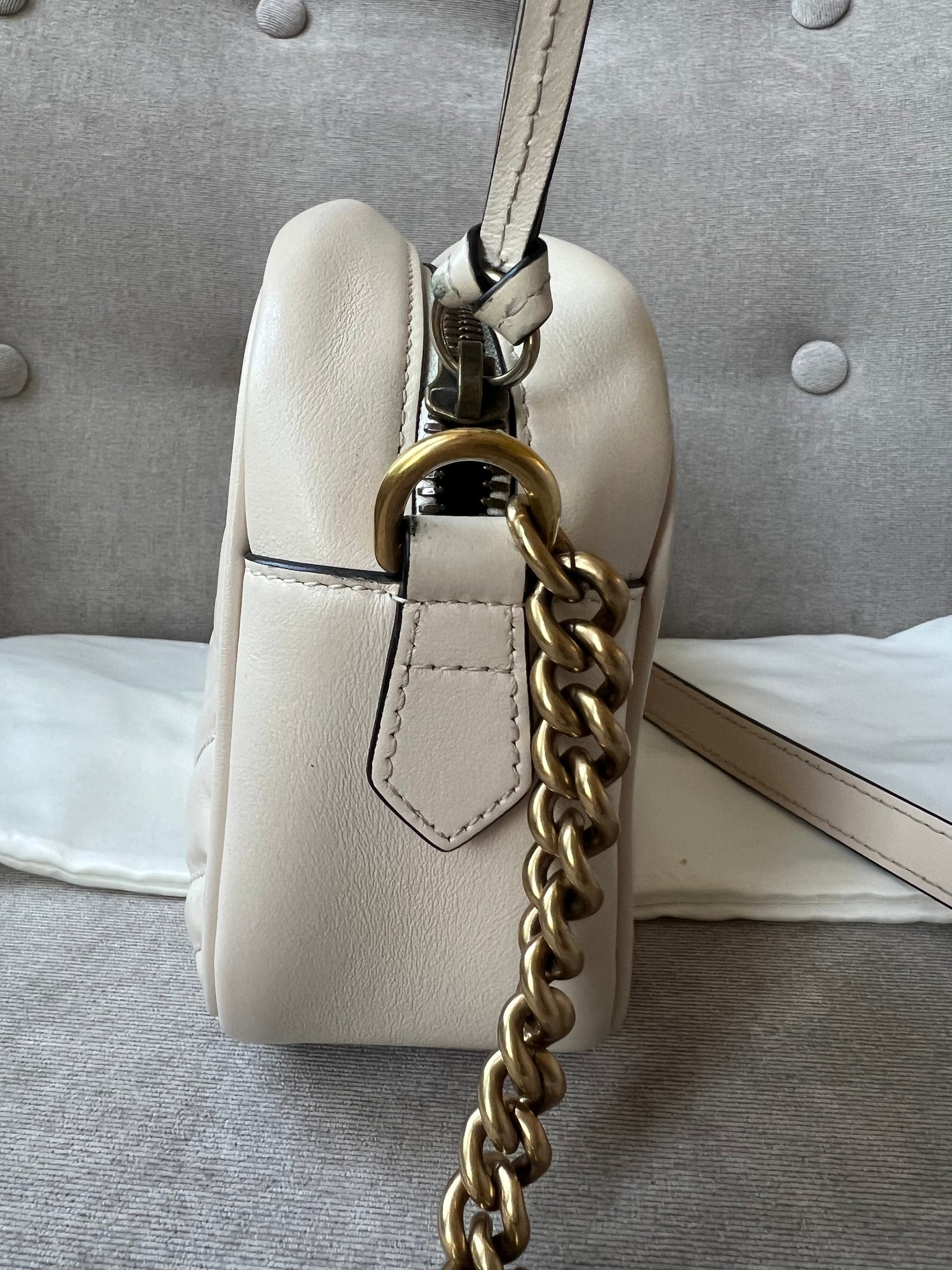 Gucci GG Marmont small shoulder bag in white chevron matelassé leather with gold hardware. This small Marmont chain camera style bag has a softly structured shape and zip top closure. Effortlessly chic and sophisticated, this style can be both with a casual outfit or for evening wear. Suitable for both day to day or occasion wear and ideal for those who prefer a cross body option. Although termed "white", the colour is a pale cream.