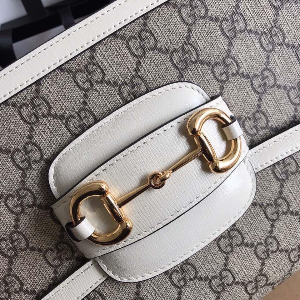 Petite versions of the Gucci Horsebit 1955 add a hybrid twist to the vintage inspired line. Enriched with two different shoulder straps, the mini bag’s character transforms from understated elegance with a tonal leather strap to a strong logo feel thanks to a red and green Web option. The accessory is presented in monogram canvas with a white leather trim.