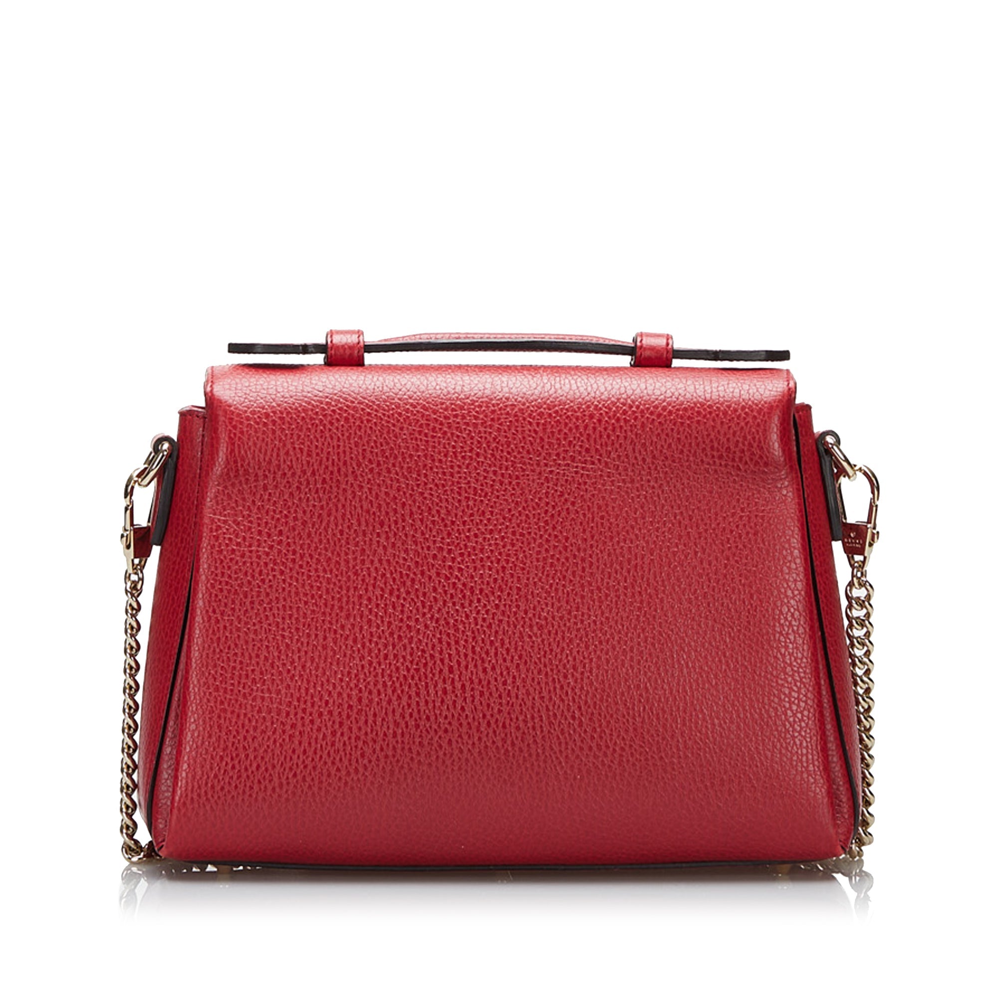 This Gucci Interlocking G Top Hand Bag in size Small is made of red grained leather. The Bag features a gold chain link shoulder strap, a flat leather handle, a front flap with a gold GG flip lock closure, and zippered and slip pockets inside. The Bag can be carried in the hand or loosely over the shoulder.