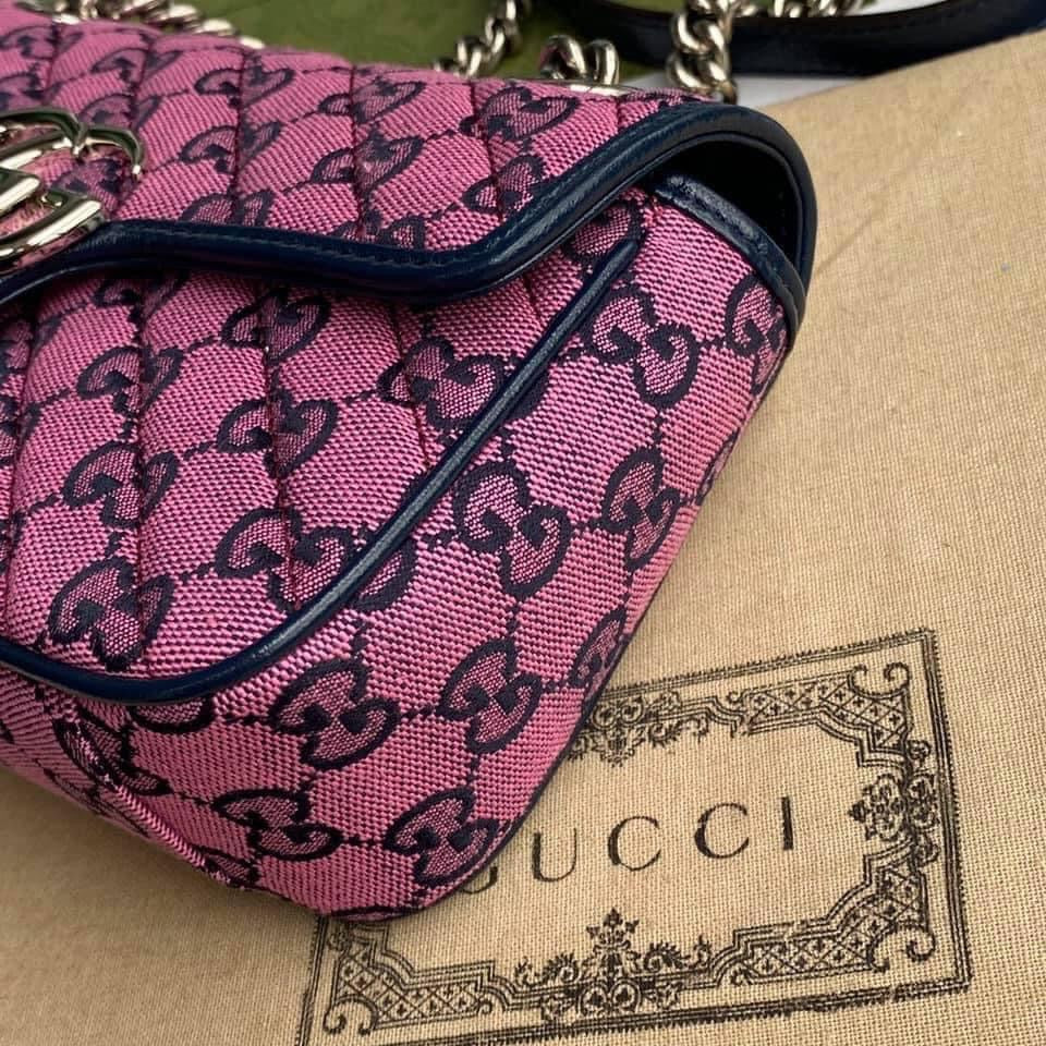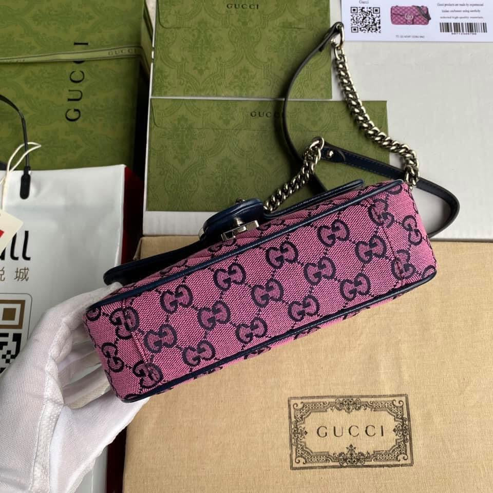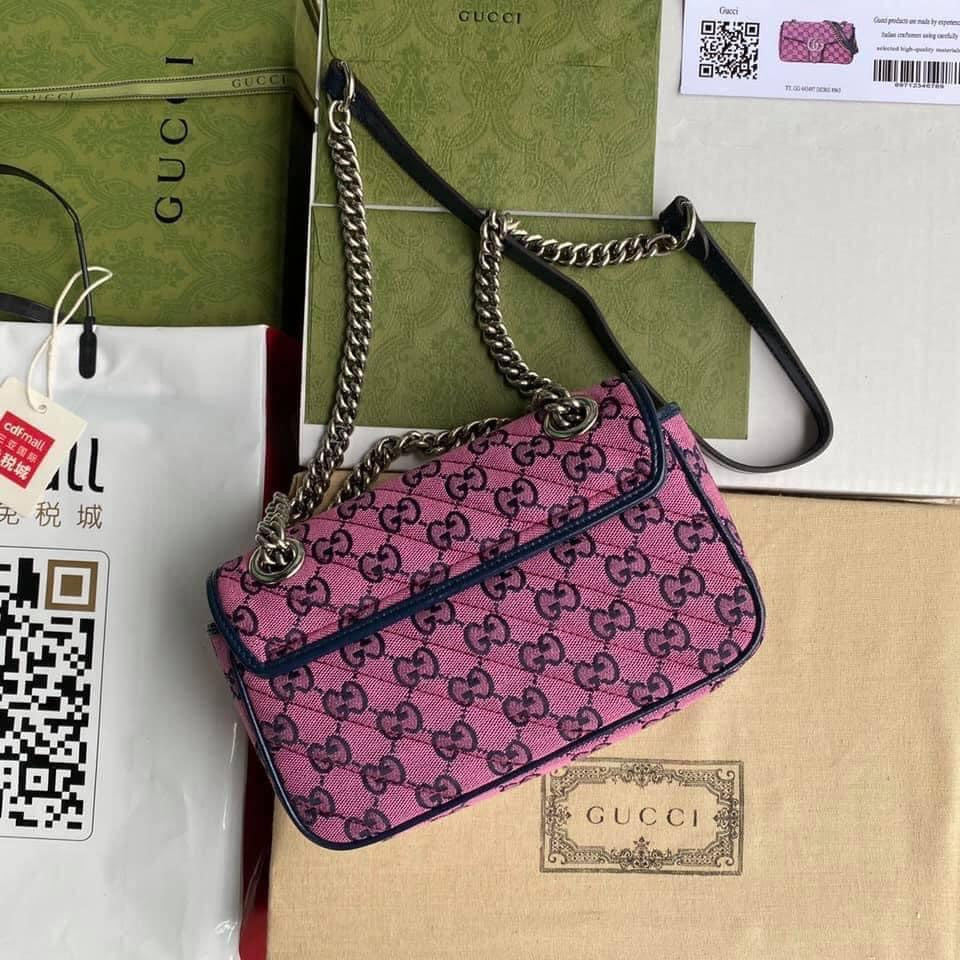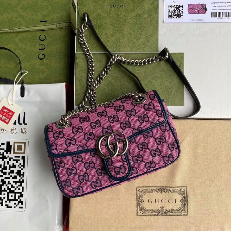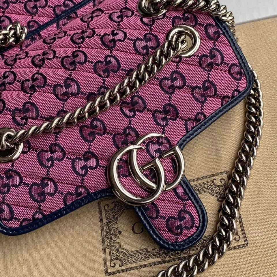 Gucci archives, various pieces throughout the collection provide a new lens through which to view the emblematic GG rhombi motif. Already an evolution of the House logo, it is once again reimagined in a series of bright colors—a theme that has become synonymous with the Creative Director’s vision. This GG Marmont small shoulder bag has an adjustable strap and is part of the GG Multicolor collection.