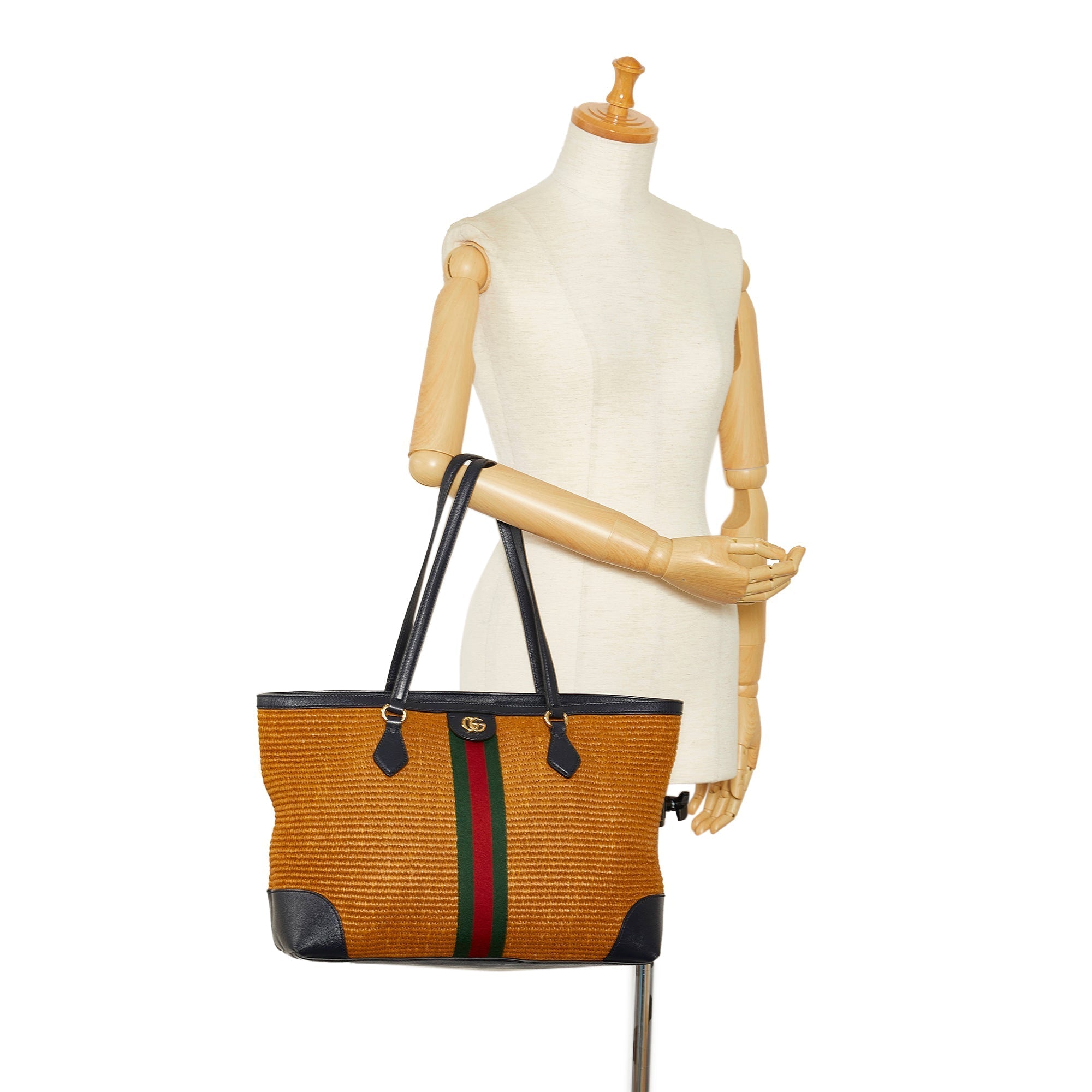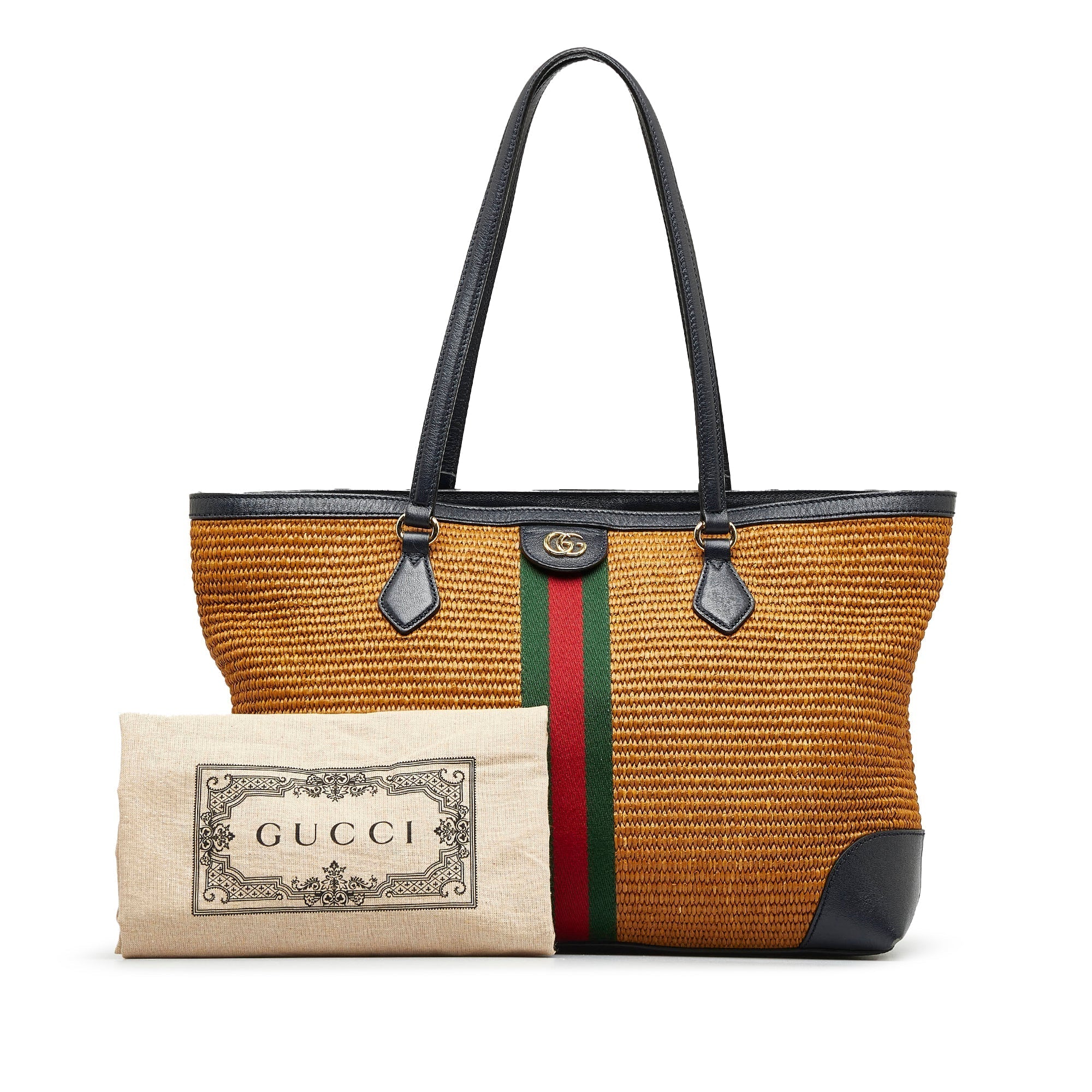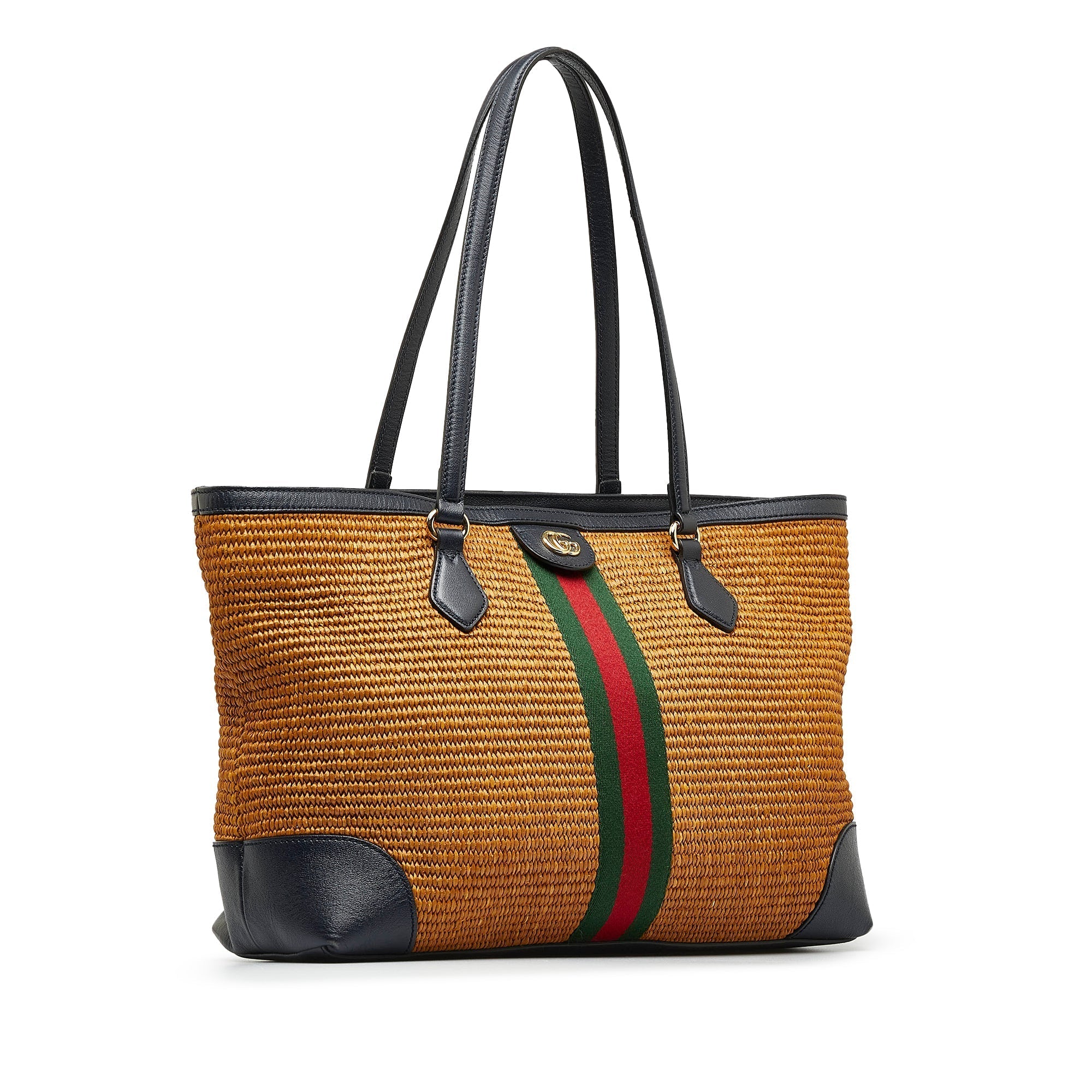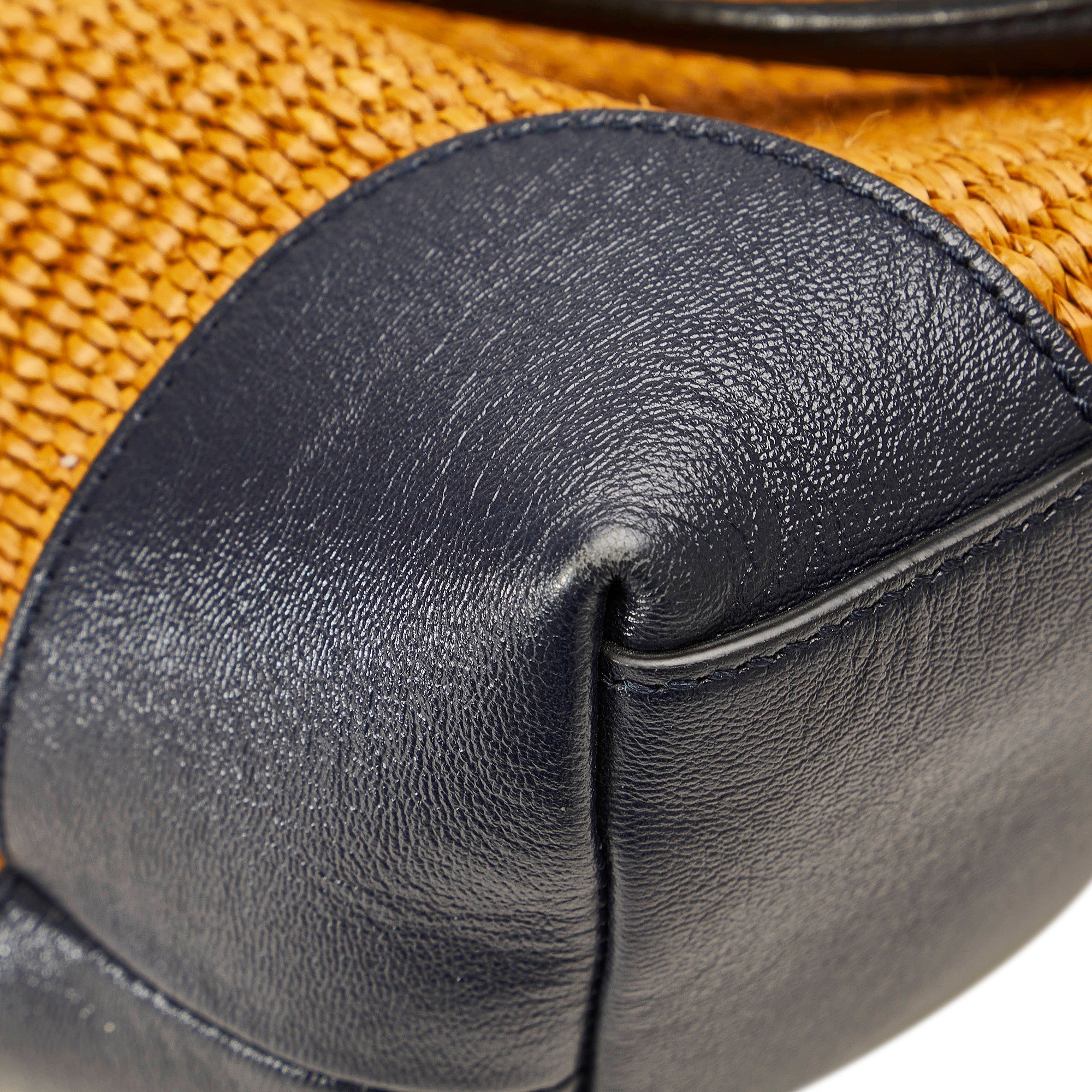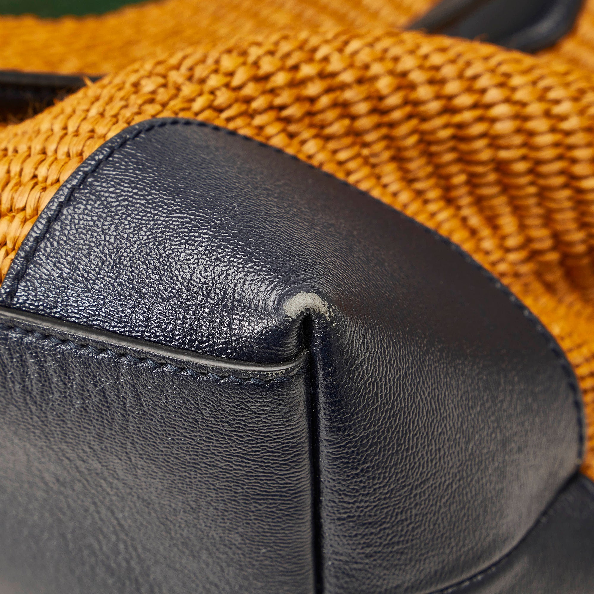 This tote bag features a raffia body with leather trim and web detail, flat leather shoulder straps, an open top with a magnetic snap button closure, and interior zip and slip pockets. Comes with dust bag