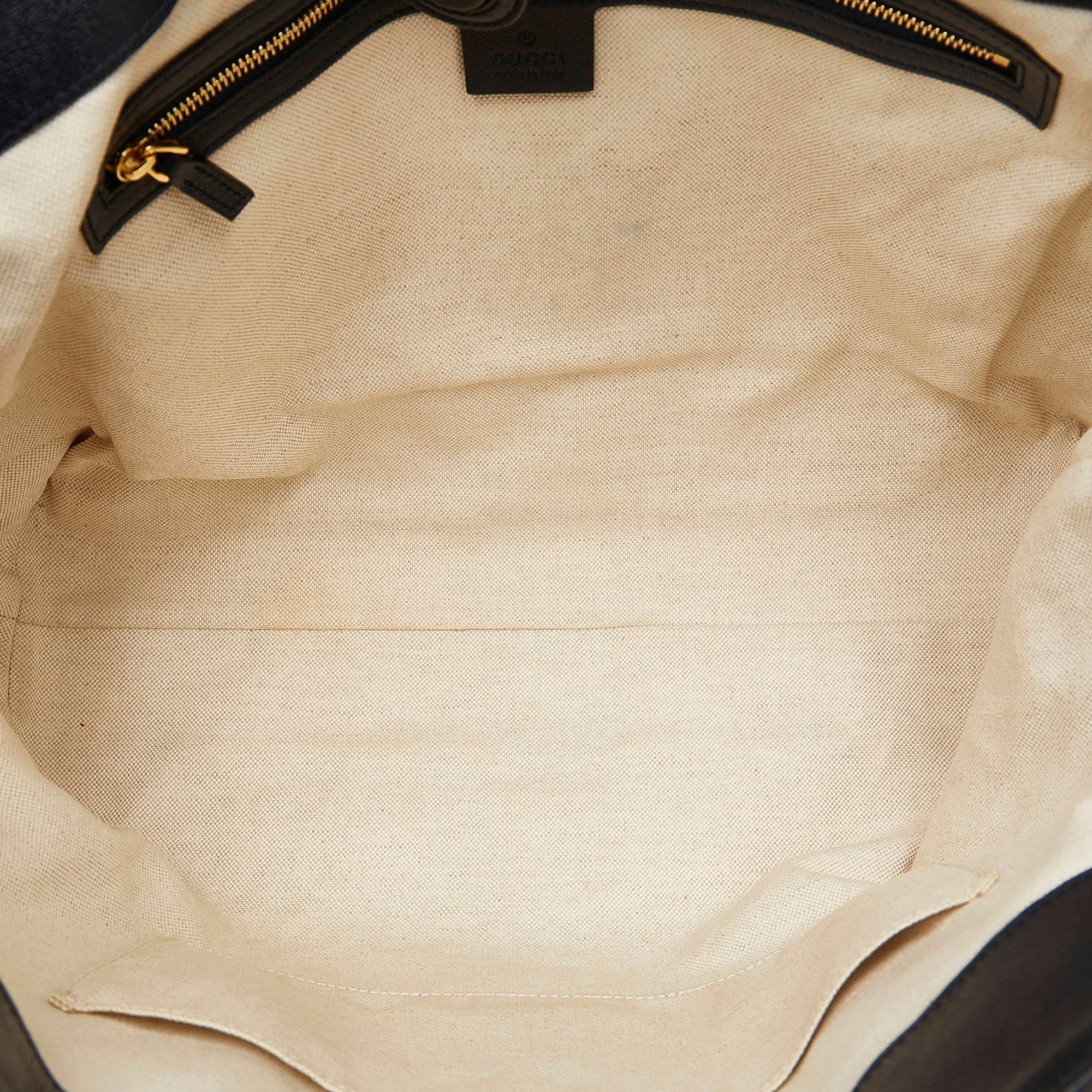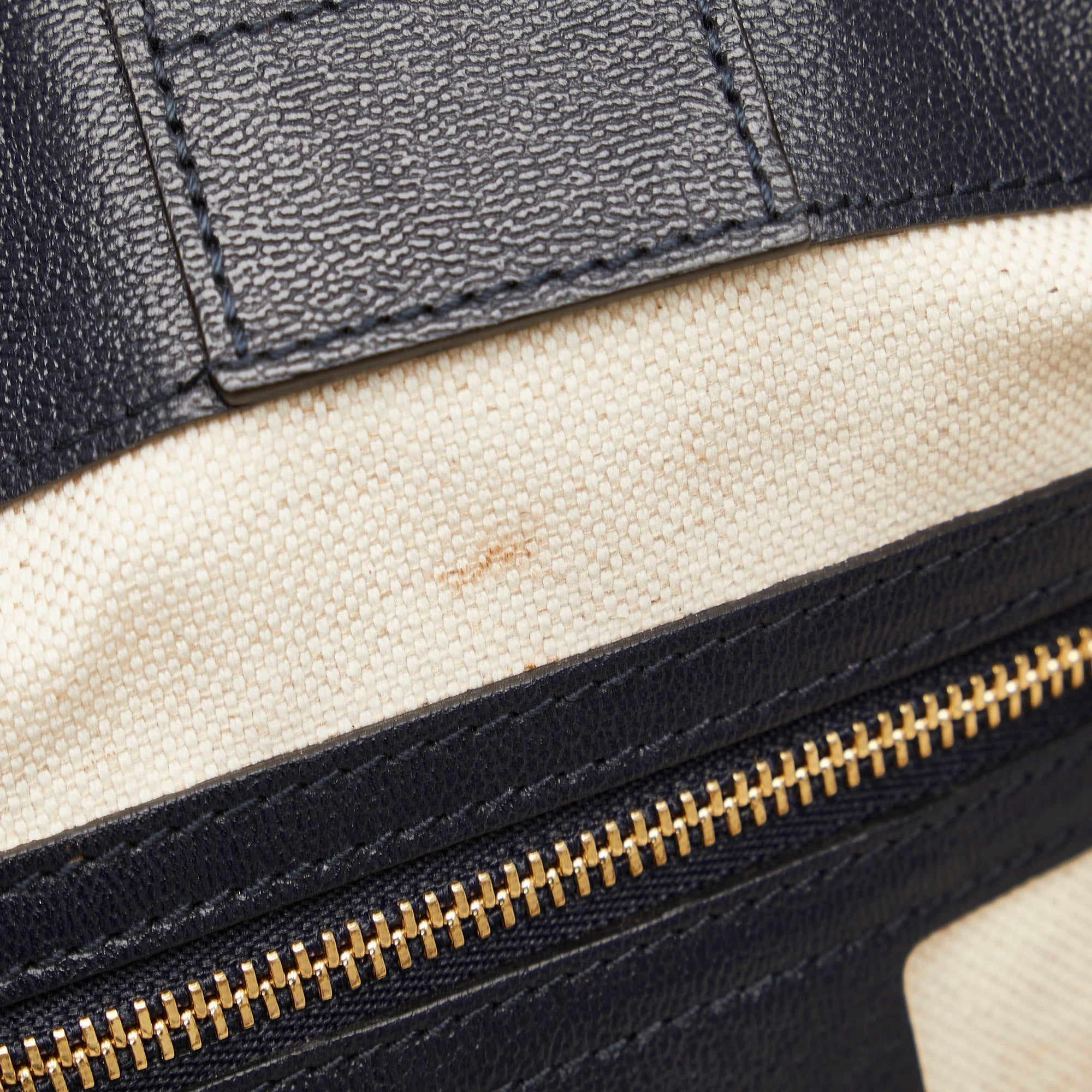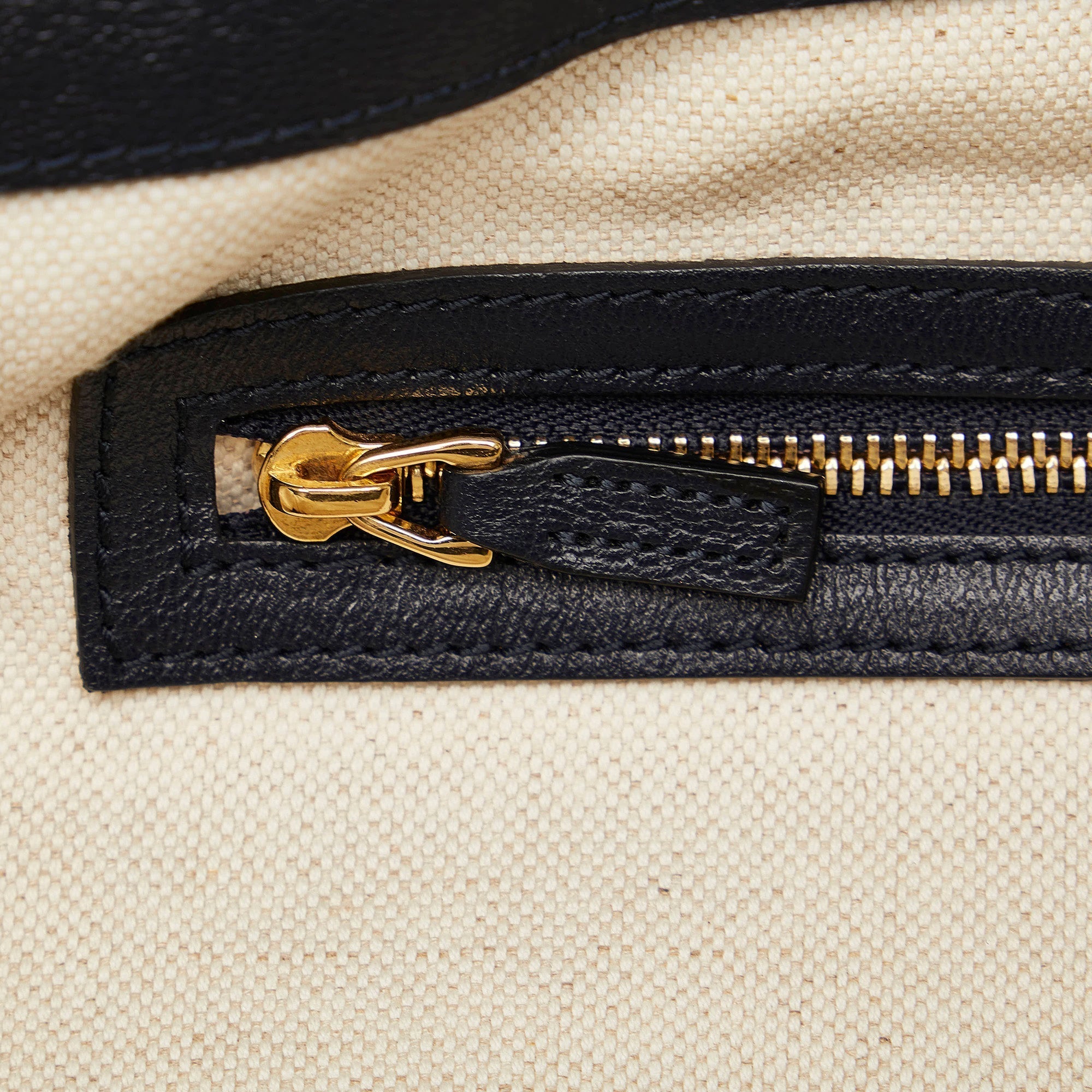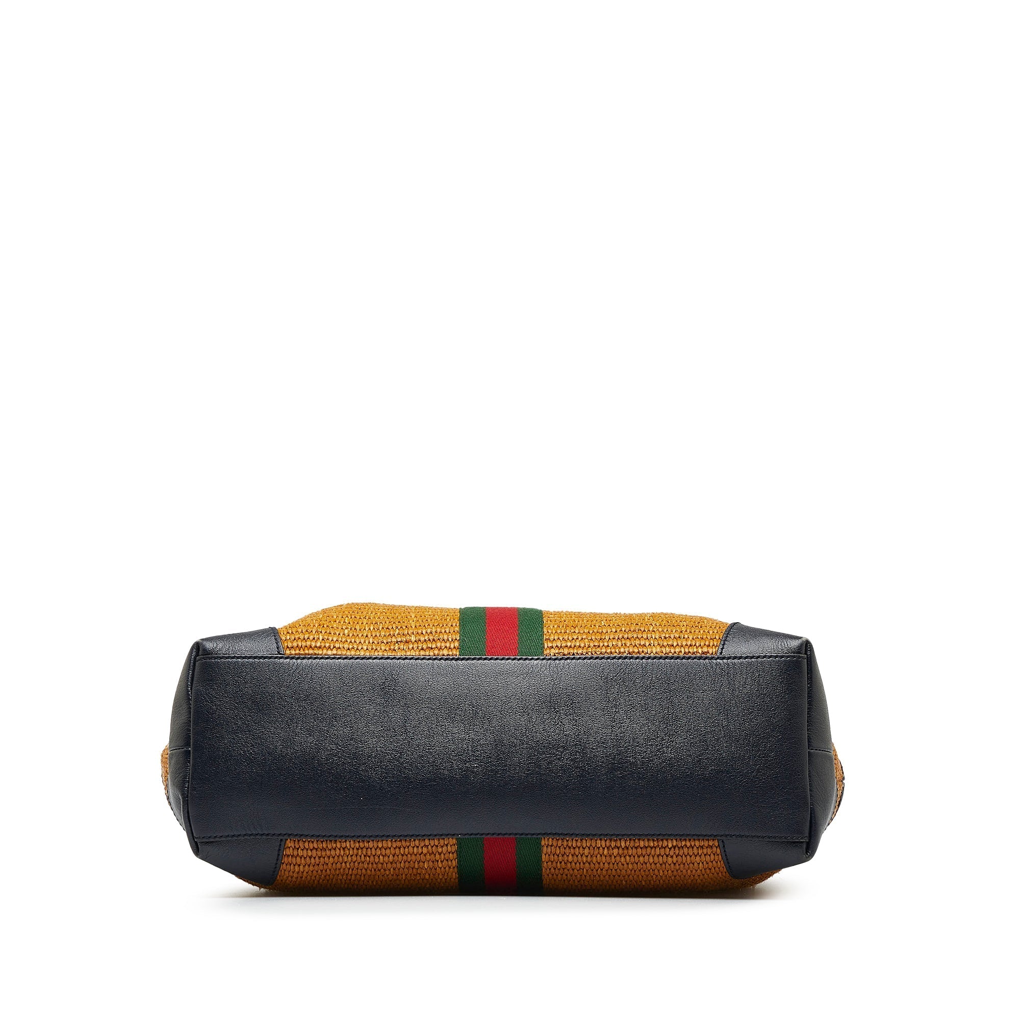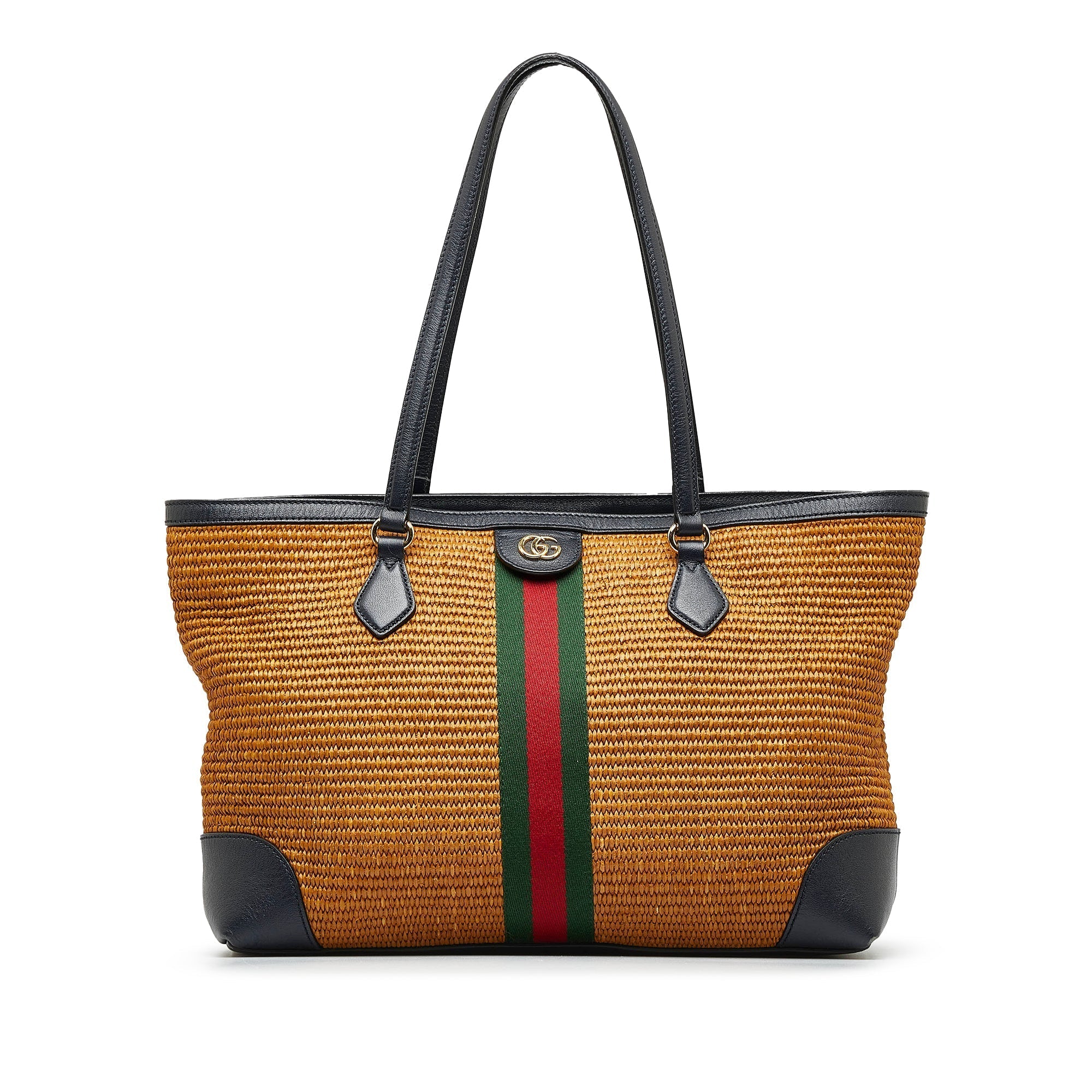This tote bag features a raffia body with leather trim and web detail, flat leather shoulder straps, an open top with a magnetic snap button closure, and interior zip and slip pockets. Comes with dust bag