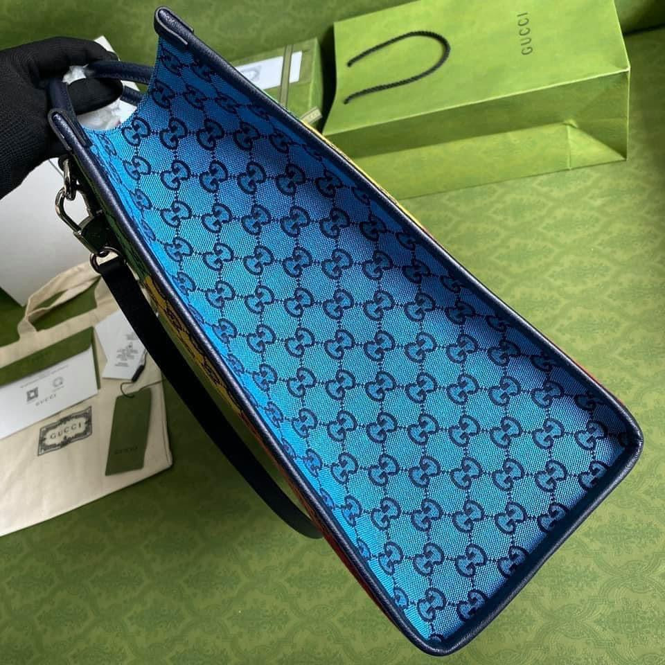 Embracing the new possibilities that lie within variations of the Gucci archives, various pieces throughout the collection provide a new lens through which to view the emblematic GG rhombi motif. Already an evolution of the House logo, it is once again reimagined in a series of bright colours—a theme that has become synonymous with the Creative Director’s vision. This large tote bag is part of the GG Multicolour collection.