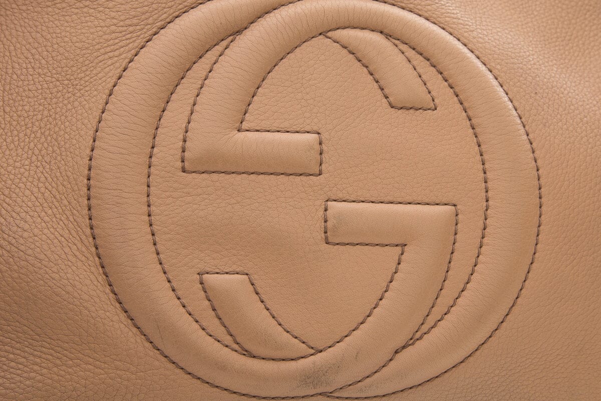 Gucci Nude Soho Handbag. This item is gently loved with some wear to edges throughout and discoloring on leather.