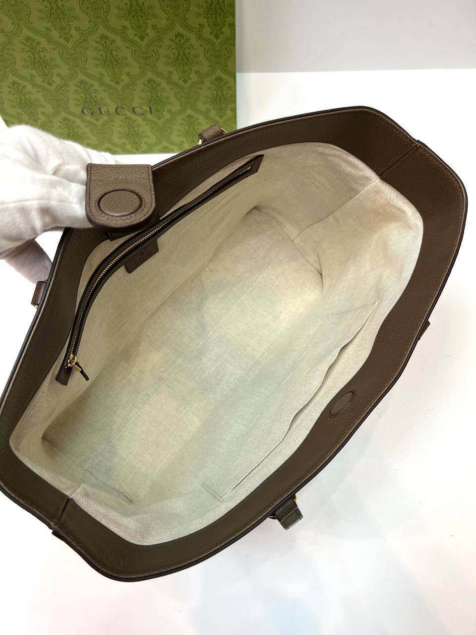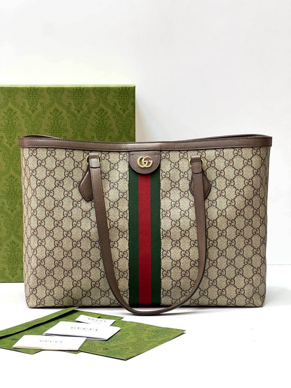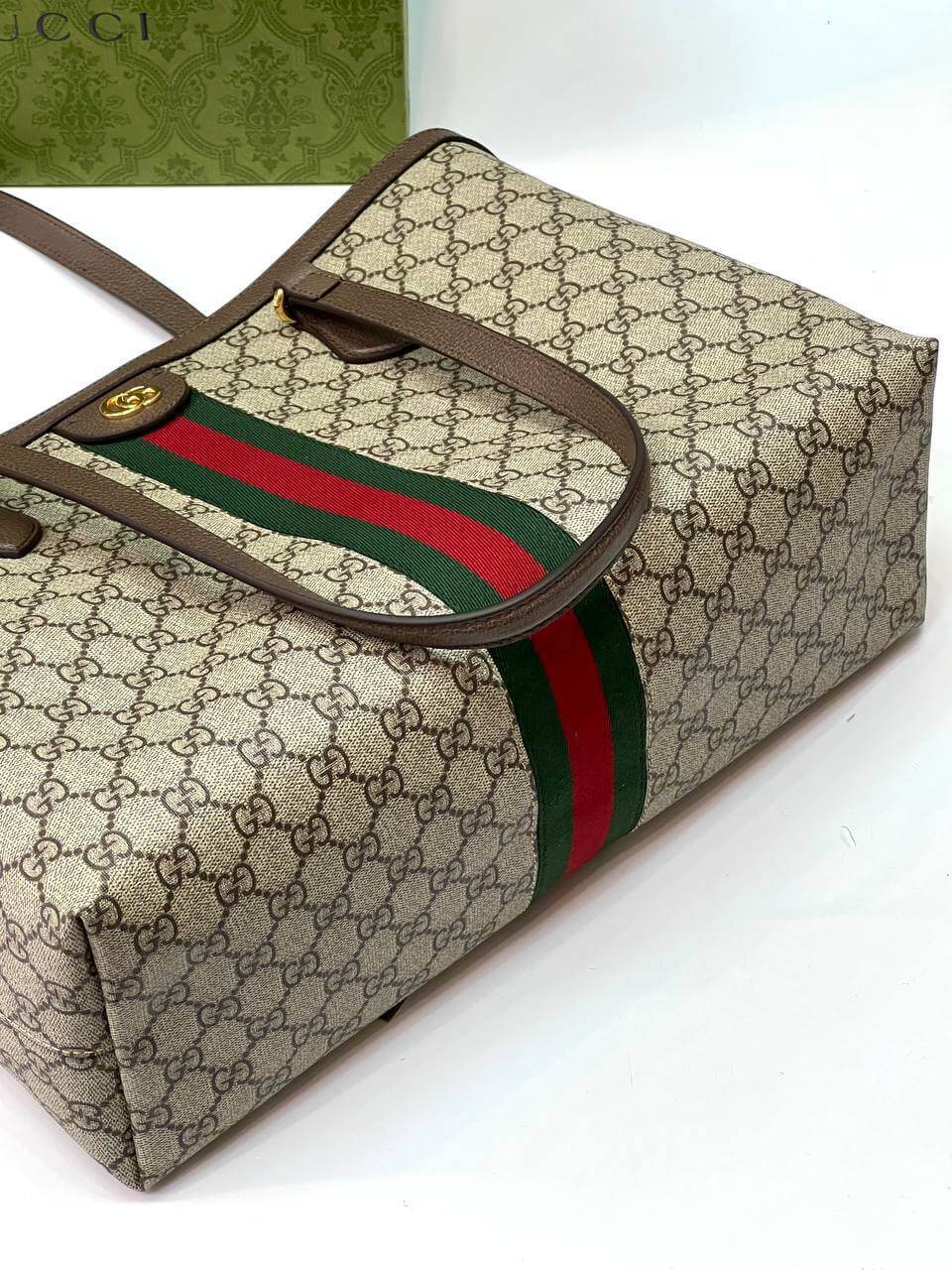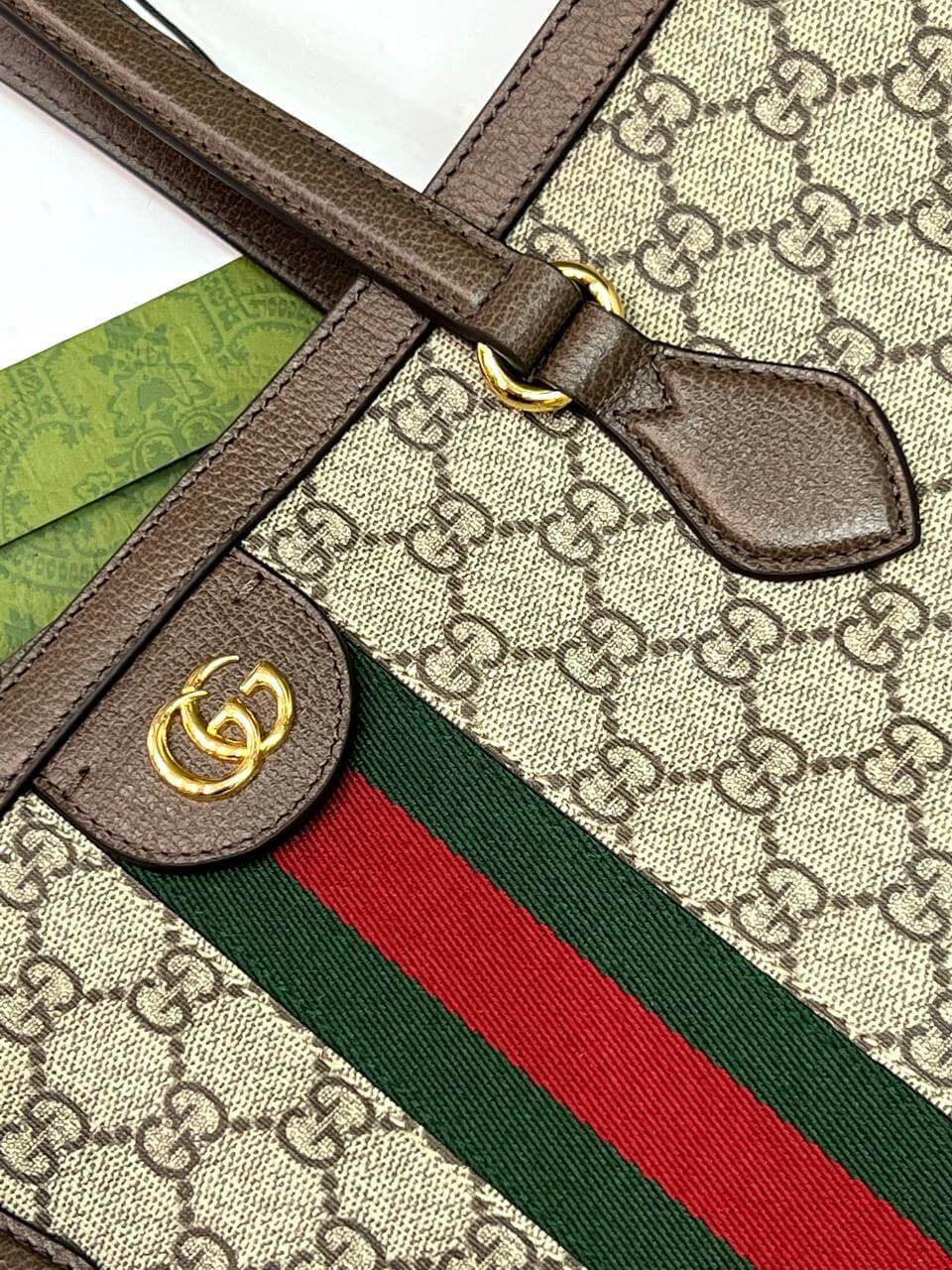 A classic combination of the House's most defining codes—the GG motif and Web stripe—the world of Ophidia continues to evolve, incorporating new shapes and silhouettes each season. With recognizable design elements in a practical new shape, this new medium sized tote is trimmed with textured leather and topped with Double G hardware. Thanks to its long leather handles, the style can also be carried as a shoulder bag.