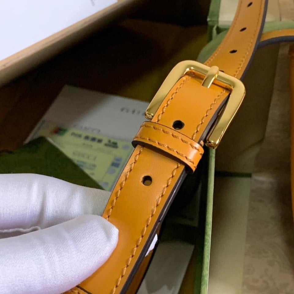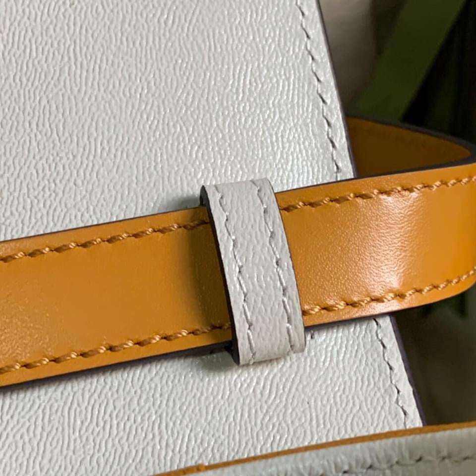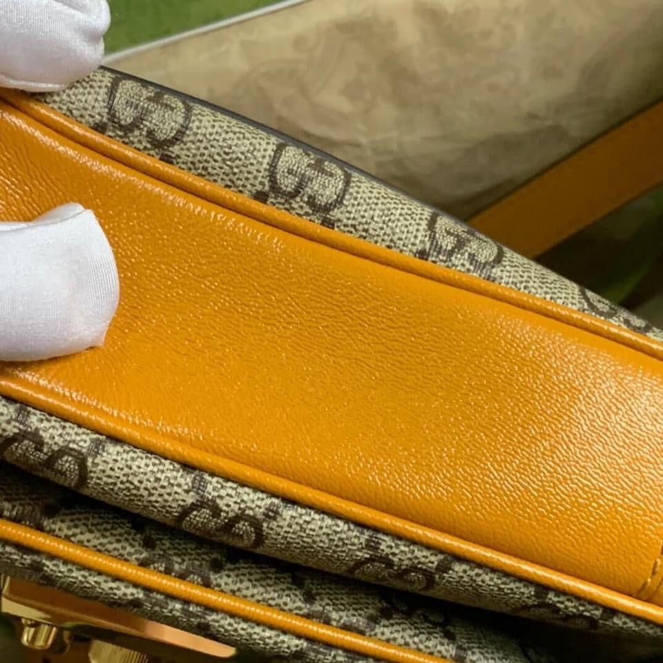 Inspired by a style from the archives, a mini version of the Padlock shoulder bag is introduced as a part of the Ouverture collection. Presented in a mix of white leather and GG Supreme canvas, the style is defined by the line's signature key lock closure. A colorful orange leather trim completes the style.
