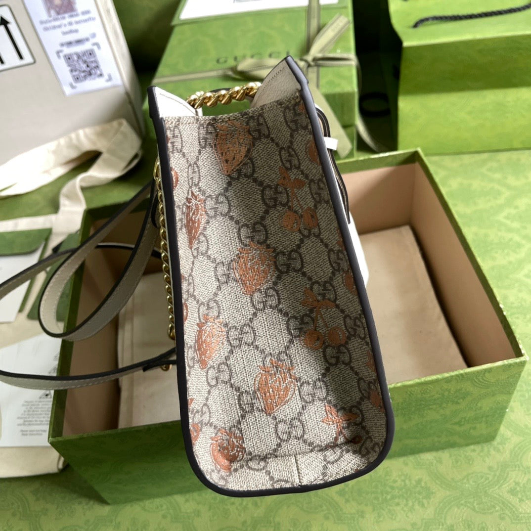 Inspired by an archival piece, the Padlock is presented with contemporary details—linking different chapters of House history together. Here, the small bag is reimagined as a tote bag while still being defined by the line's emblematic lock and key closure. A metallic cherry and strawberry print completes the design with a playful twist.