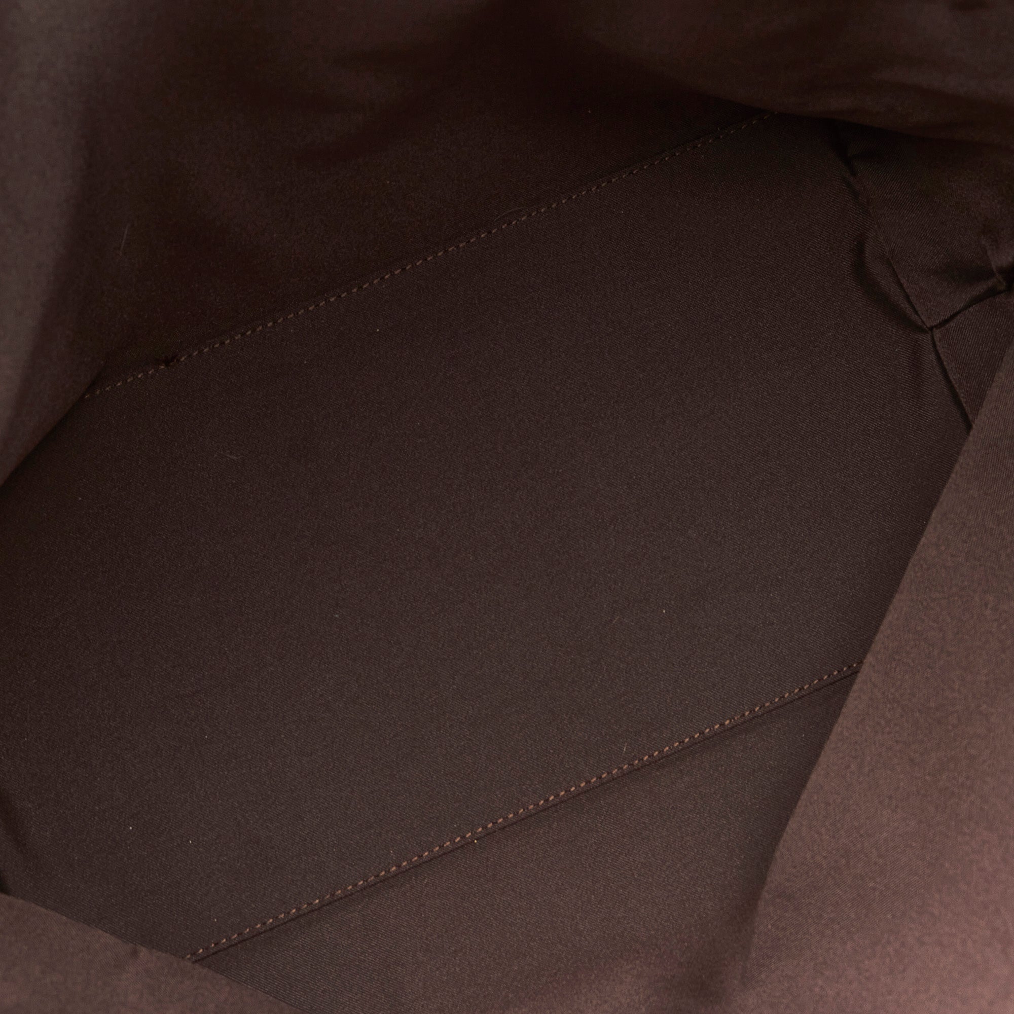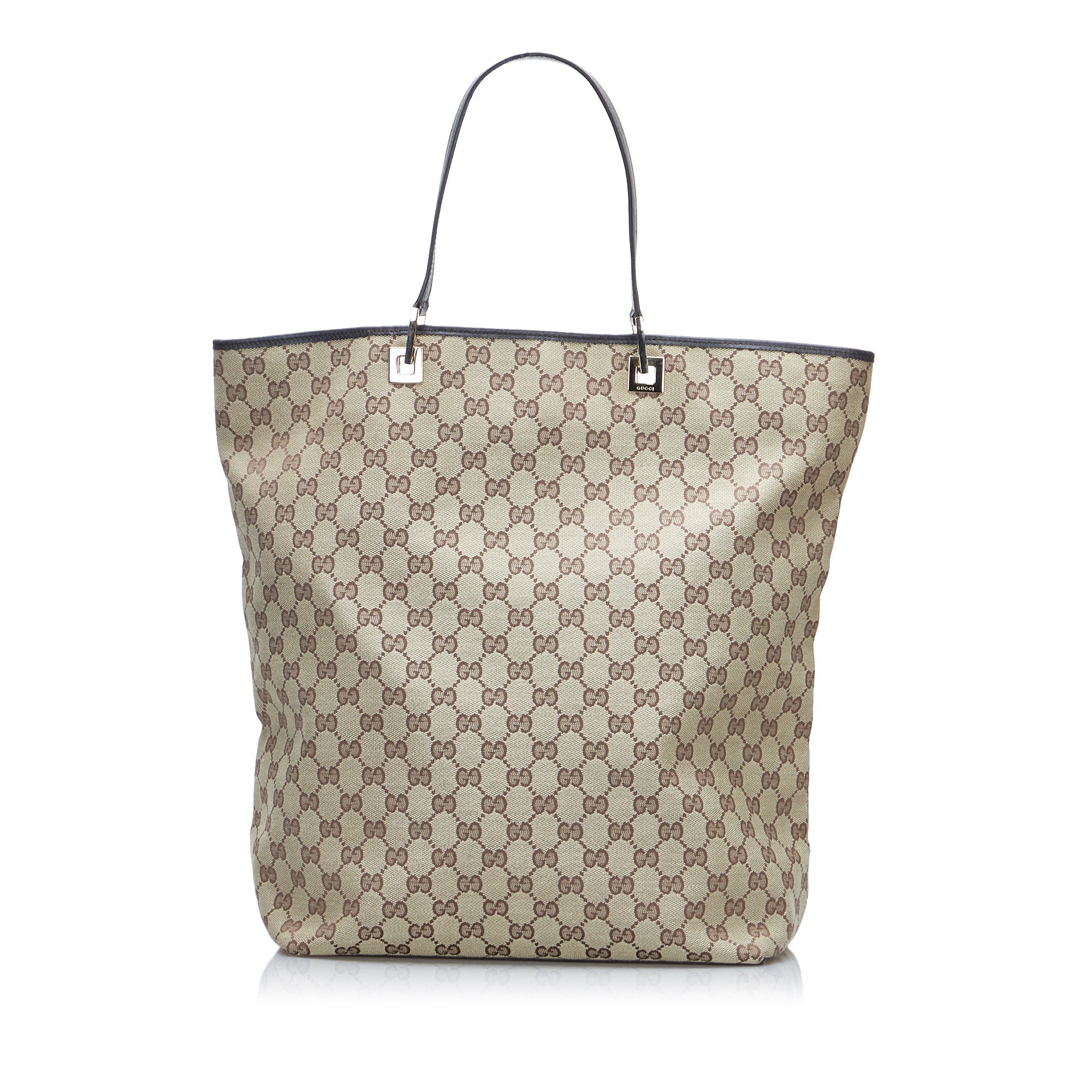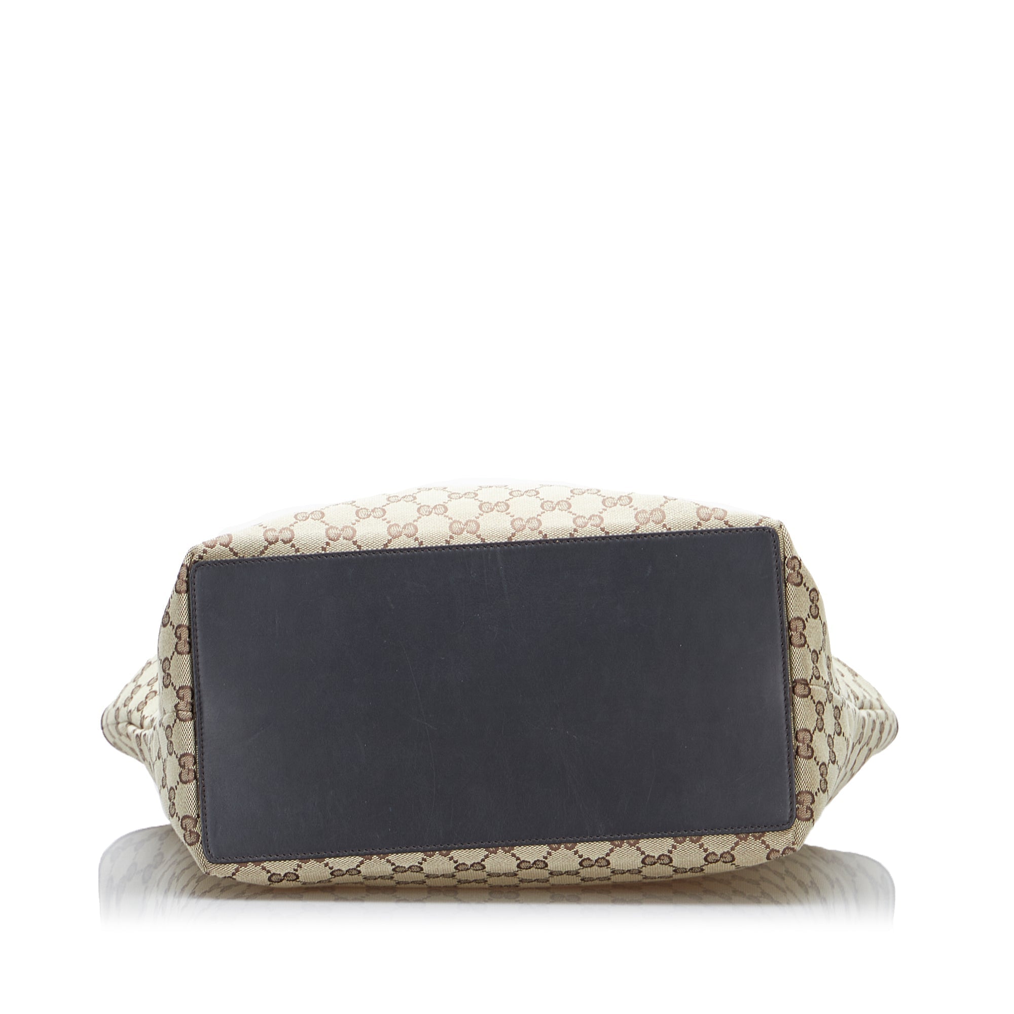 This shopper from Gucci was made of brown GG canvas. It has two flat leather handles and is carried in the hand or on the arm. It has an open top and inside it offers a zippered side compartment.