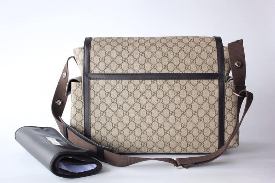 GG Supreme canvas diaper bag, designed with multiple pockets and fold-out changing mat.