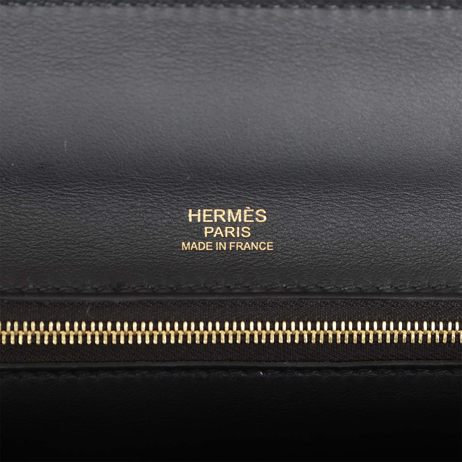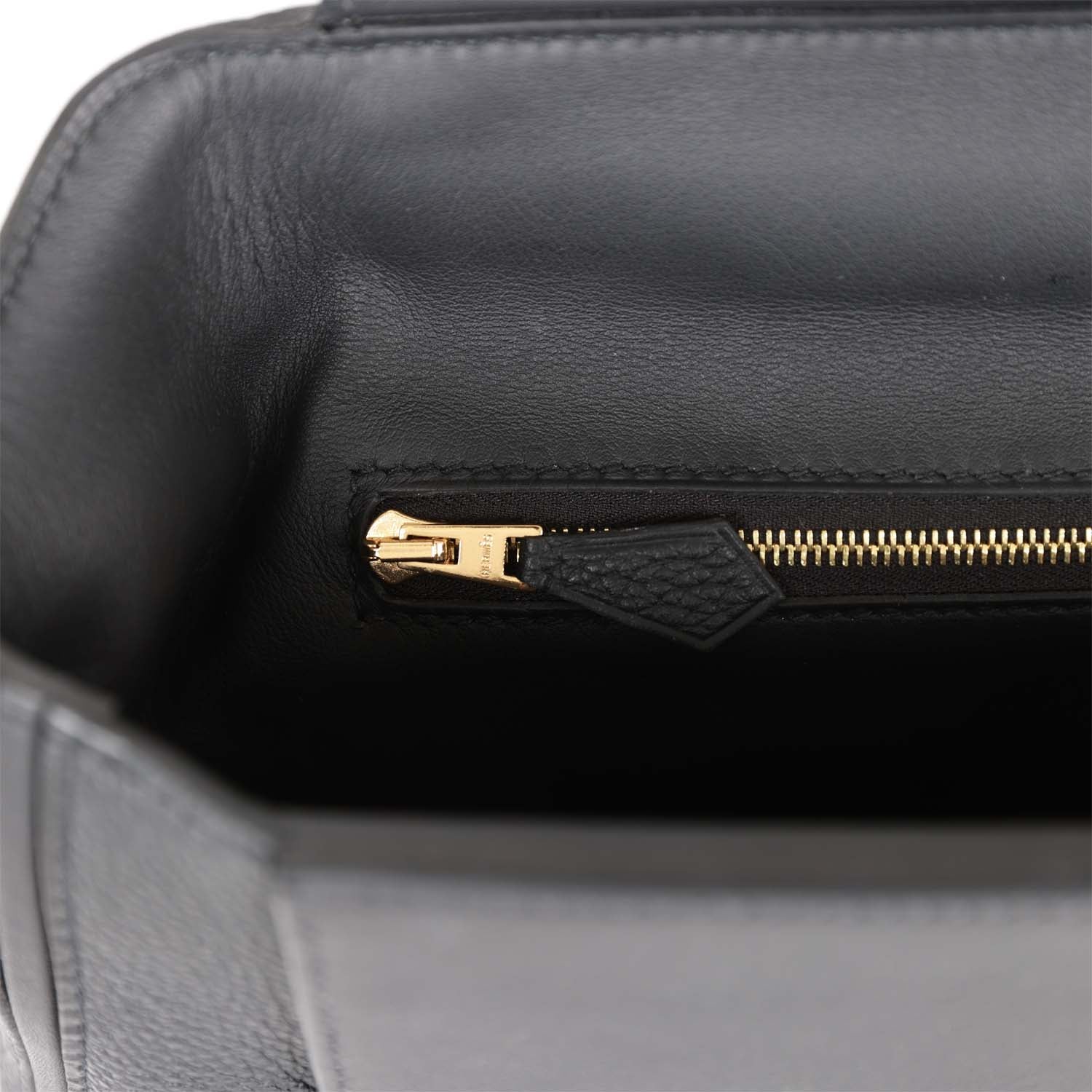 The interior is lined with black swift leather and has one zip pocket with an Hermes engraved pull on the back wall.