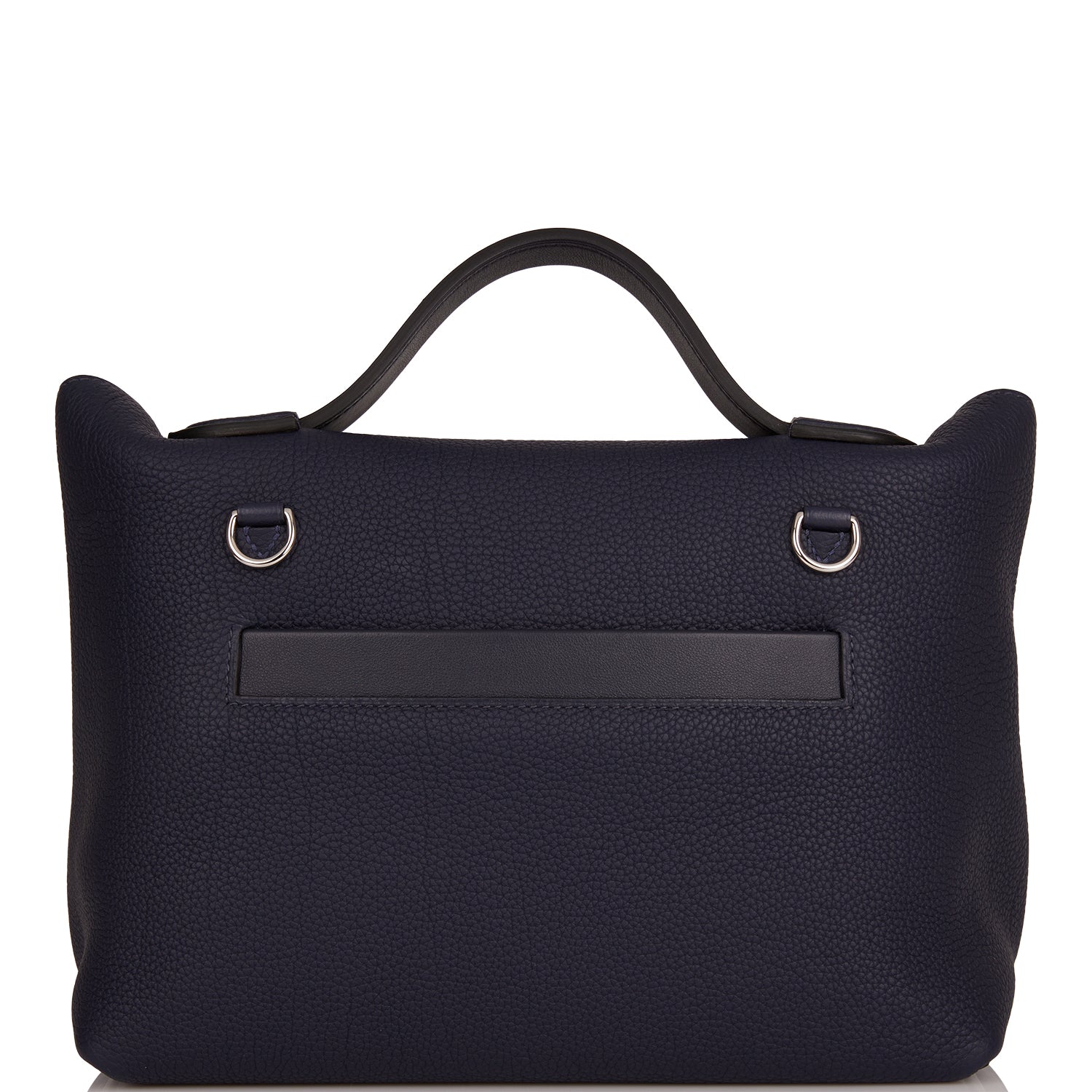 This 24/24 bag is in Bleu Nuit alligator and togo leather with palladium hardware and has tonal stitching, front turnlock closure, open rear pocket, single flap top handle and removable shoulder strap.