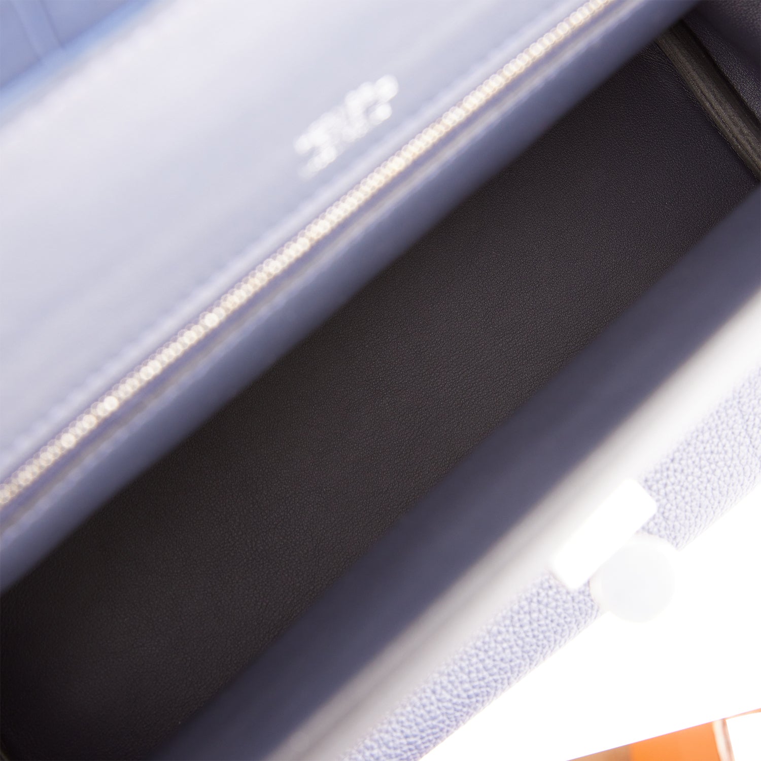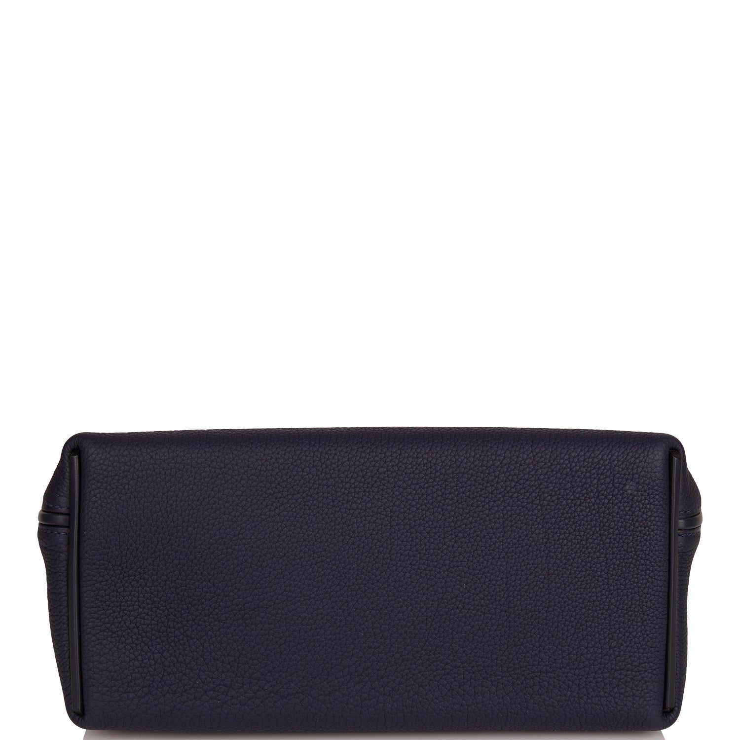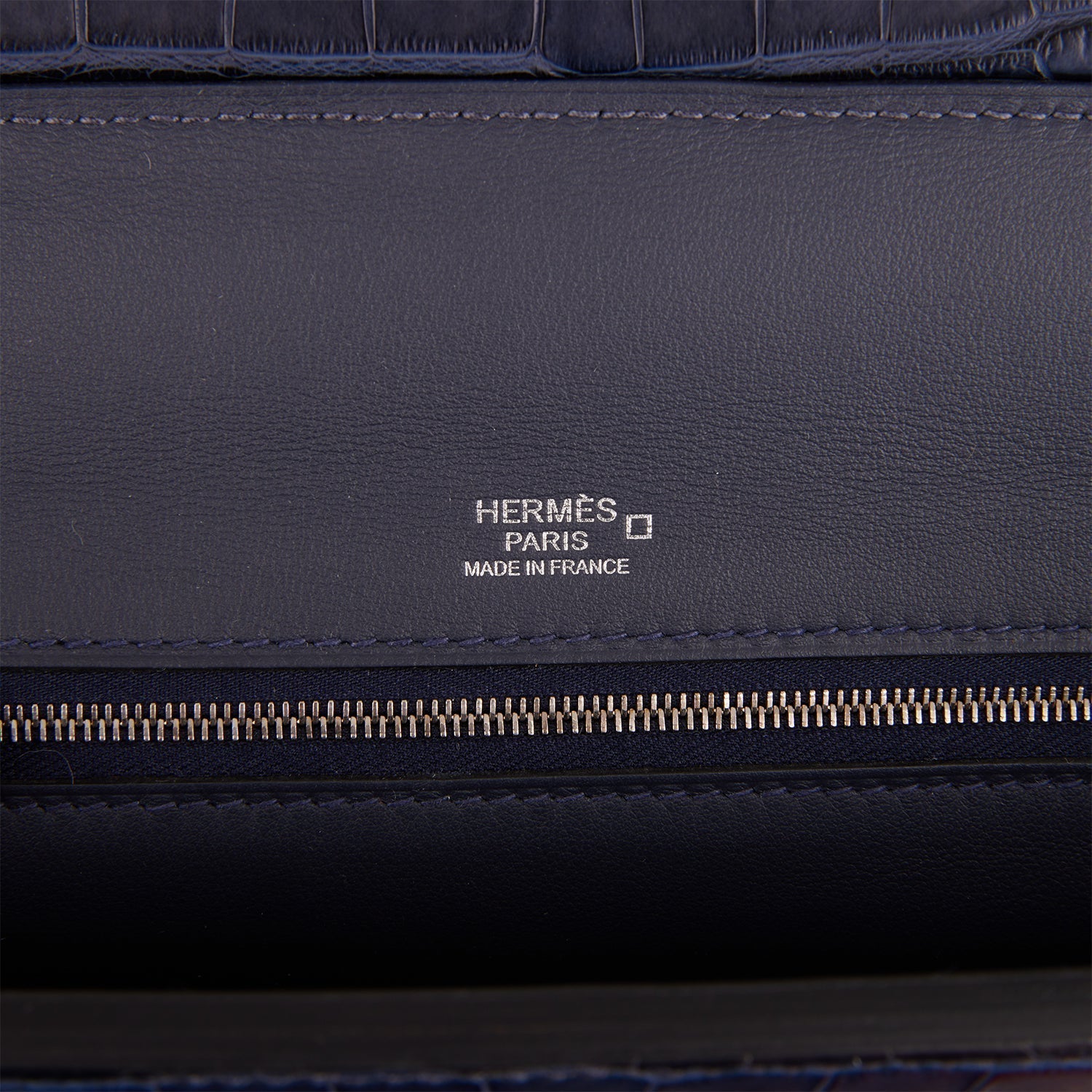 The interior is lined with Bleu Nuit swift leather and has one zip pocket with an Hermes engraved pull on the back wall.