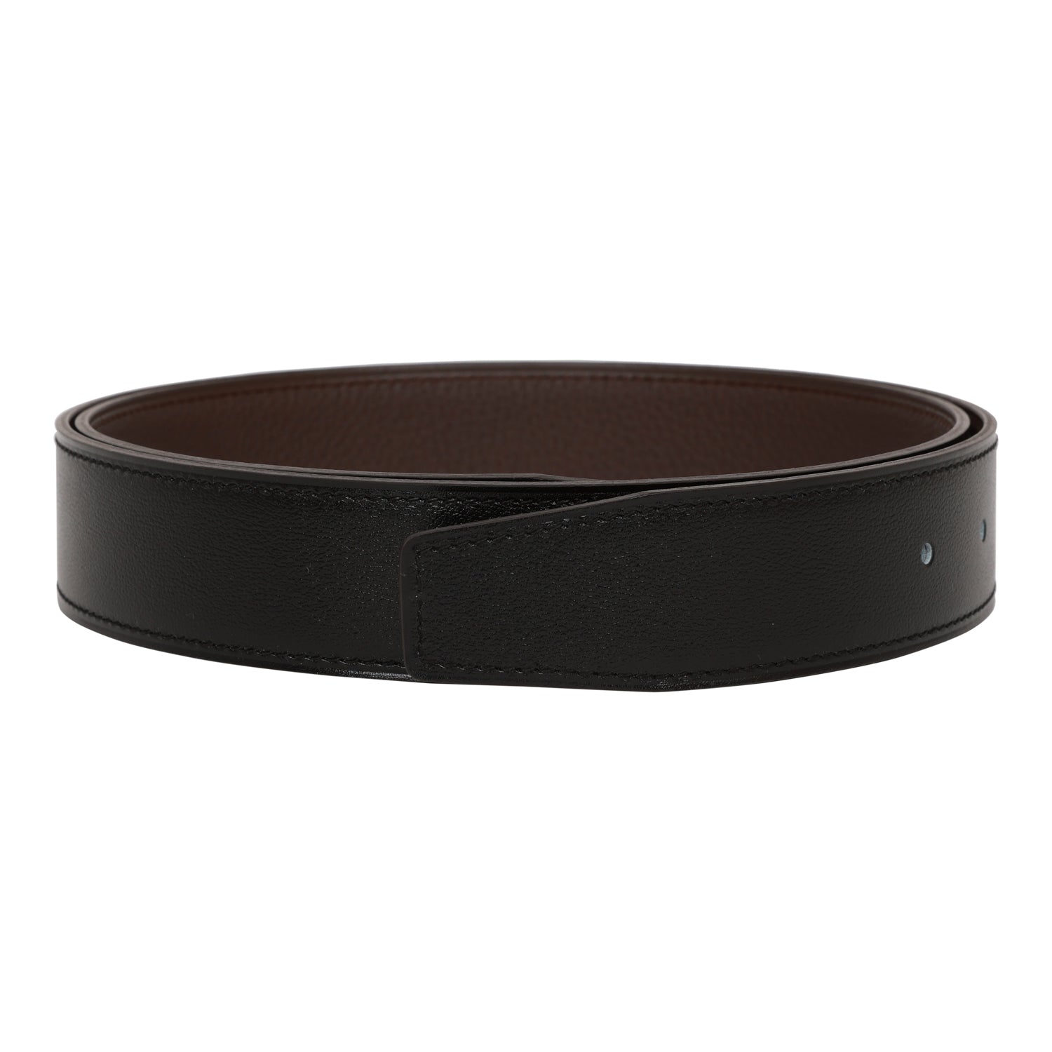 This Constance Belt kit has a wide belt strap in black calfskin leather reversing to chocolate togo leather accompanied by removable H buckle of black plated hardware.