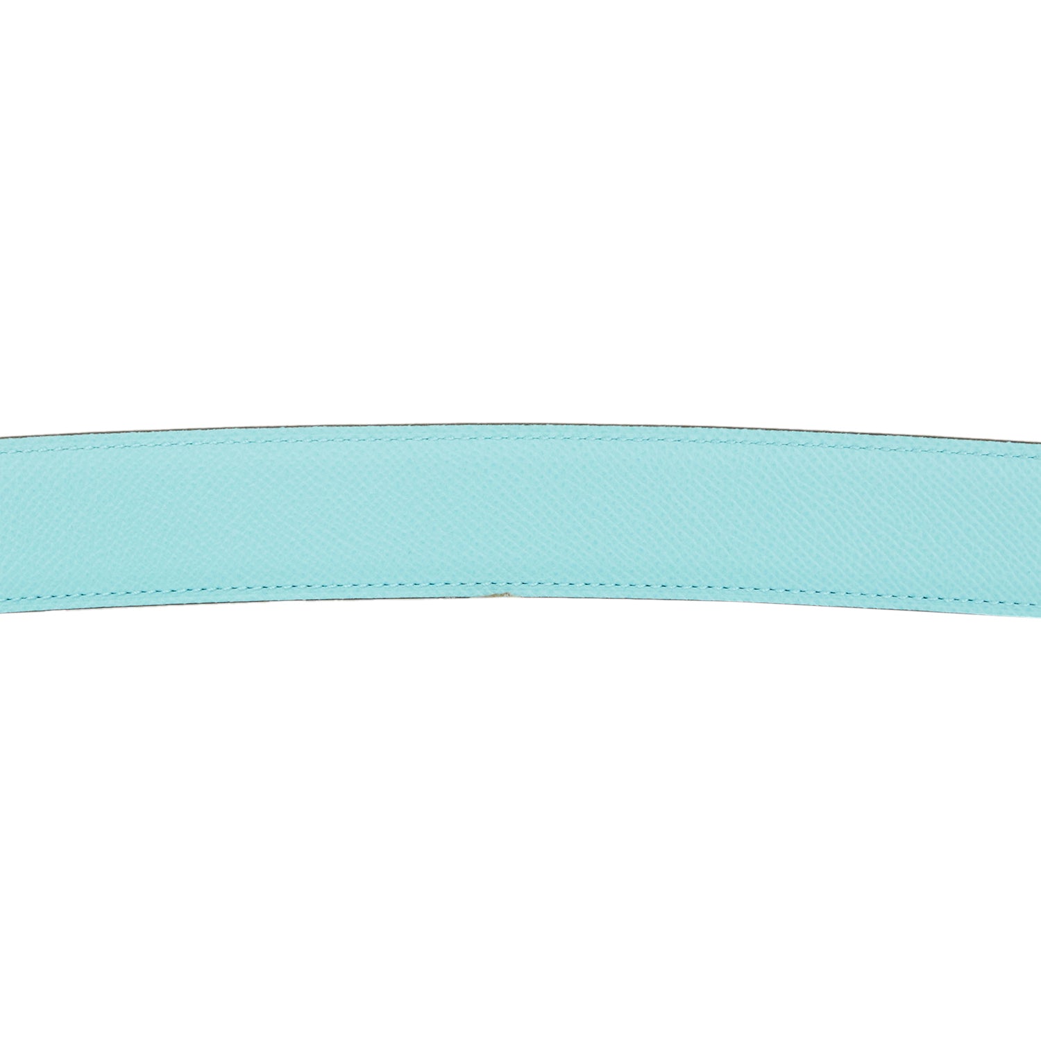 This Constance Belt kit has a wide belt strap in Bleu Indigo epsom leather reversing to Bleu Atoll epsom leather accompanied by removable H buckle of gold plated hardware.
